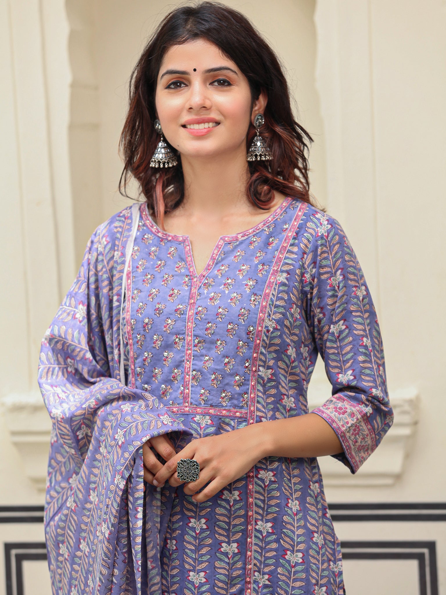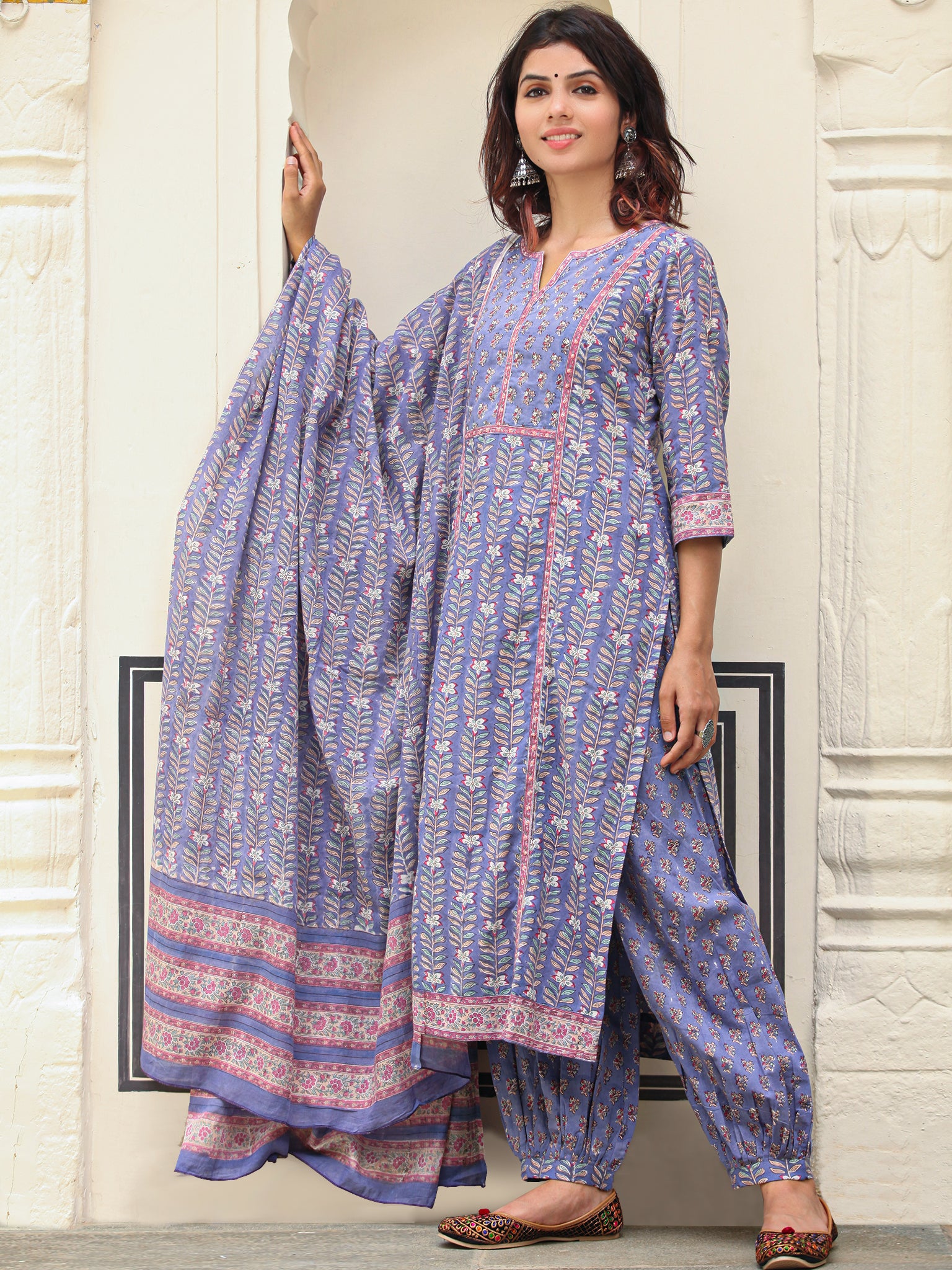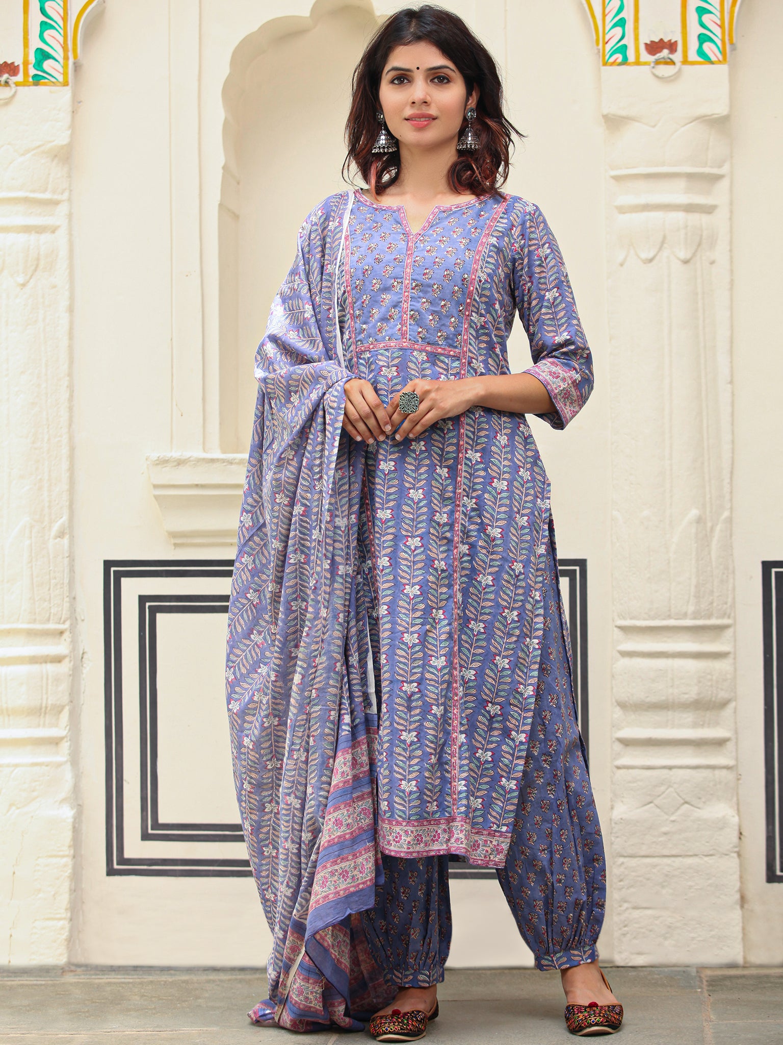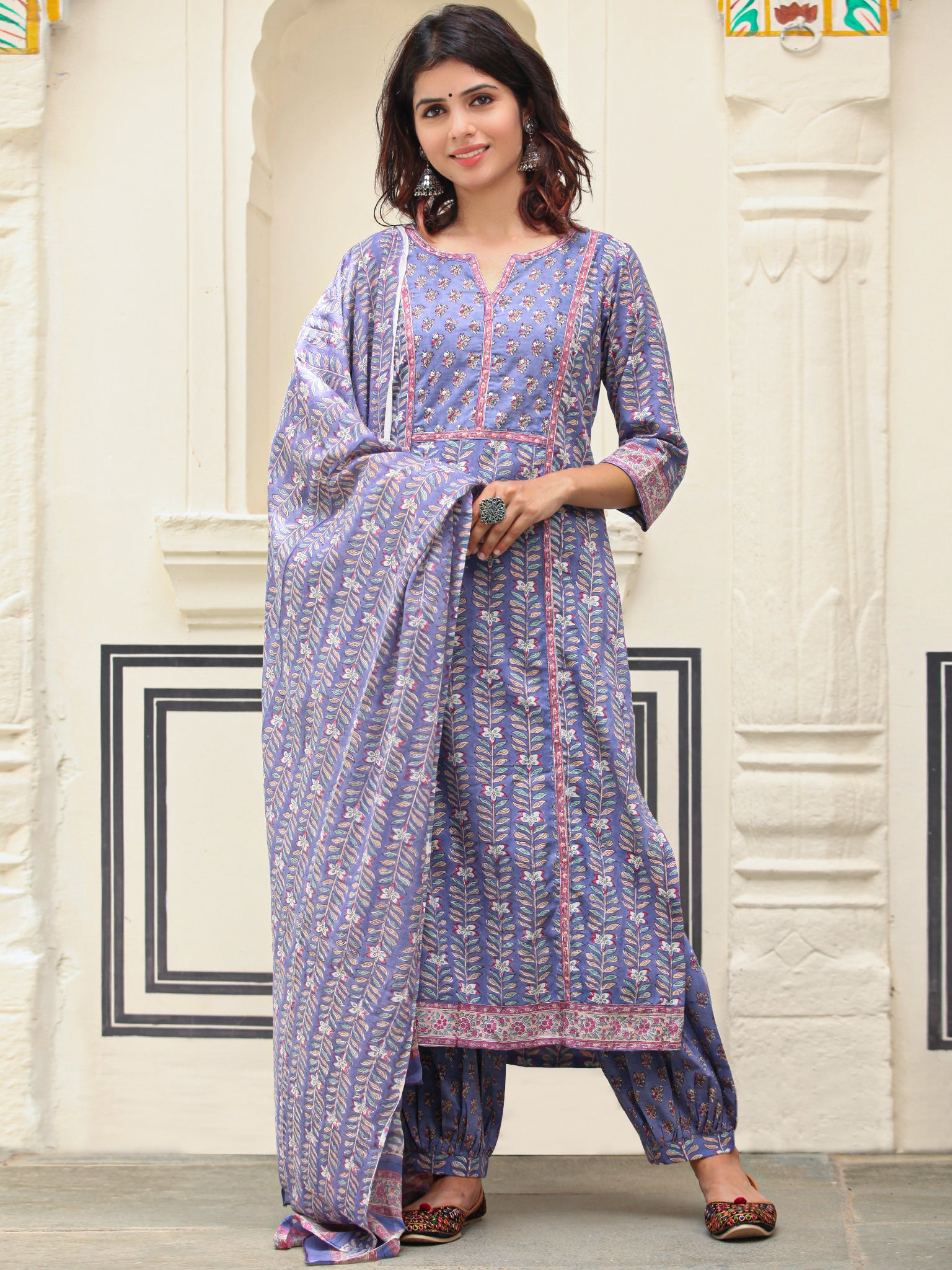 Product: This set contains Handcrafted Sanganeri Premium Cotton Kurta, 100% Cotton Salwar Pants and Cotton Dupatta.