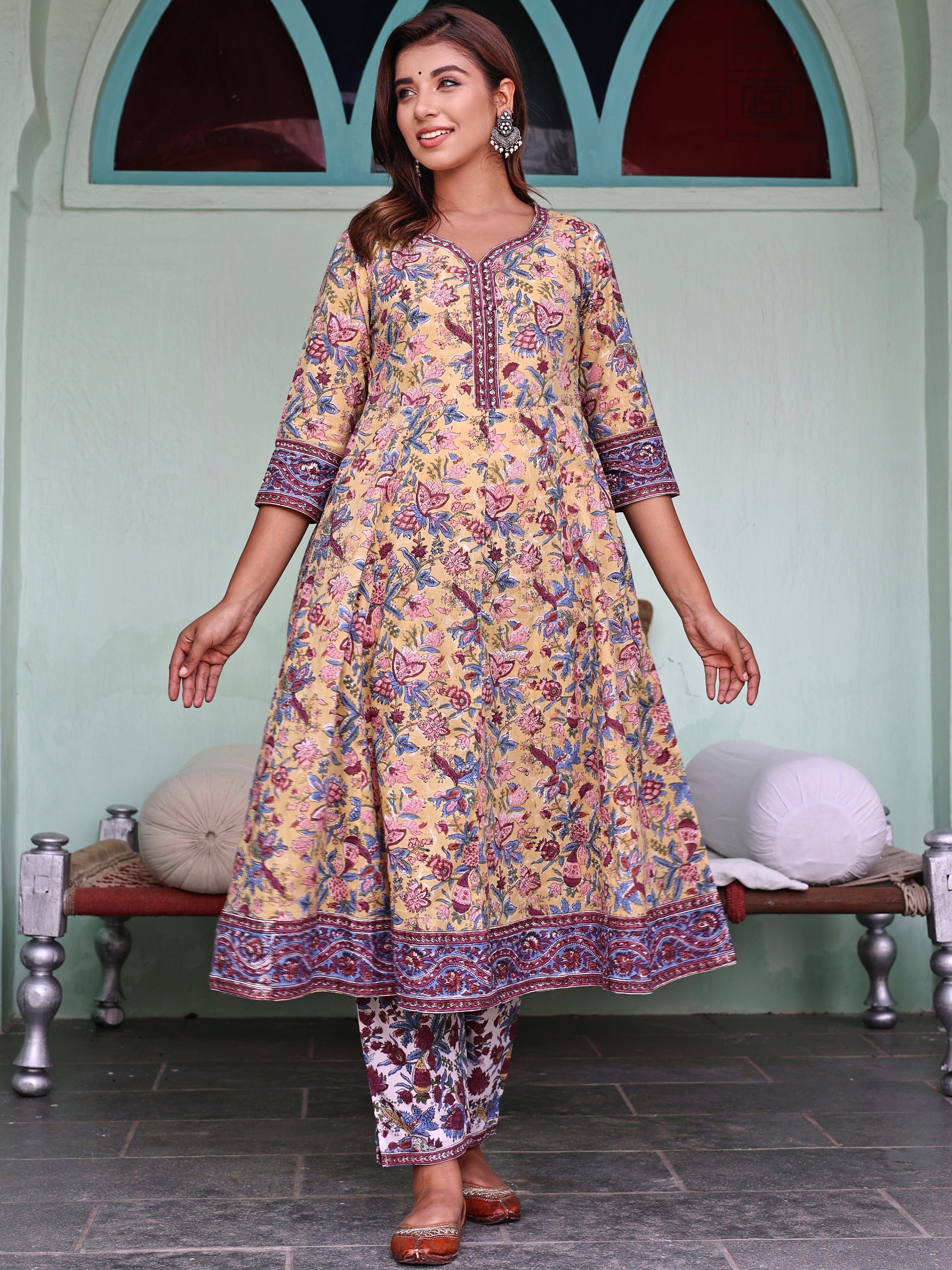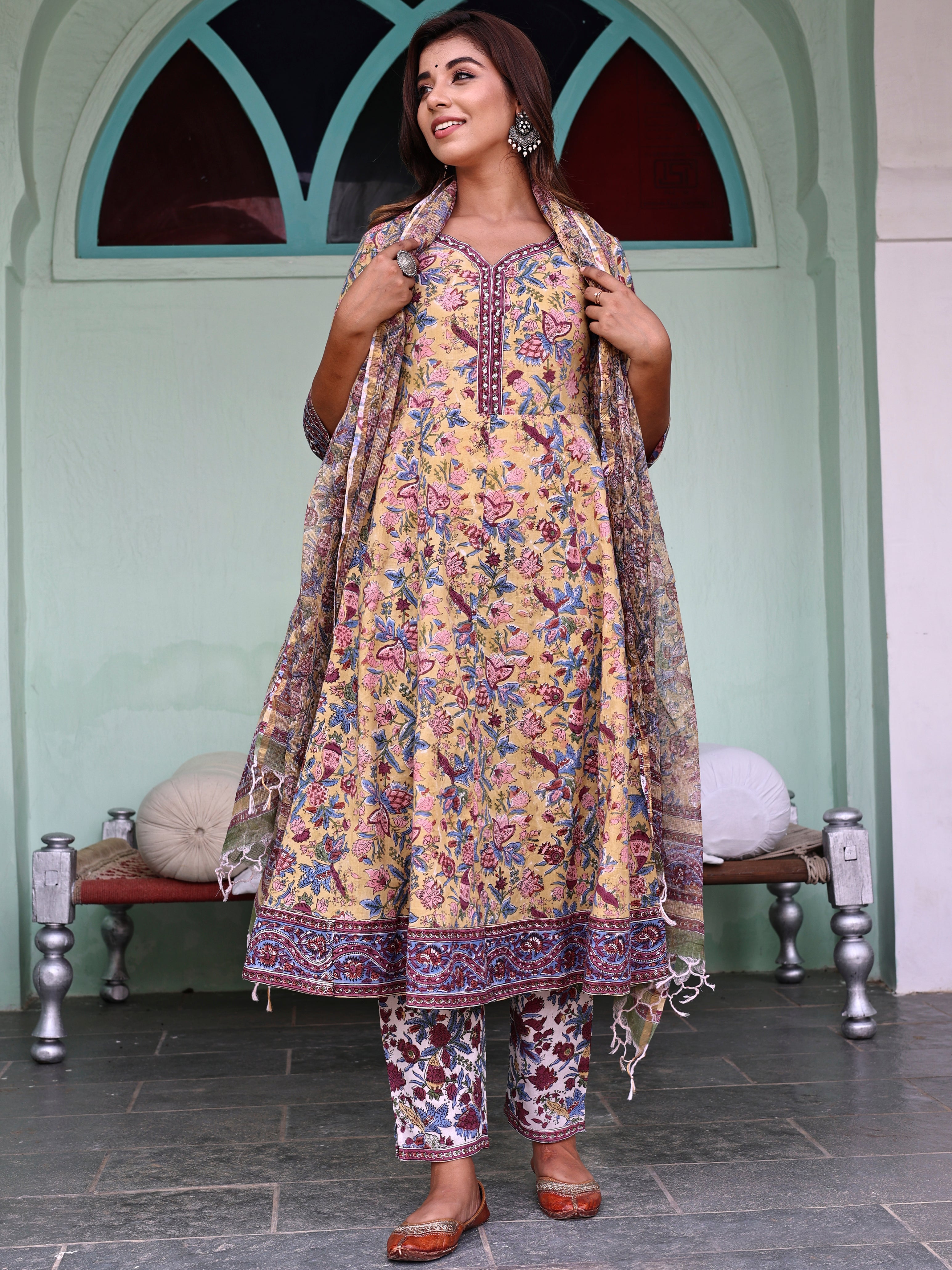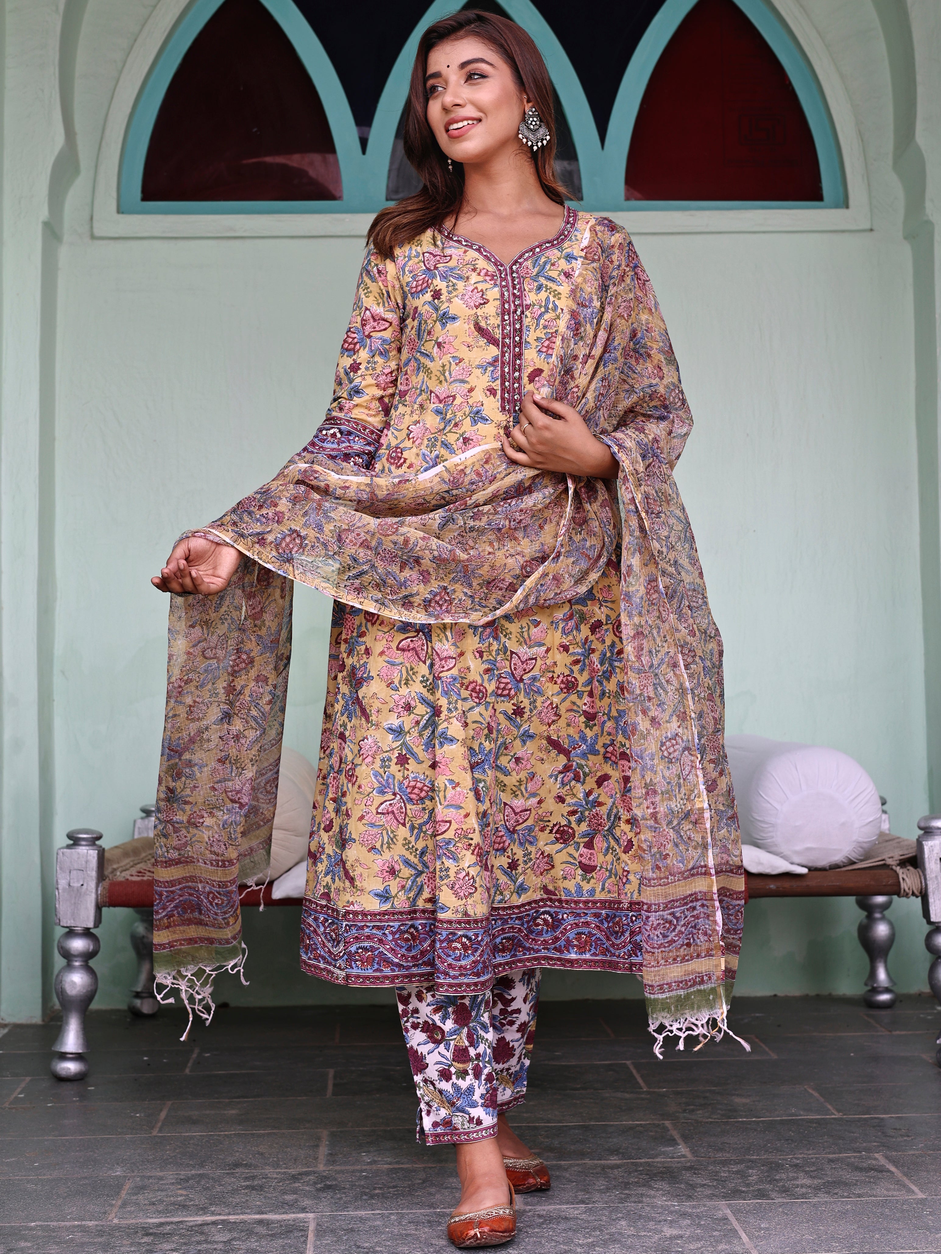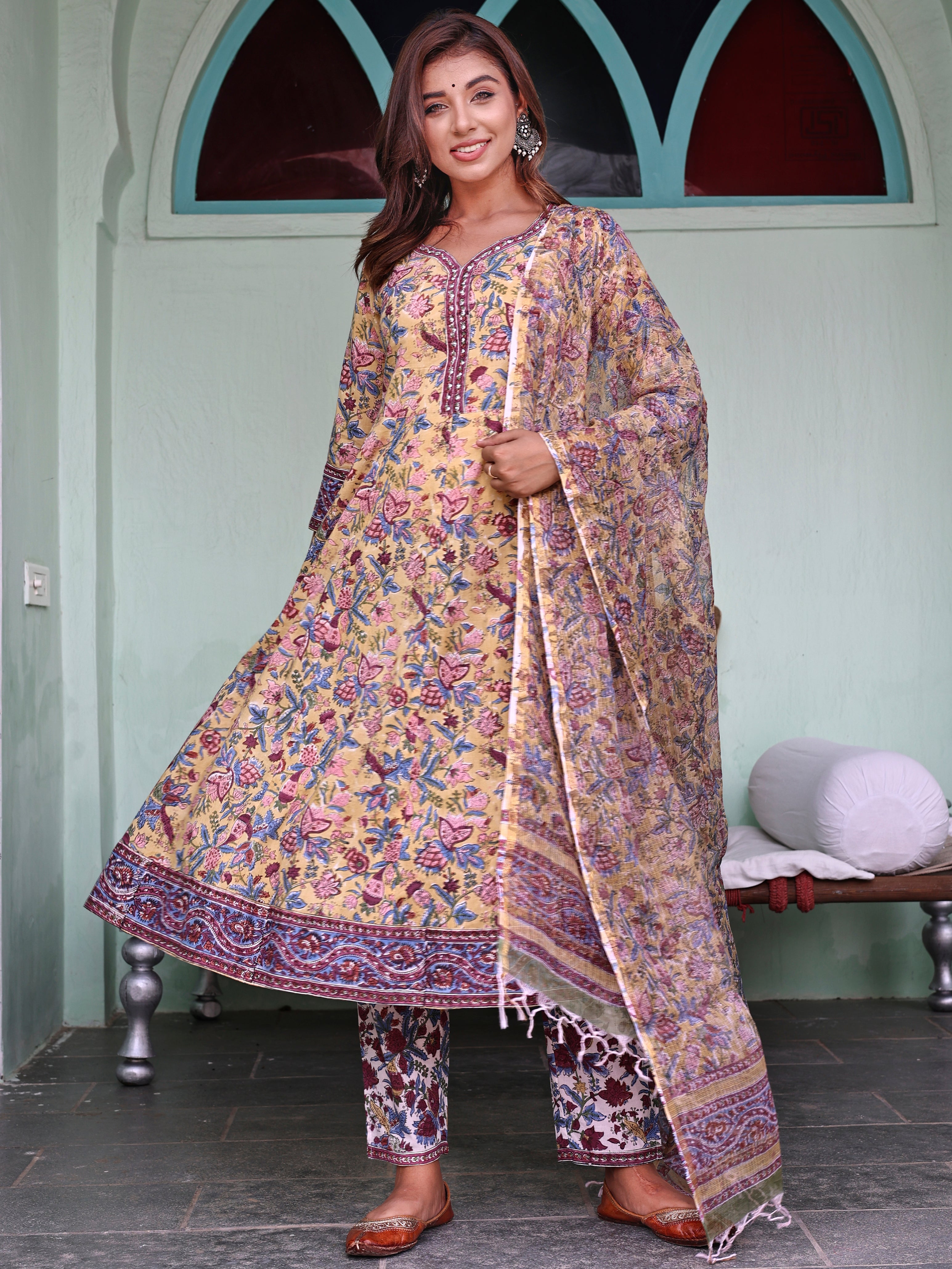 Product: This set contains Handcrafted Sanganeri Premium Cotton Kurta, 100% Cotton Pants and Kota Doria Dupatta.