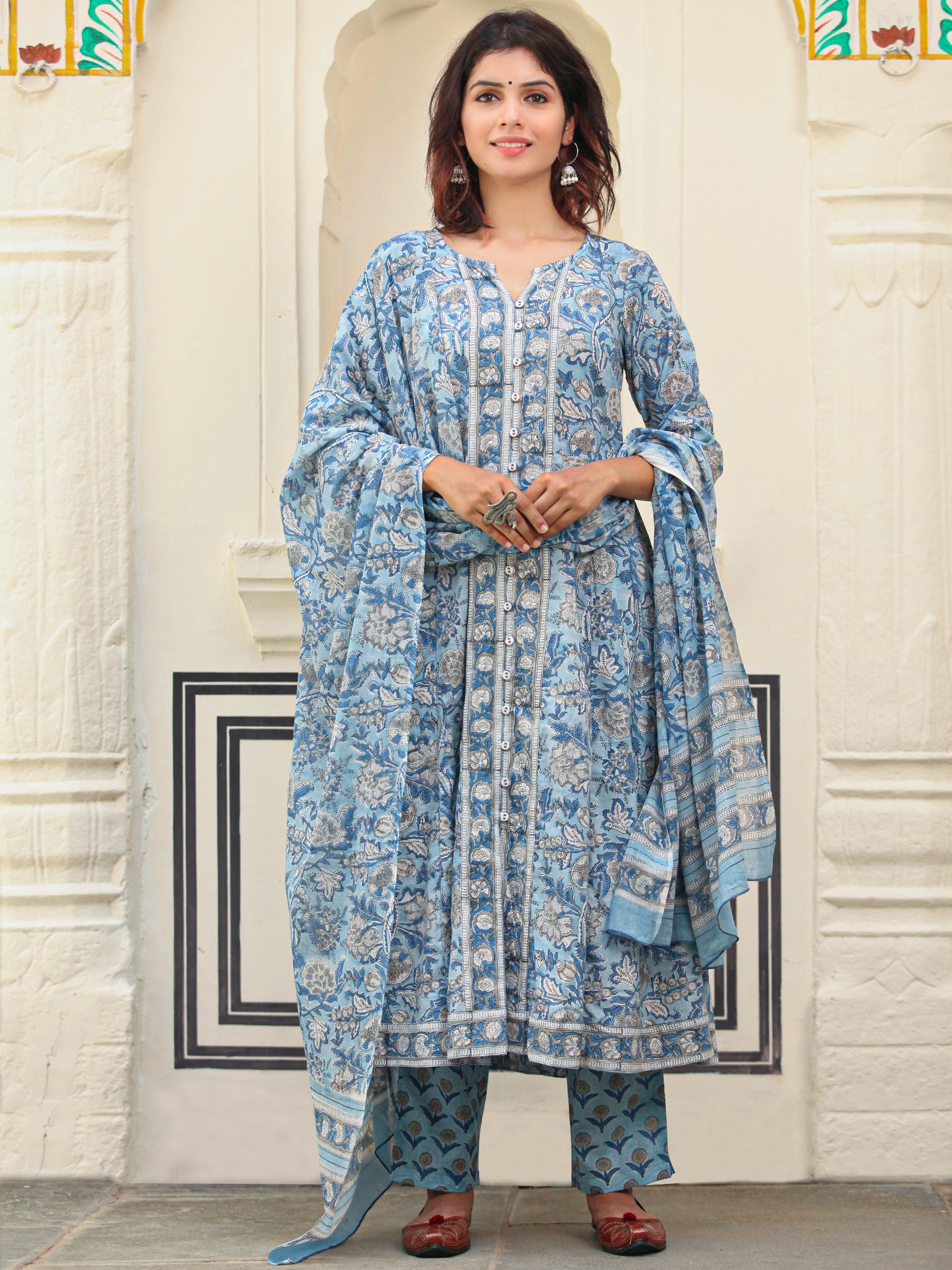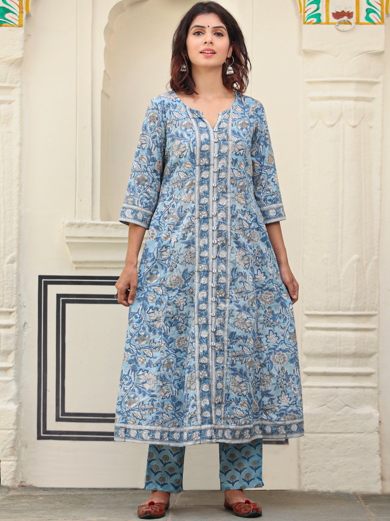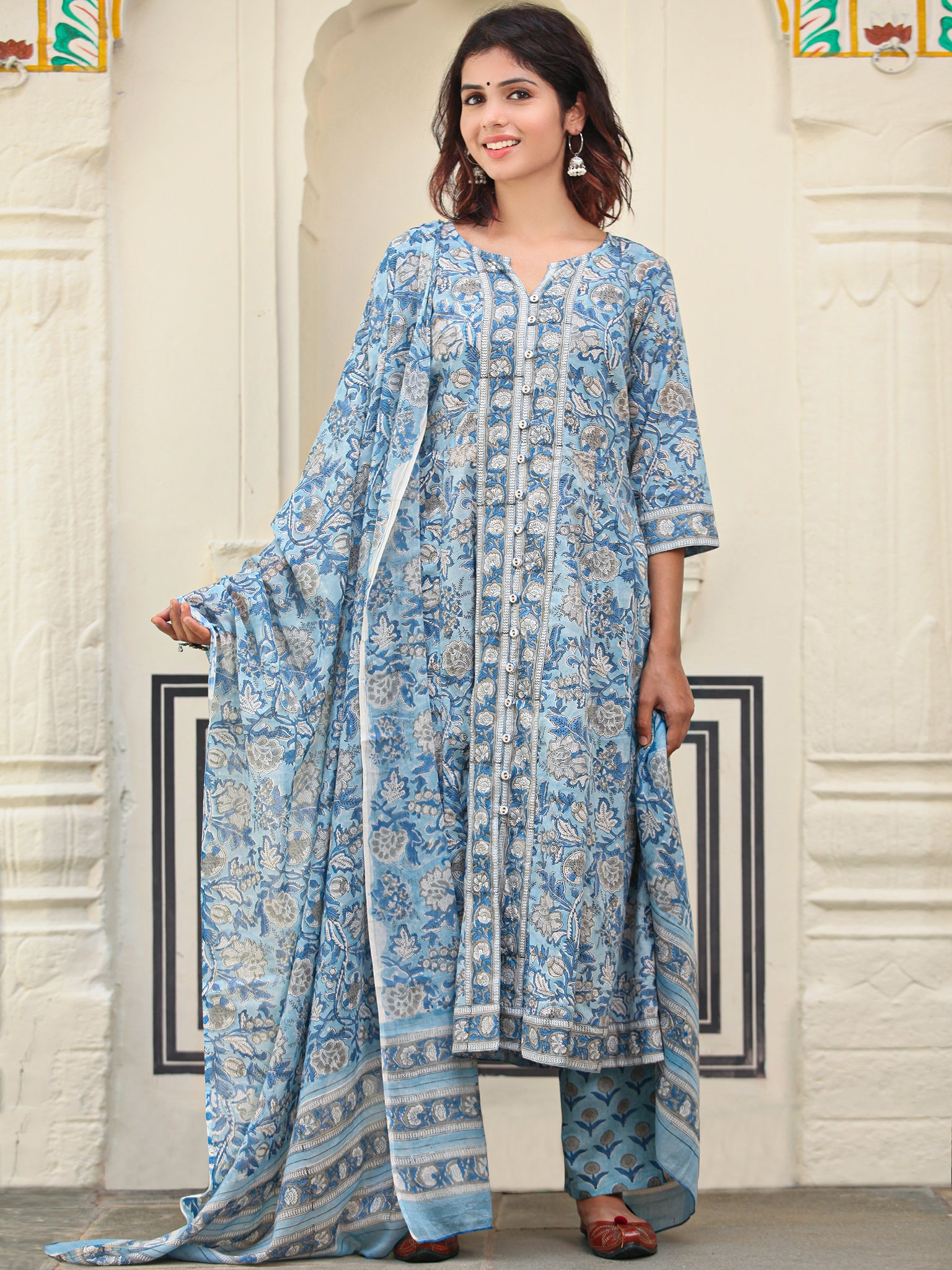 Product: This set contains Handcrafted Sanganeri Premium Cotton Kurta, 100% Cotton Salwar Pants and Cotton Dupatta.
