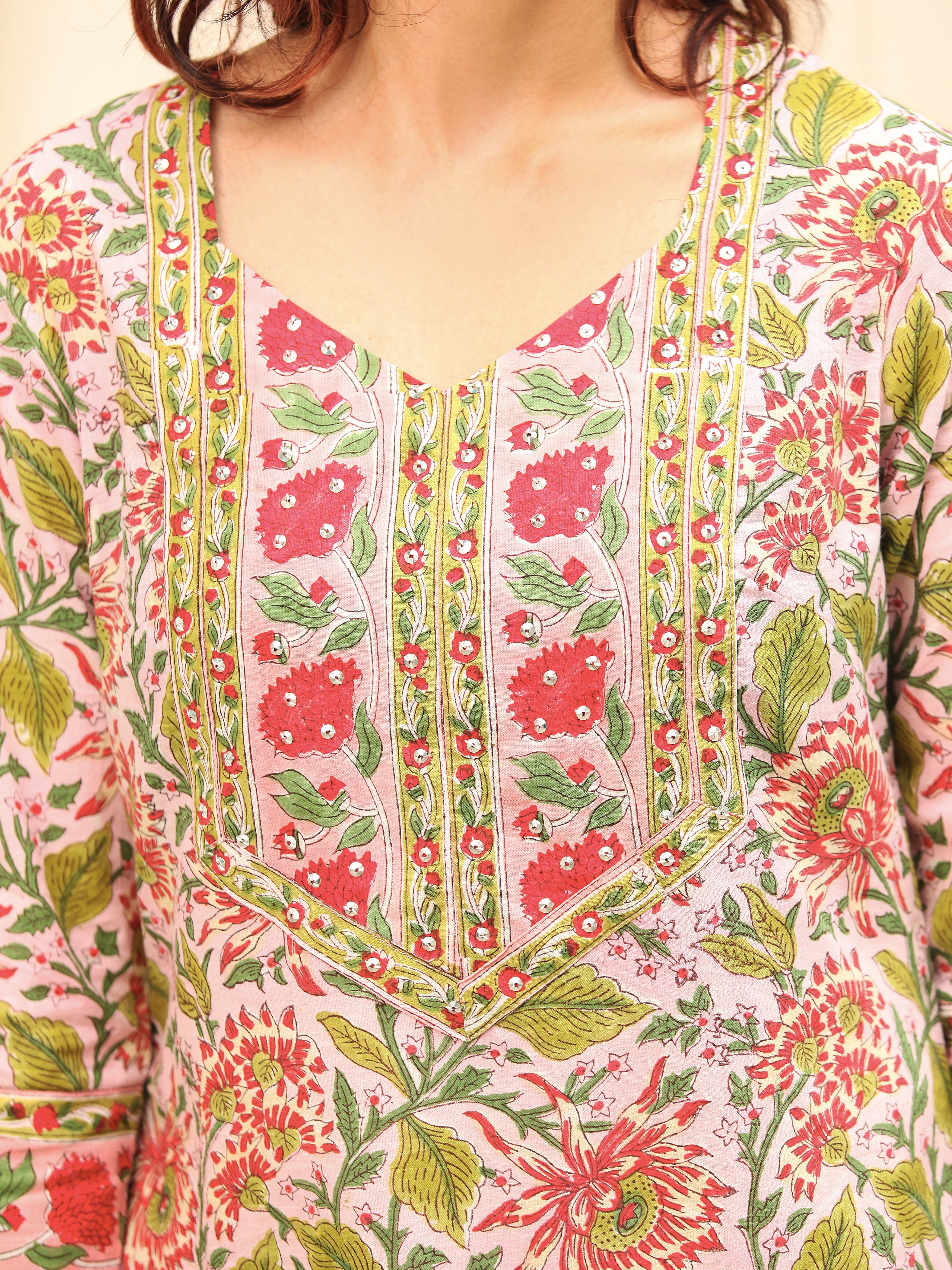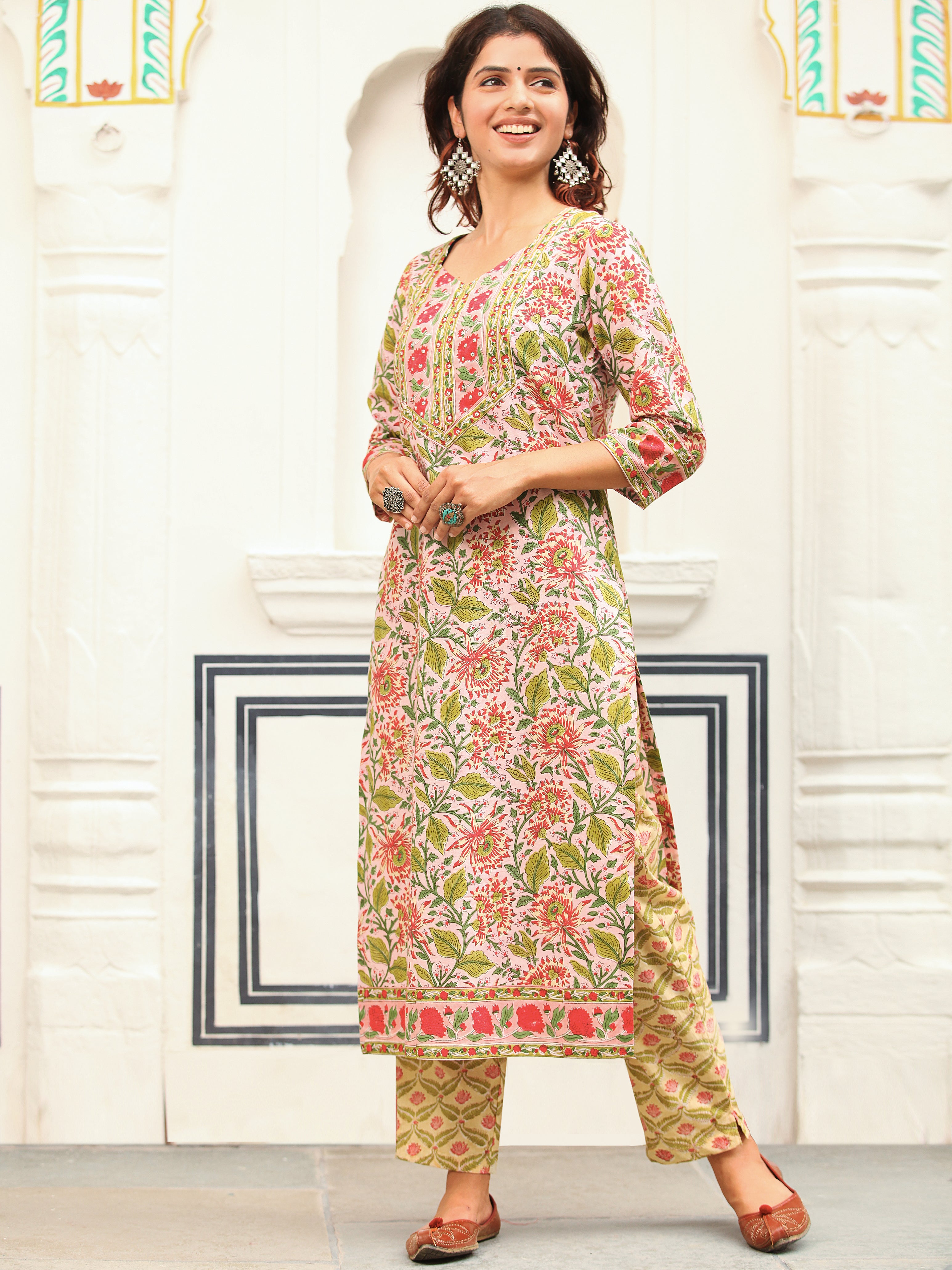 Product: This set contains Handcrafted Sanganeri Premium Cotton Kurta, 100% Cotton Pants and Cotton Dupatta.