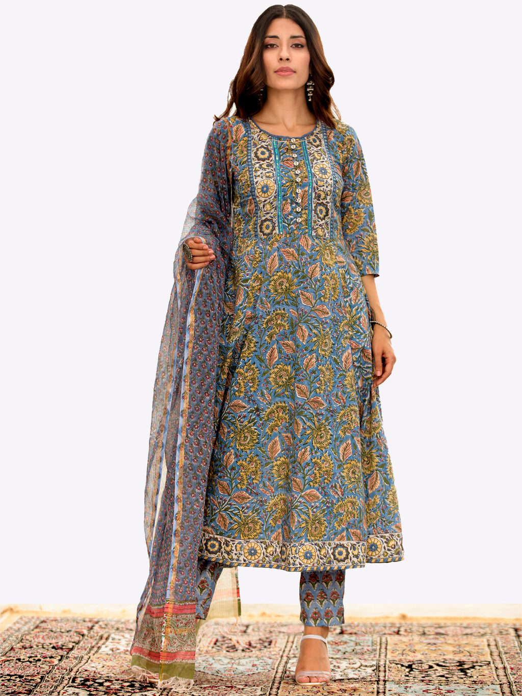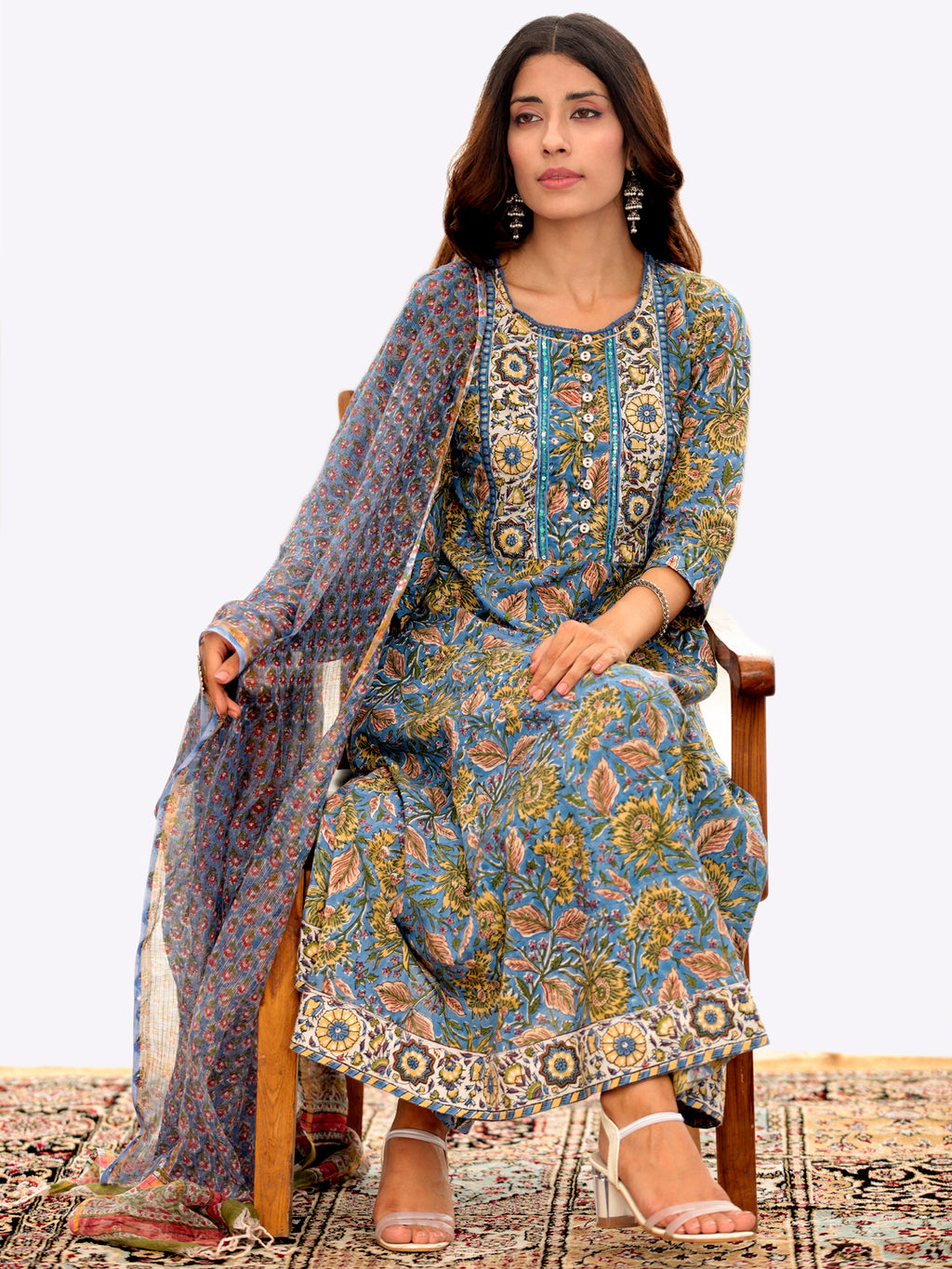 Product: This set contains Handcrafted Sanganeri Premium Cotton Kurta, 100% Cotton Pants and Kota Doria Dupatta.
