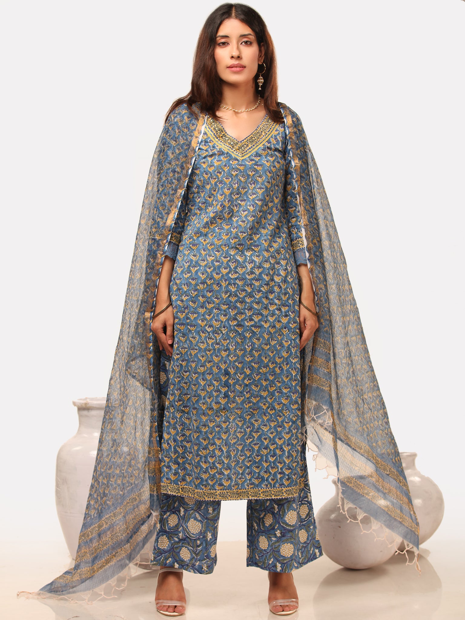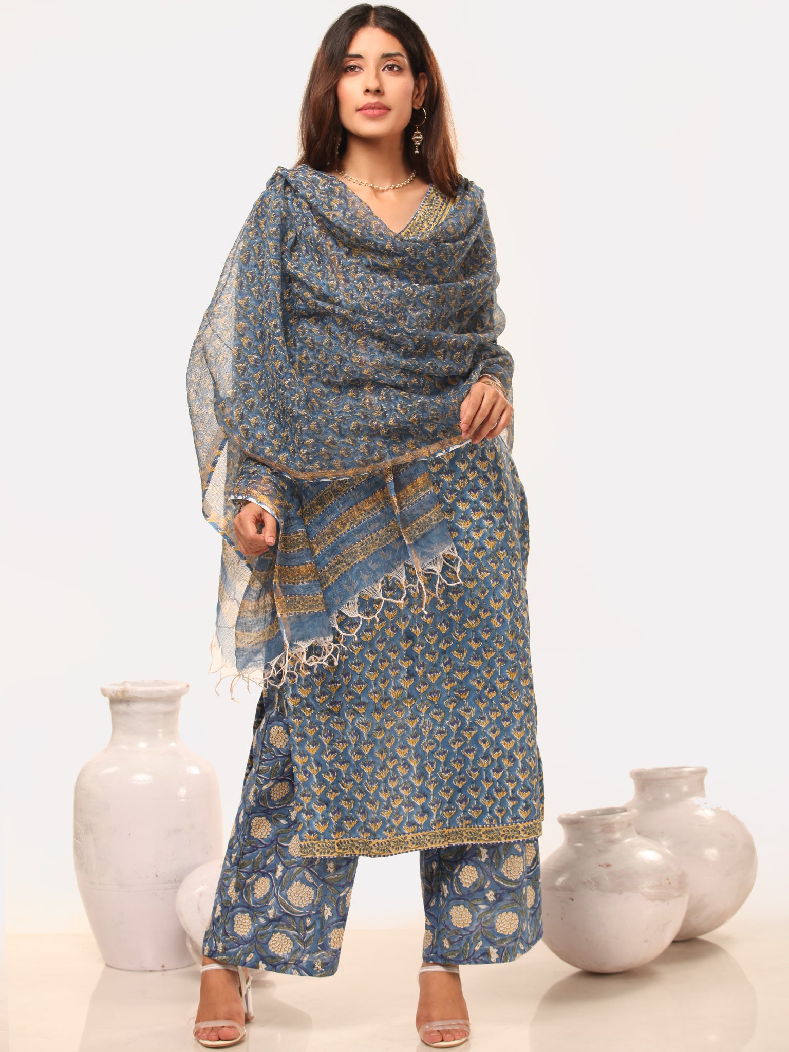 Fabric : Hand Block Printed. Kurta - Cotton. Pants - Cotton, Dupatta - Kota Doria