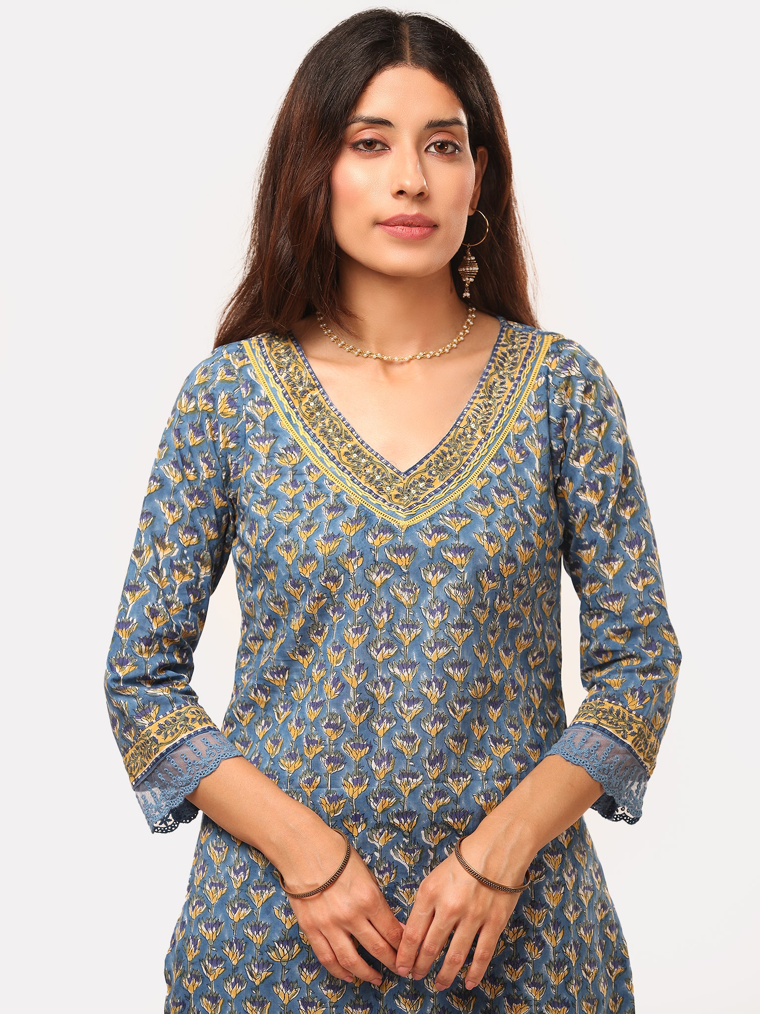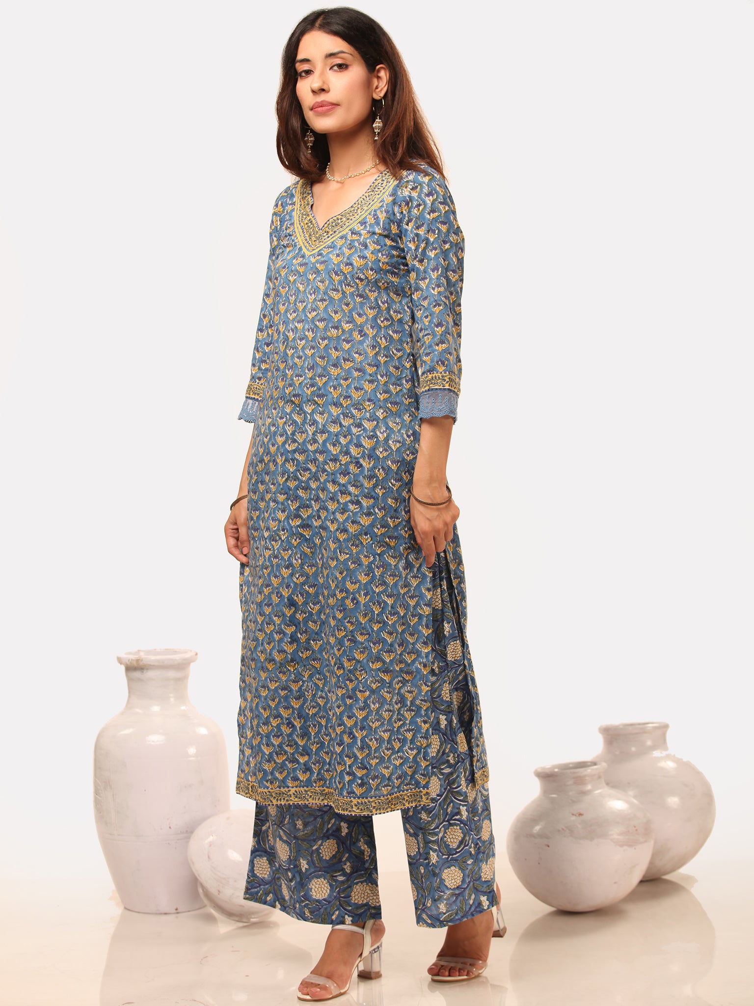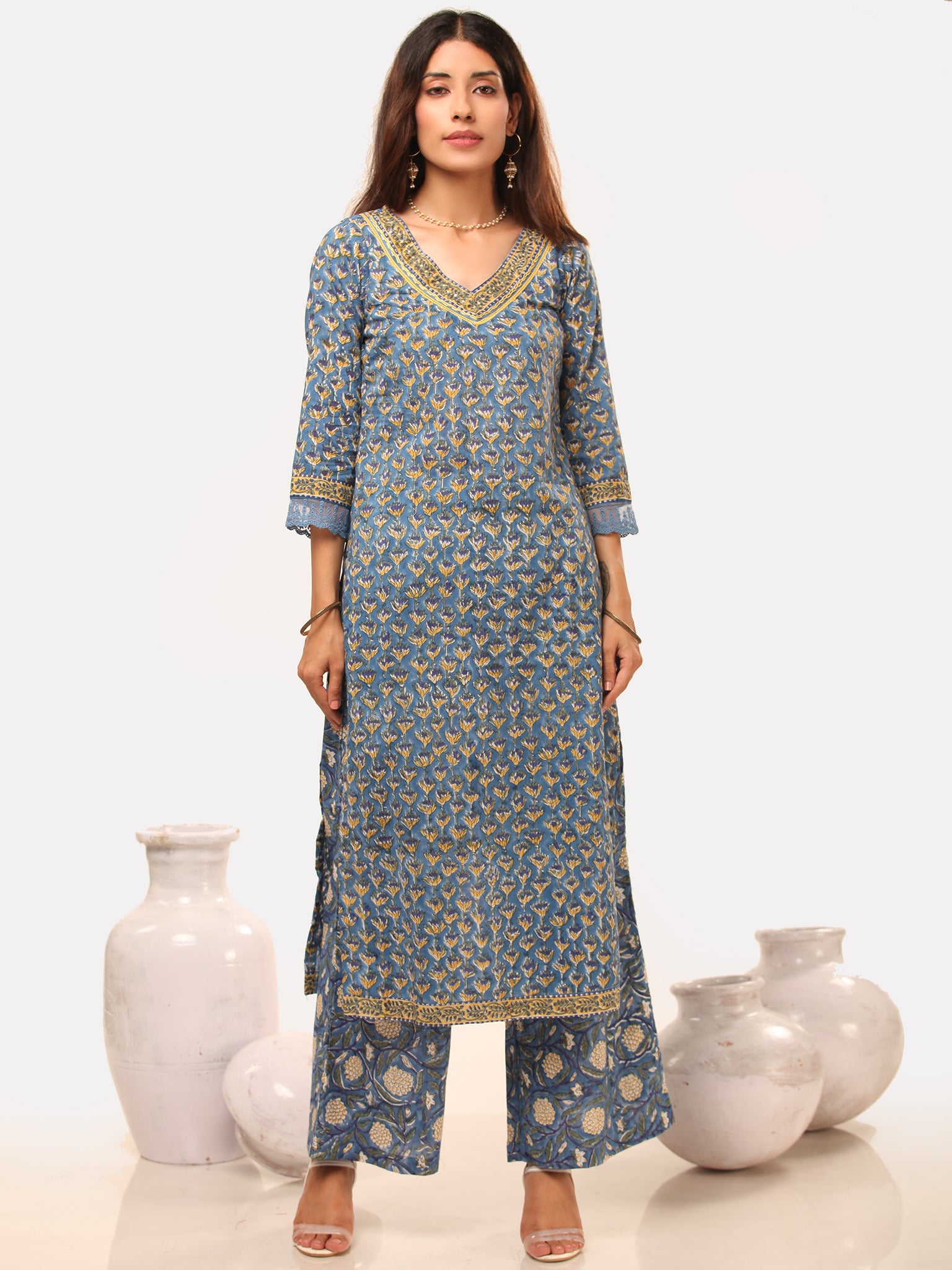 Product: This set contains Handcrafted Sanganeri Premium Cotton Kurta, 100% Cotton Pants and Kota Doria Dupatta.