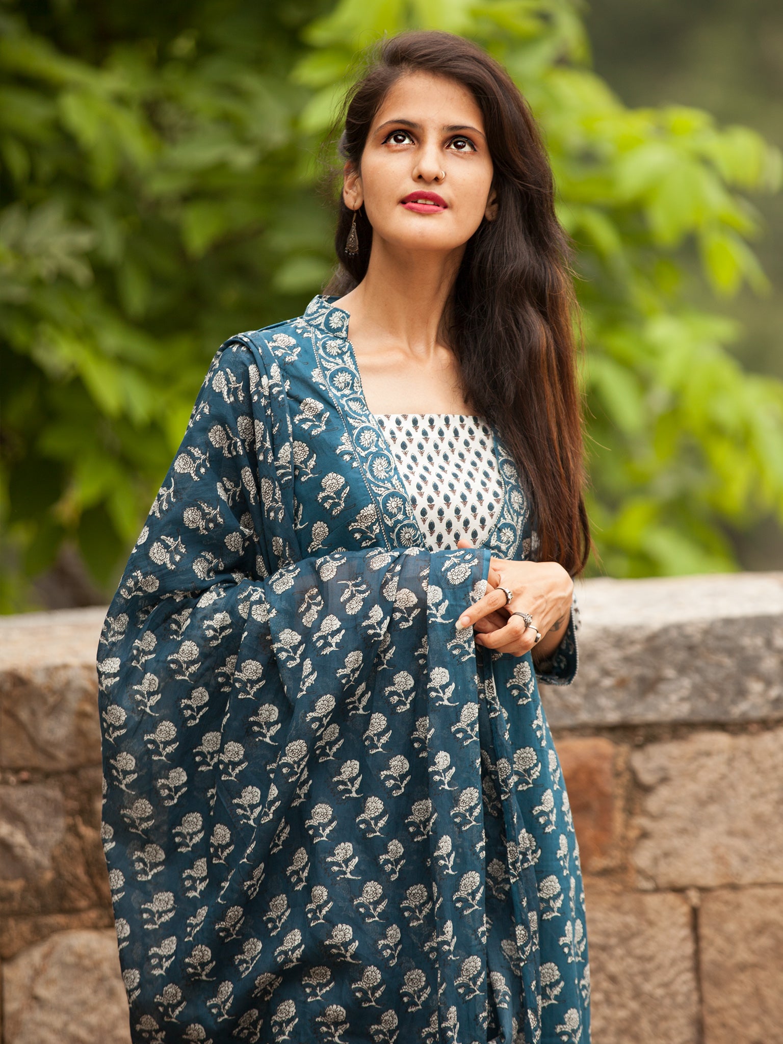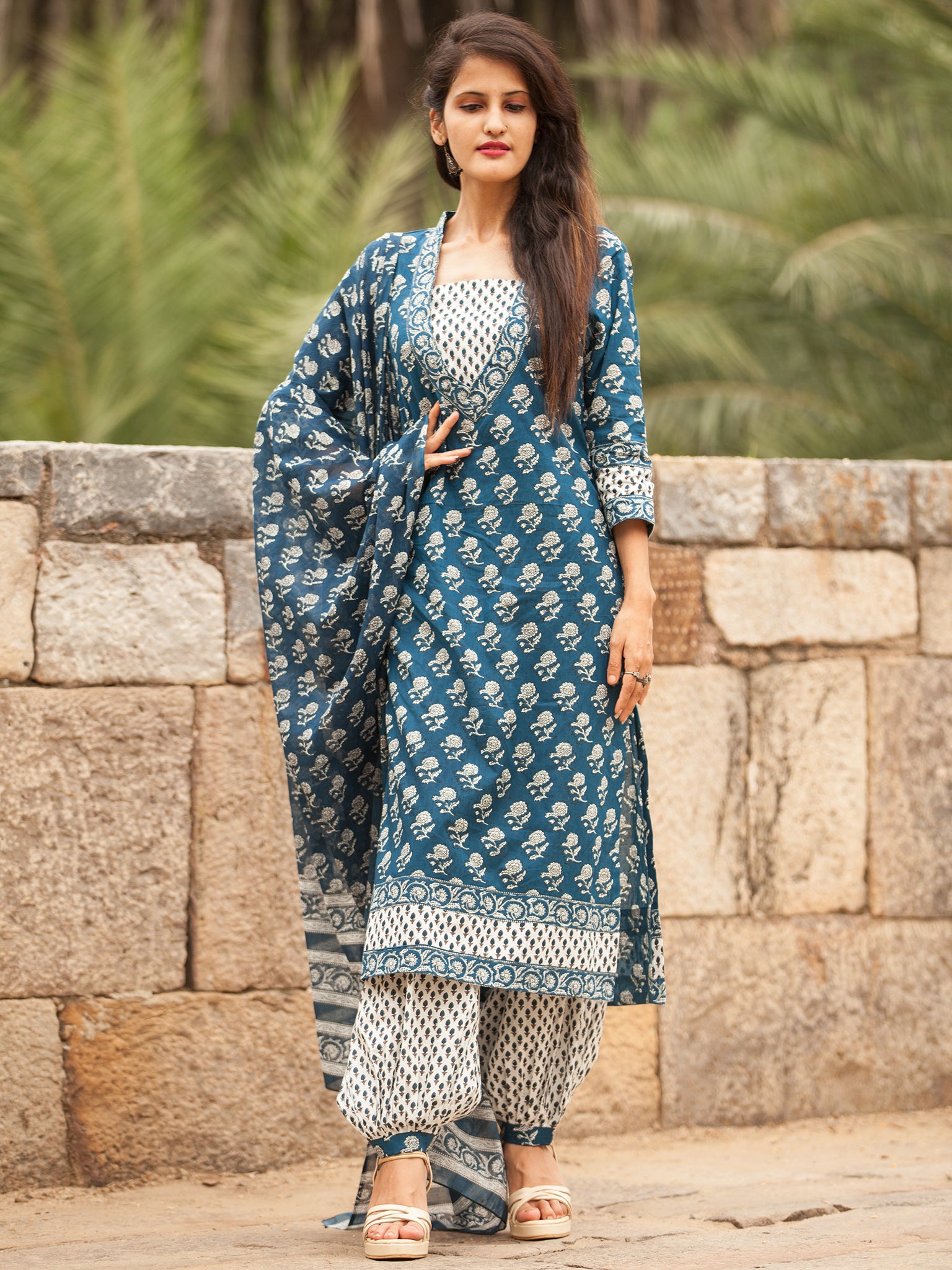 Product: This set contains Handcrafted Sanganeri Premium Cotton Kurta, 100% Cotton Pants and Cotton Dupatta.