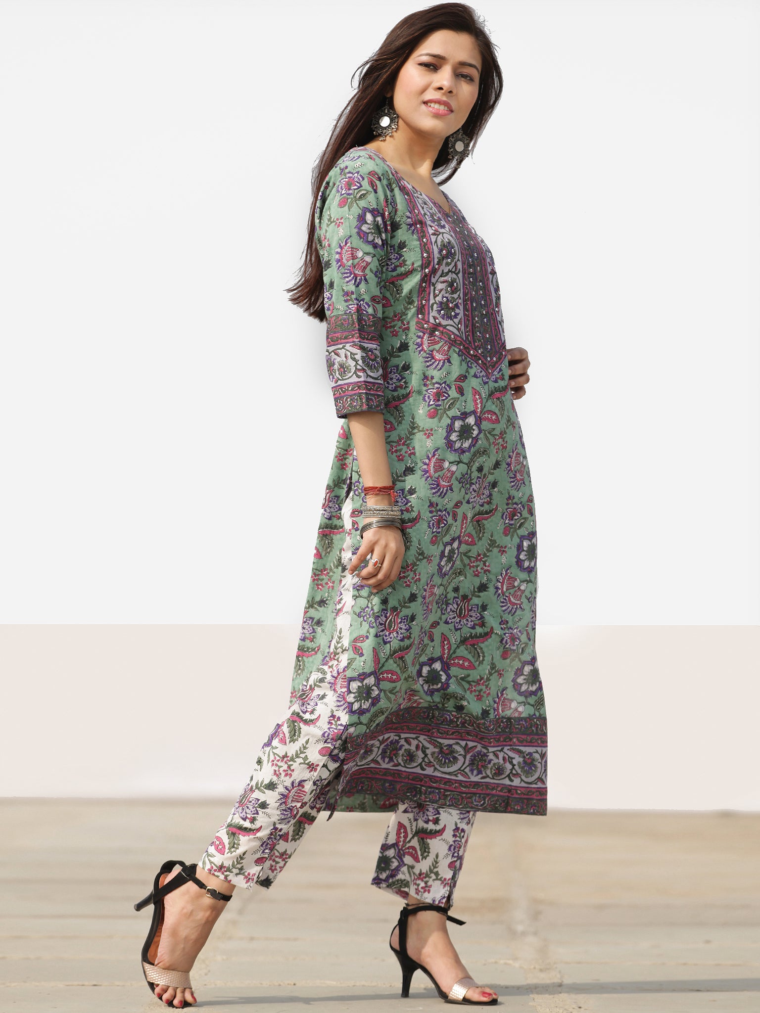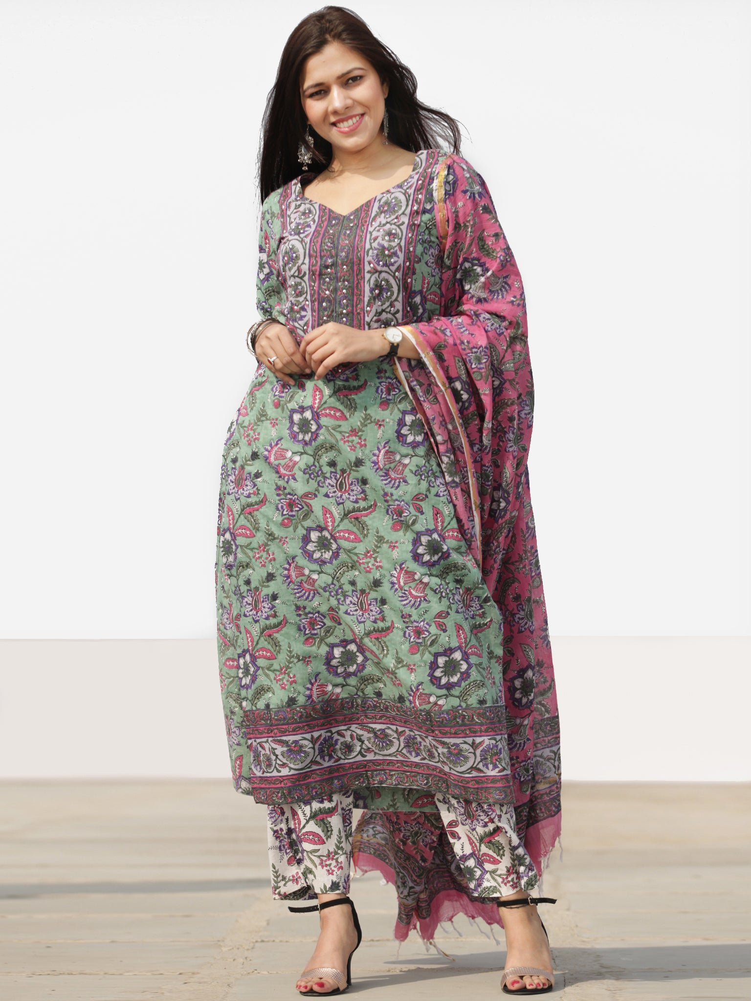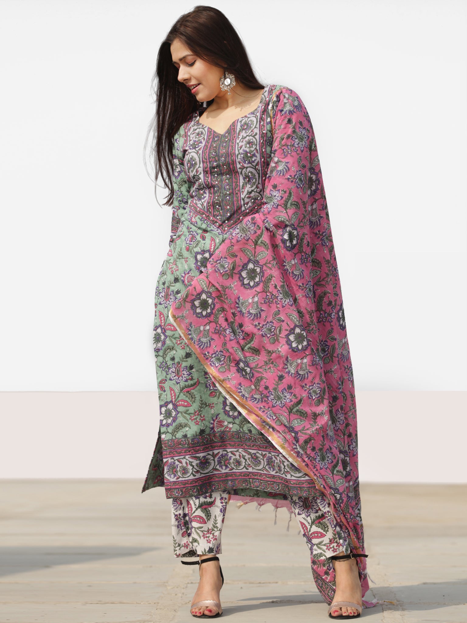 Product: This set contains Handcrafted Sanganeri Premium Cotton Kurta, 100% Cotton Pants and Cotton Dupatta.