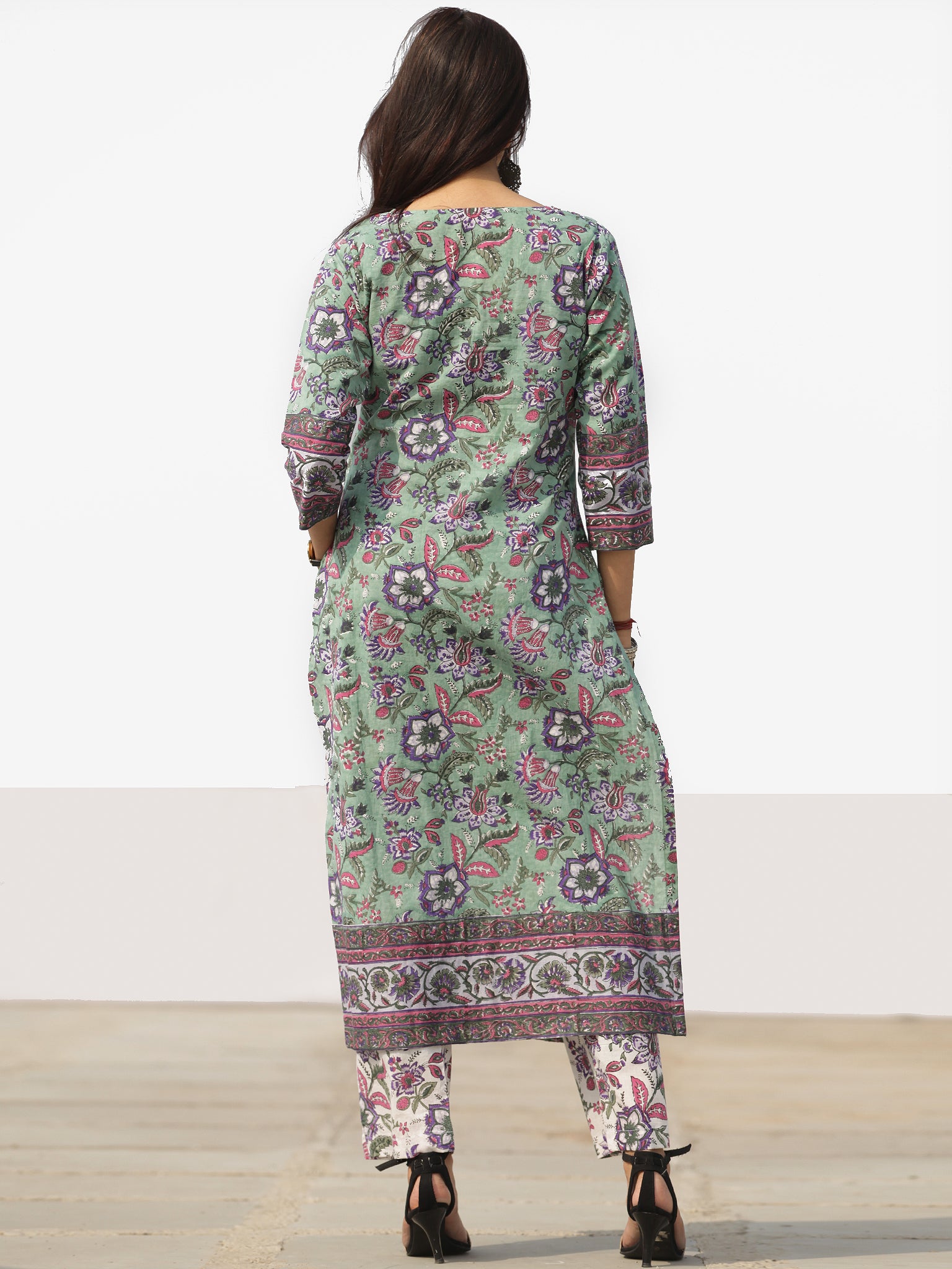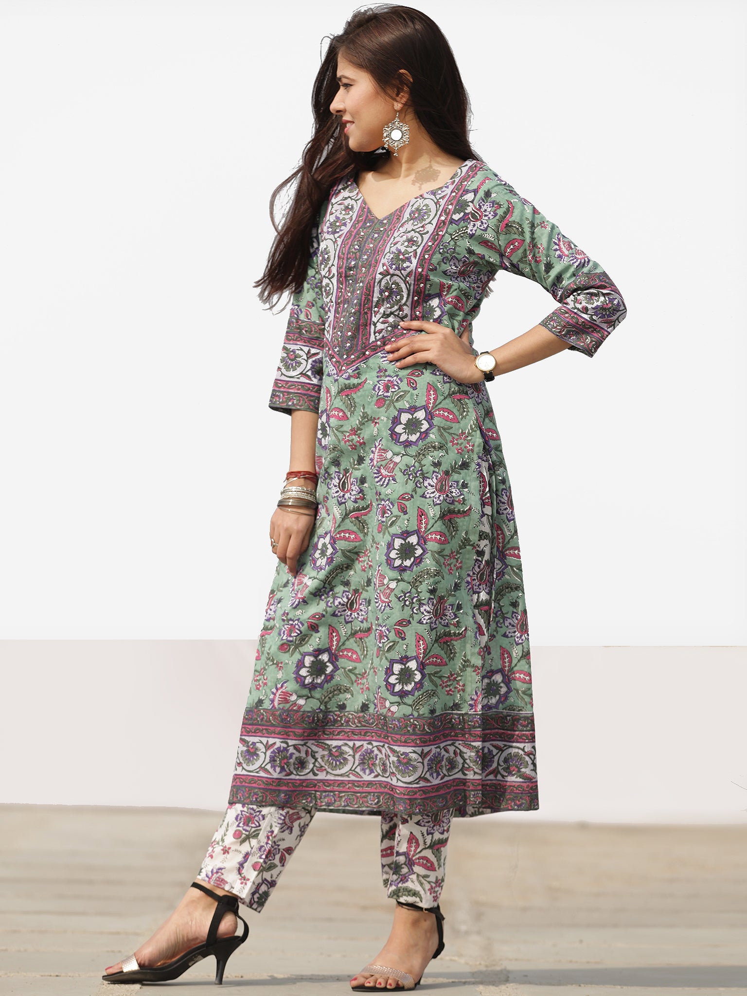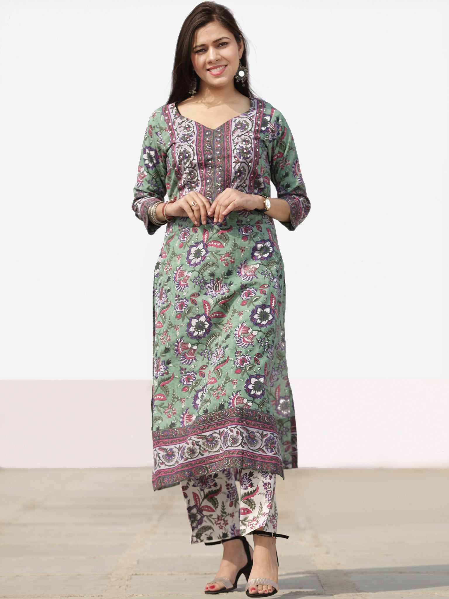 Product: This set contains Handcrafted Sanganeri Premium Cotton Kurta, 100% Cotton Pants and Cotton Dupatta.