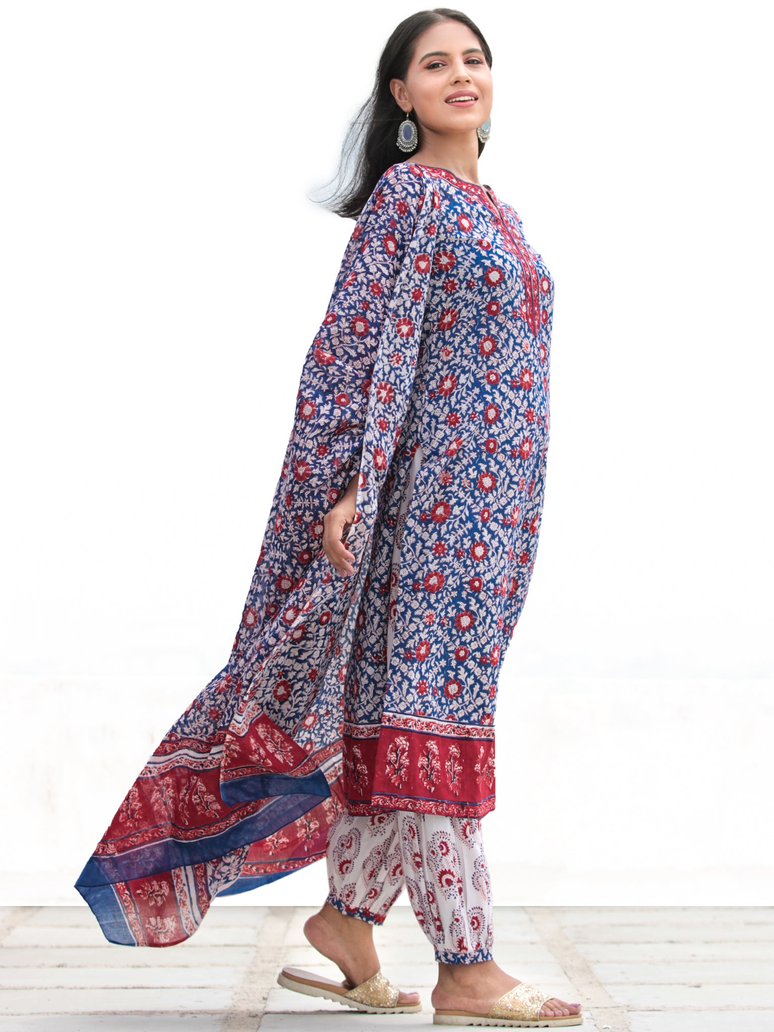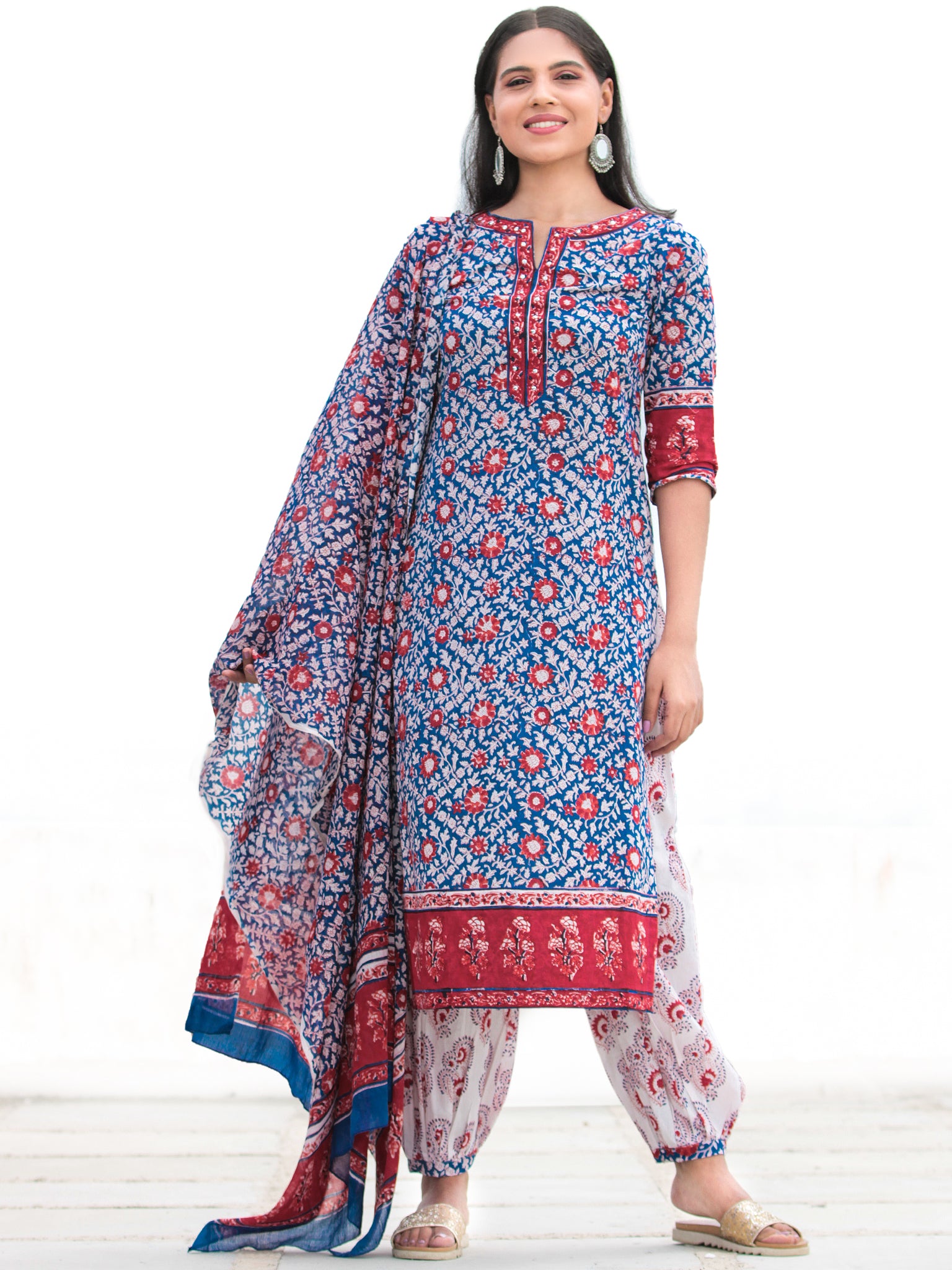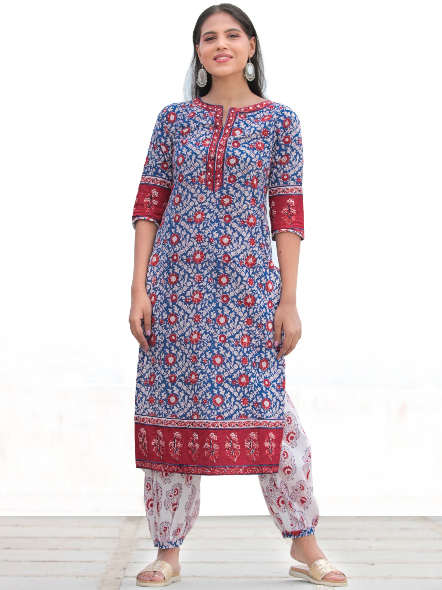 Product: This set contains Handcrafted Sanganeri Premium Cotton Kurta, 100% Cotton Pants and Cotton Dupatta.