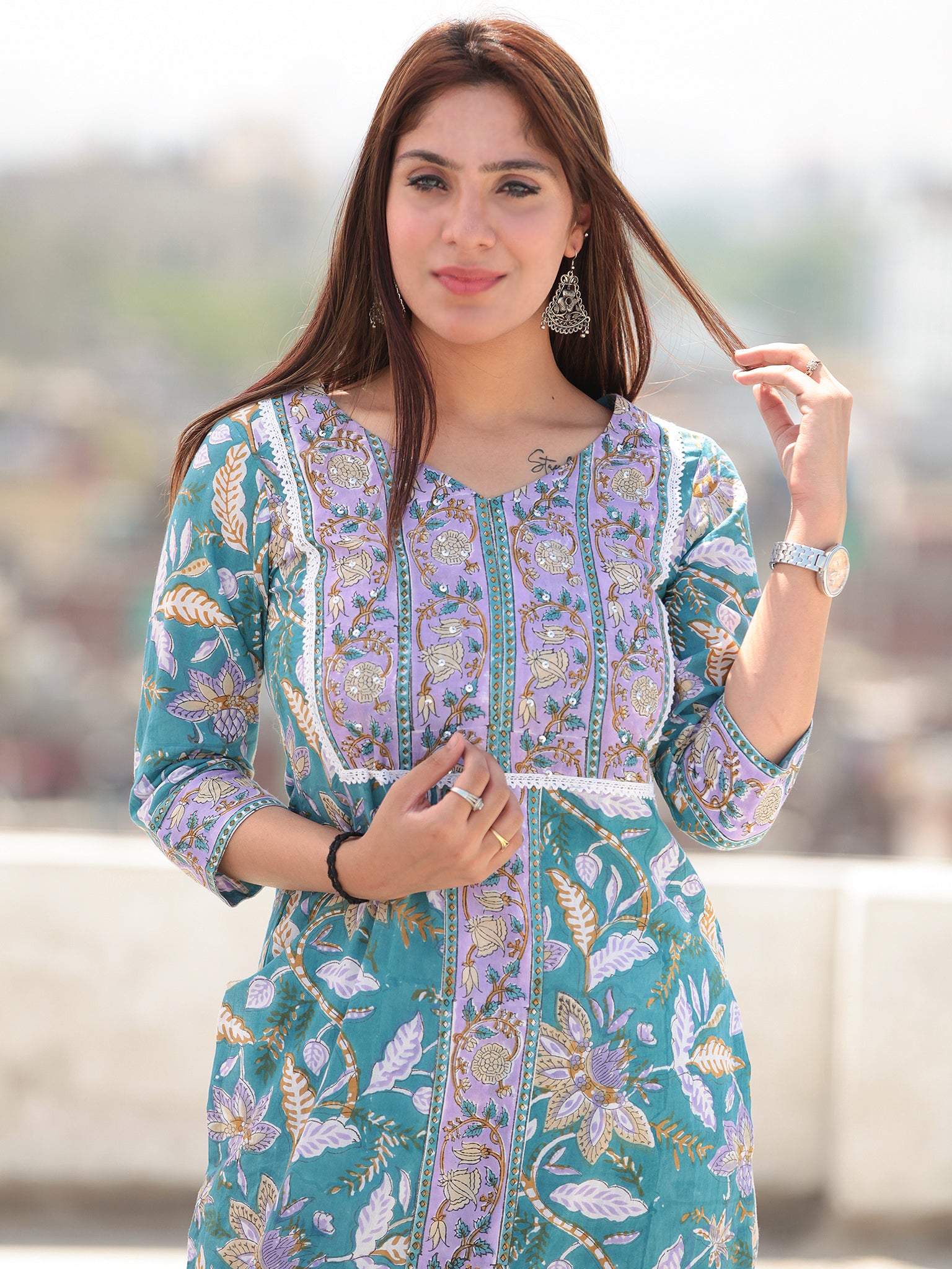 Product: This set contains Handcrafted Sanganeri Premium Cotton Kurta, 100% Cotton Pants and Kota Doria Dupatta.