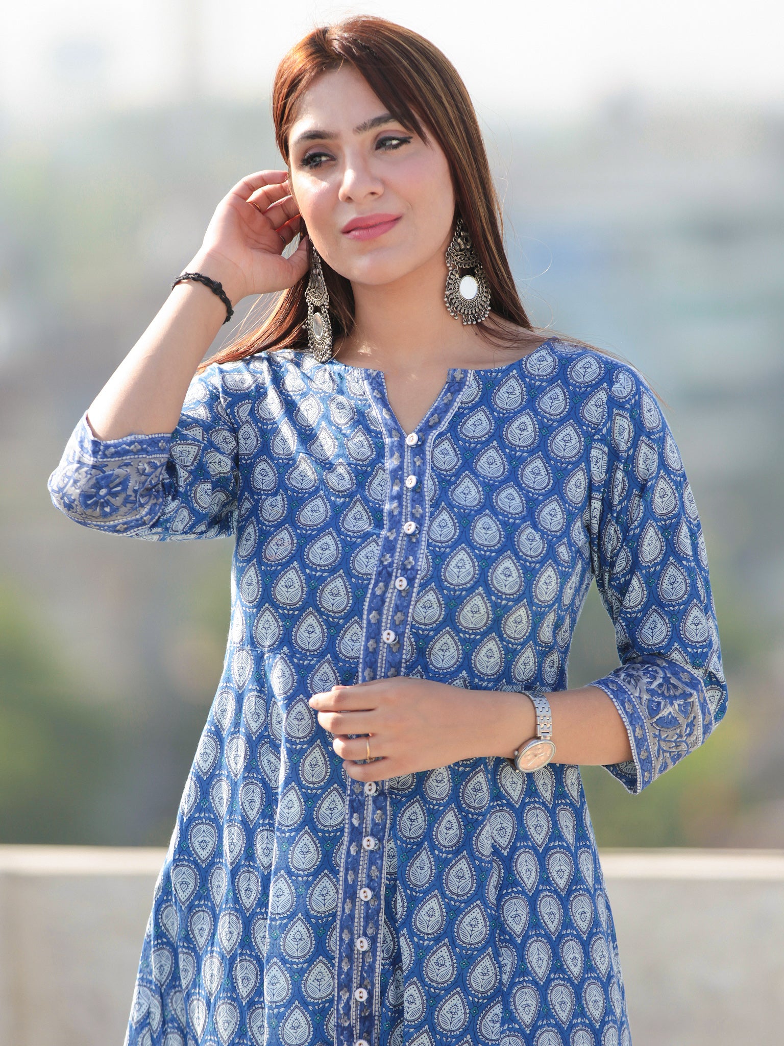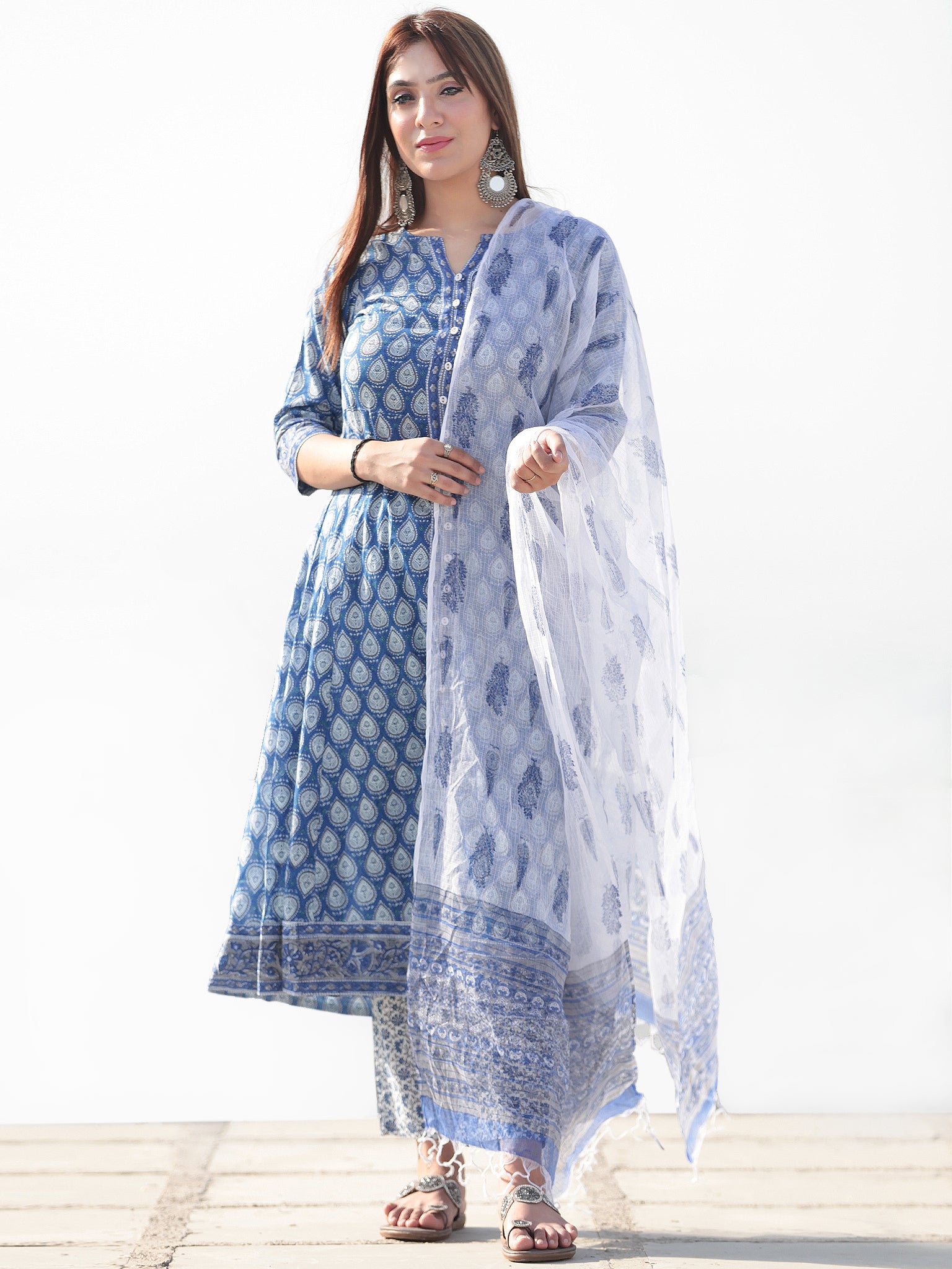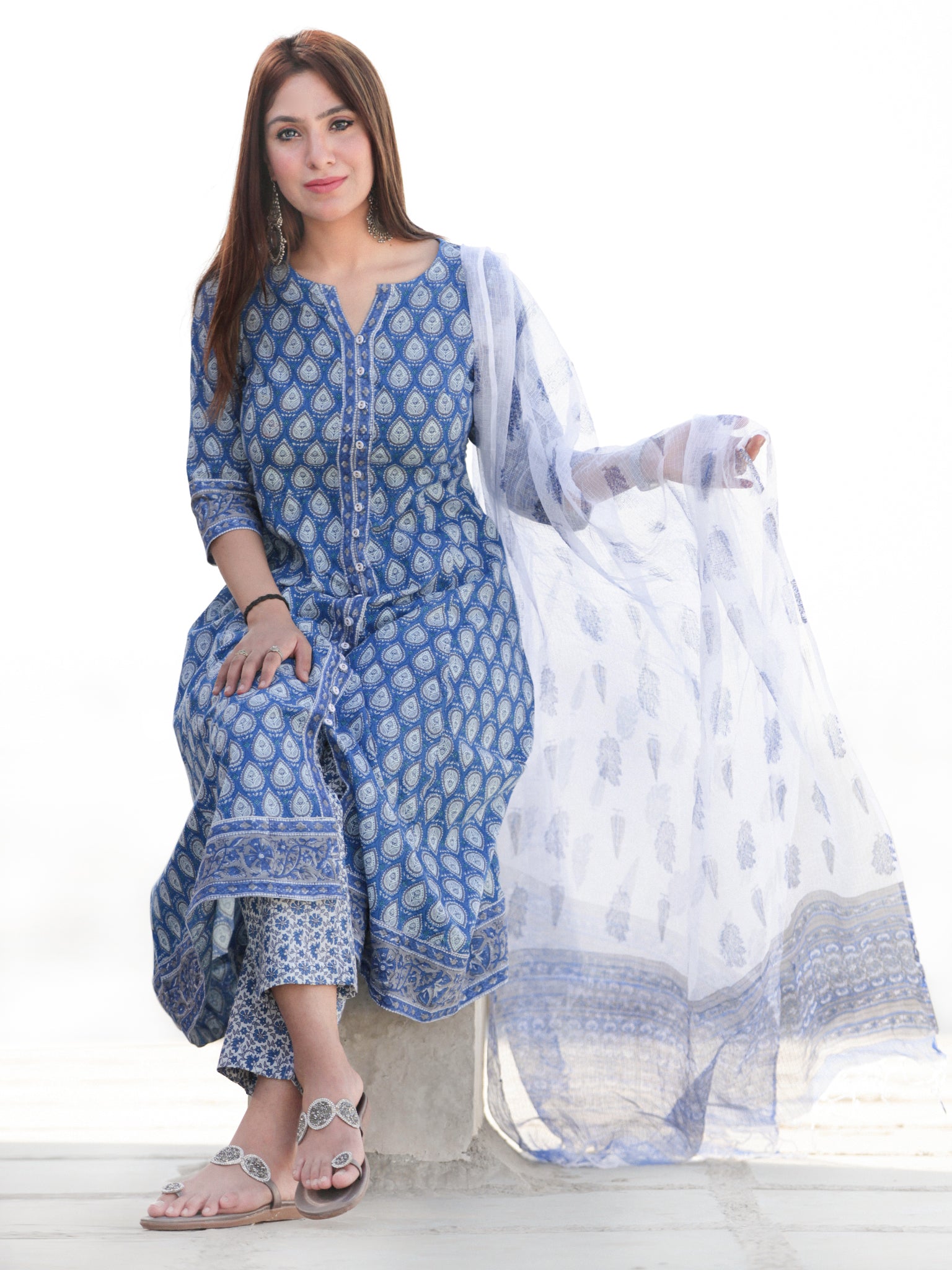 Product: This set contains Handcrafted Sanganeri Premium Cotton Kurta, 100% Cotton Pants and Kota Doria Dupatta.