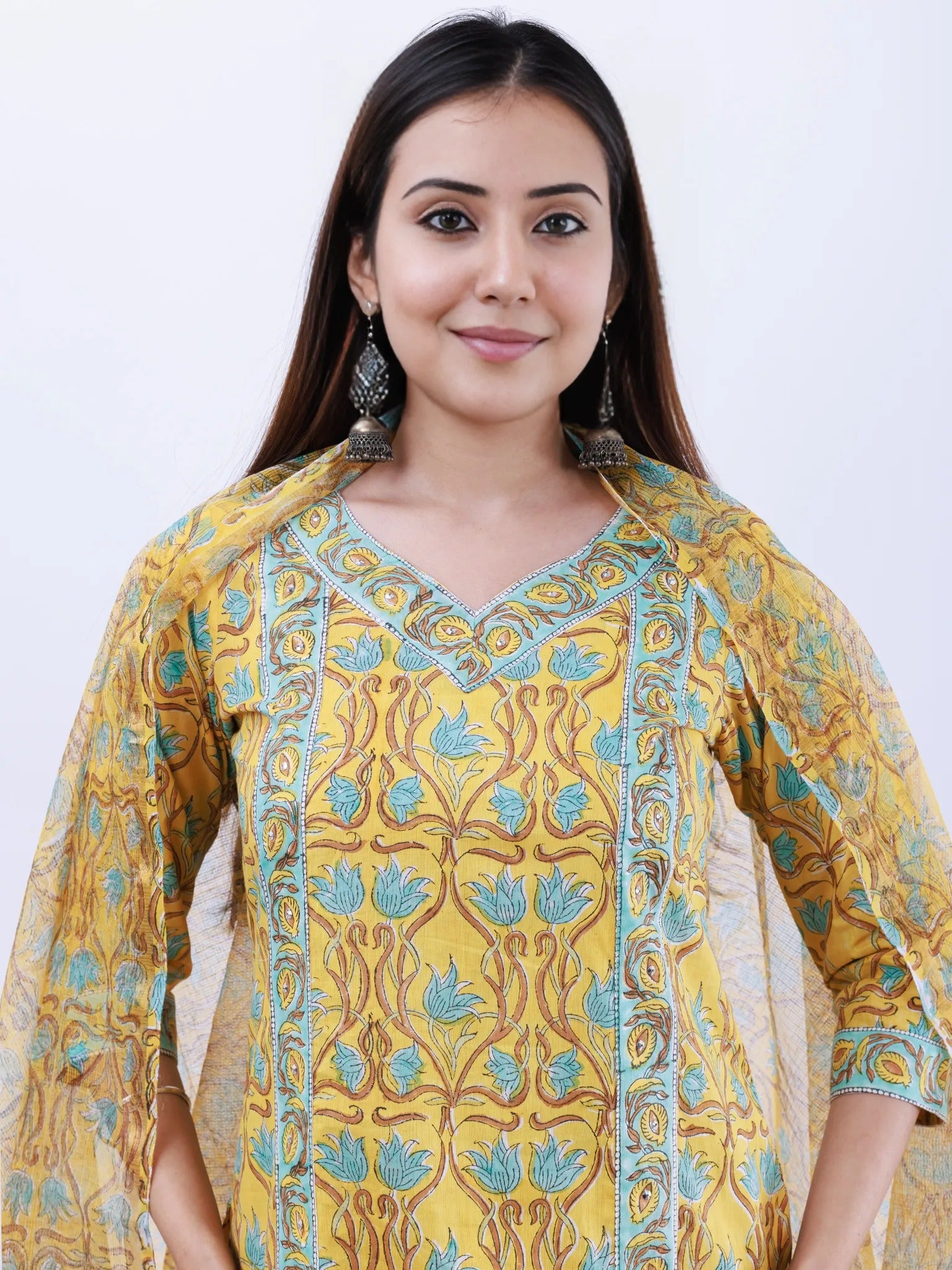Product: This set contains Handcrafted Sanganeri Premium Cotton Kurta, 100% Cotton Pants and Kota Doria Dupatta.