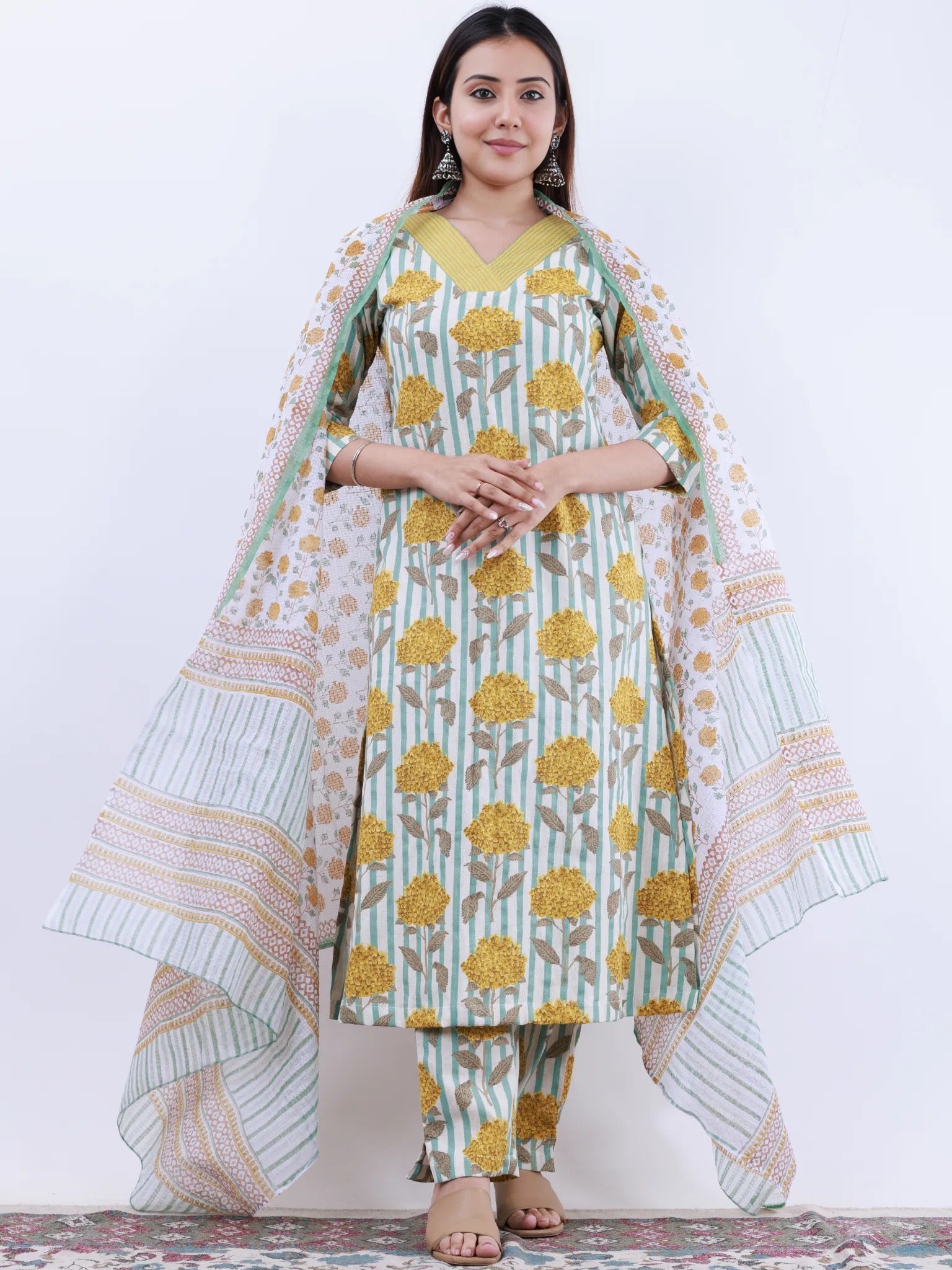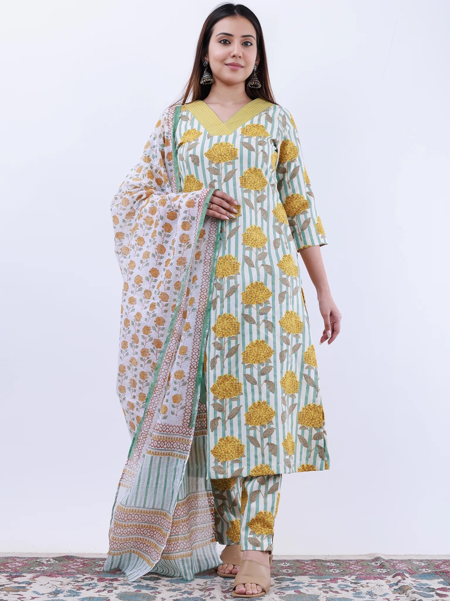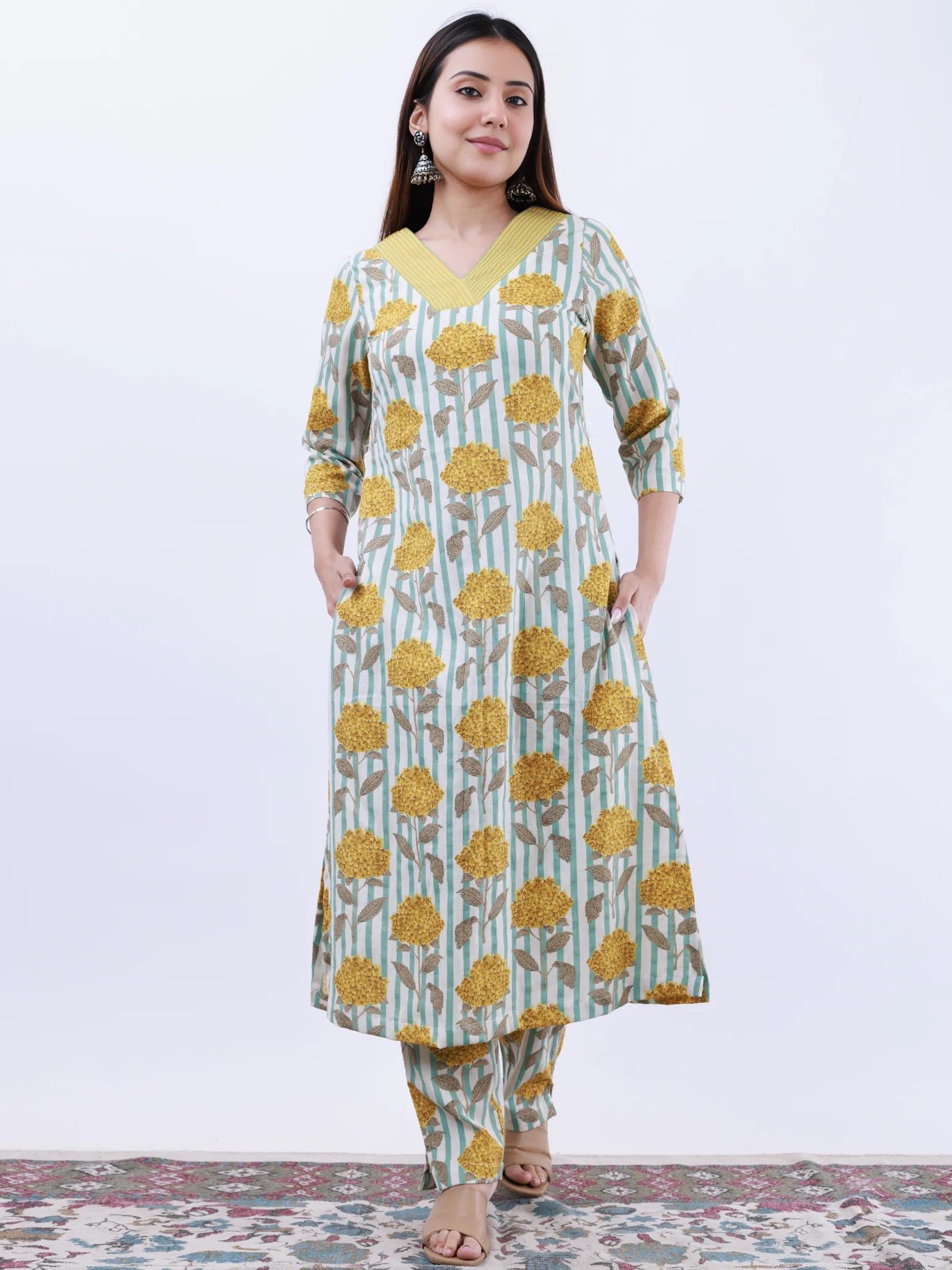 Product: This set contains Handcrafted Sanganeri Premium Cotton Linen Kurta, Cotton Linen Pants and Kota Doria Dupatta.