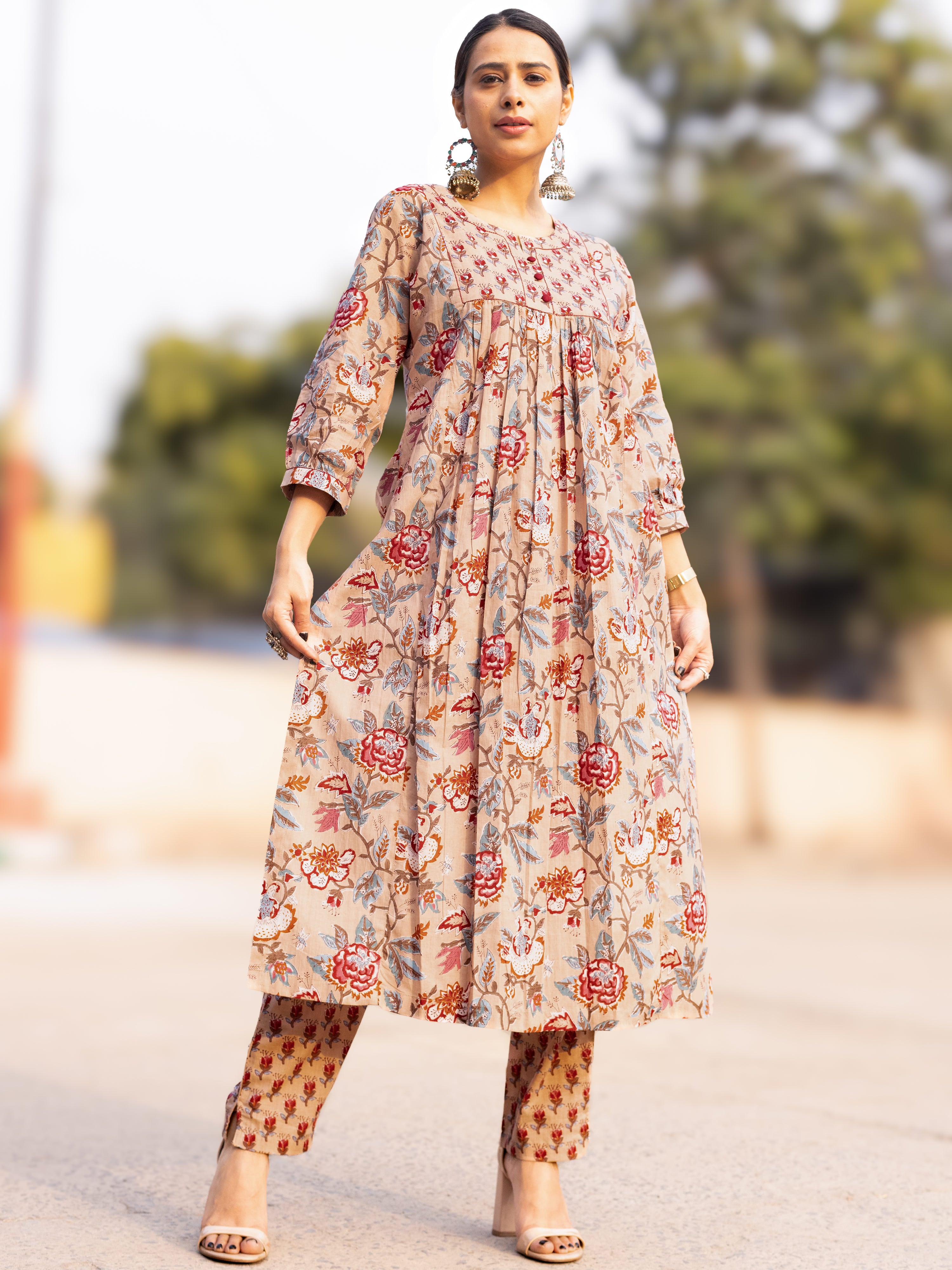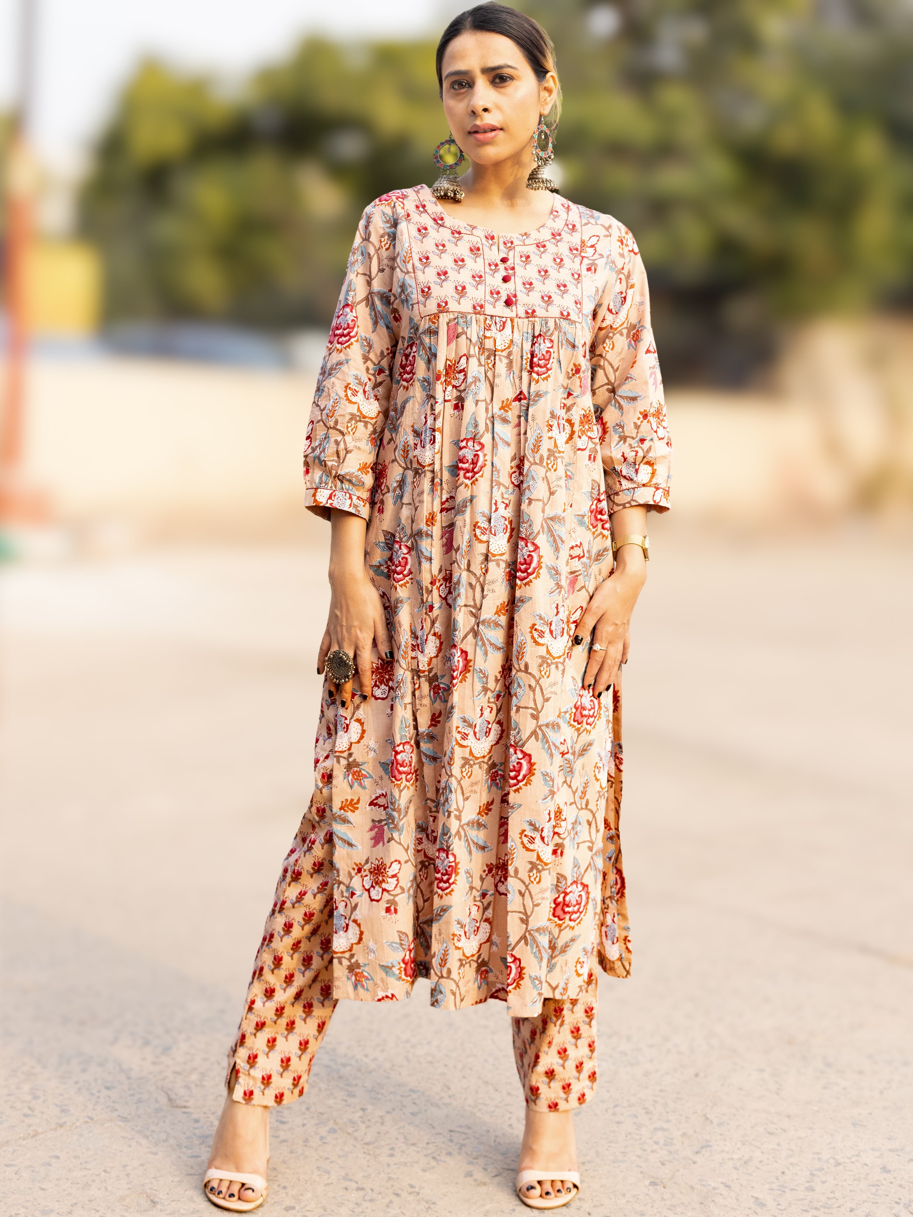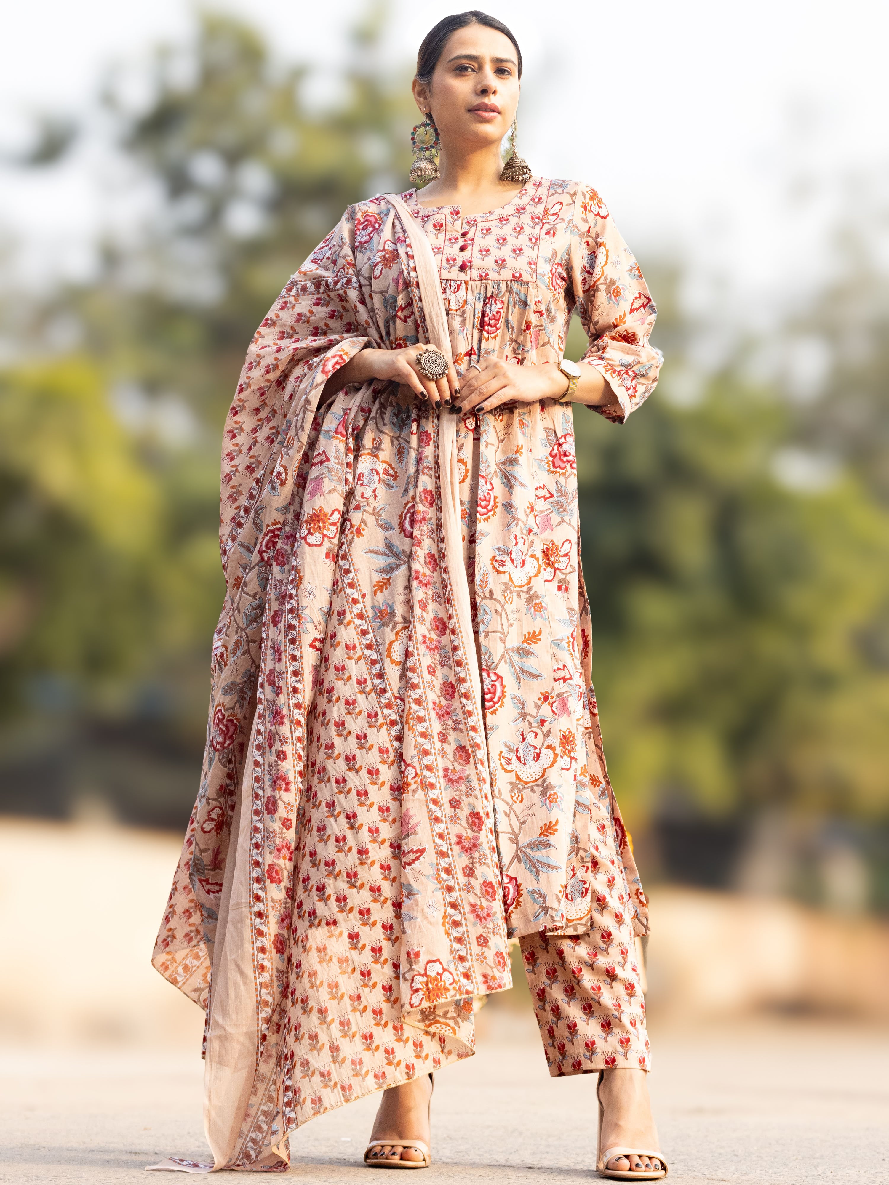 Product: This set contains Handcrafted Sanganeri Premium Cotton Kurta, 100% Cotton Pants and Cotton Dupatta.
