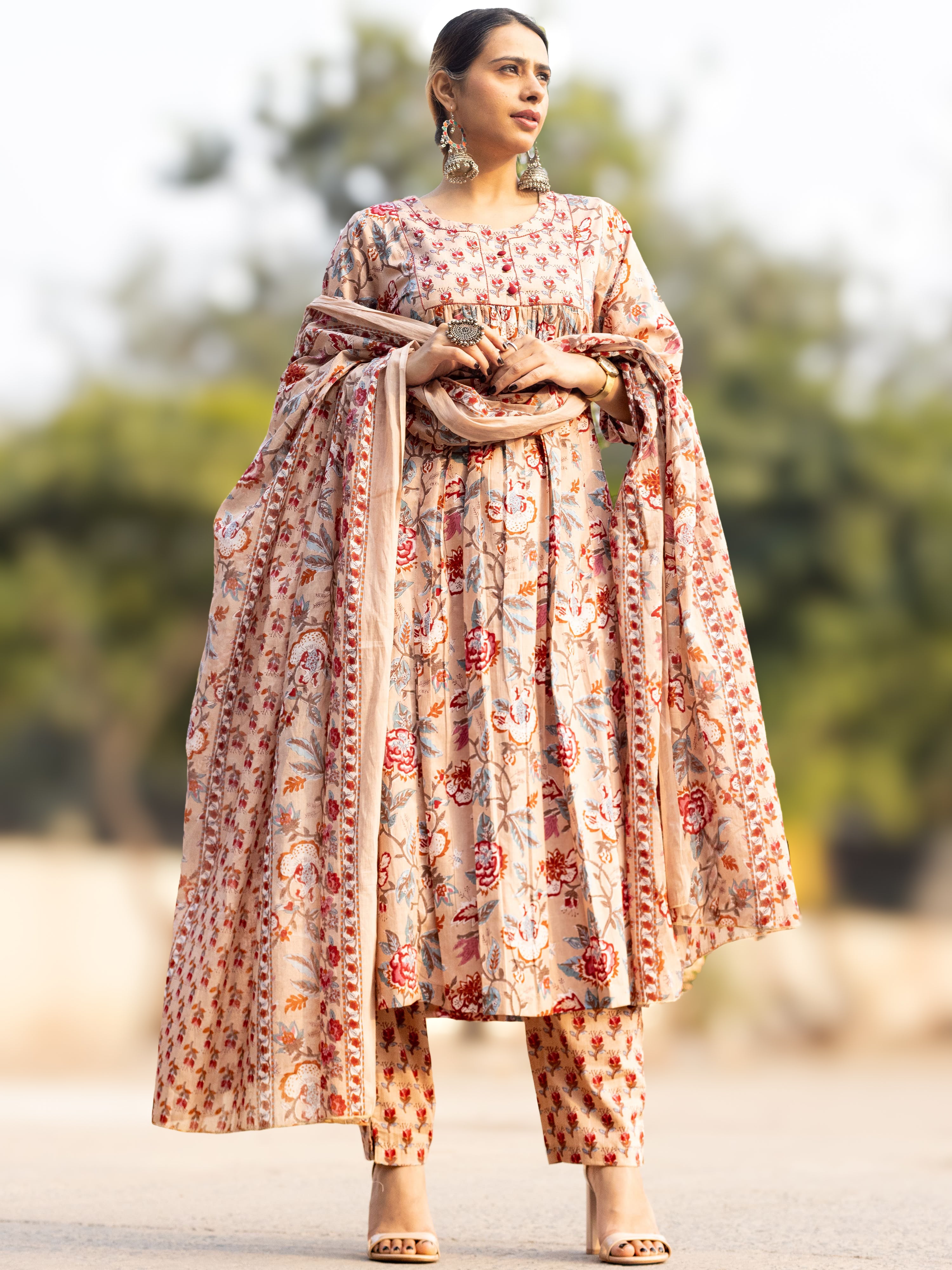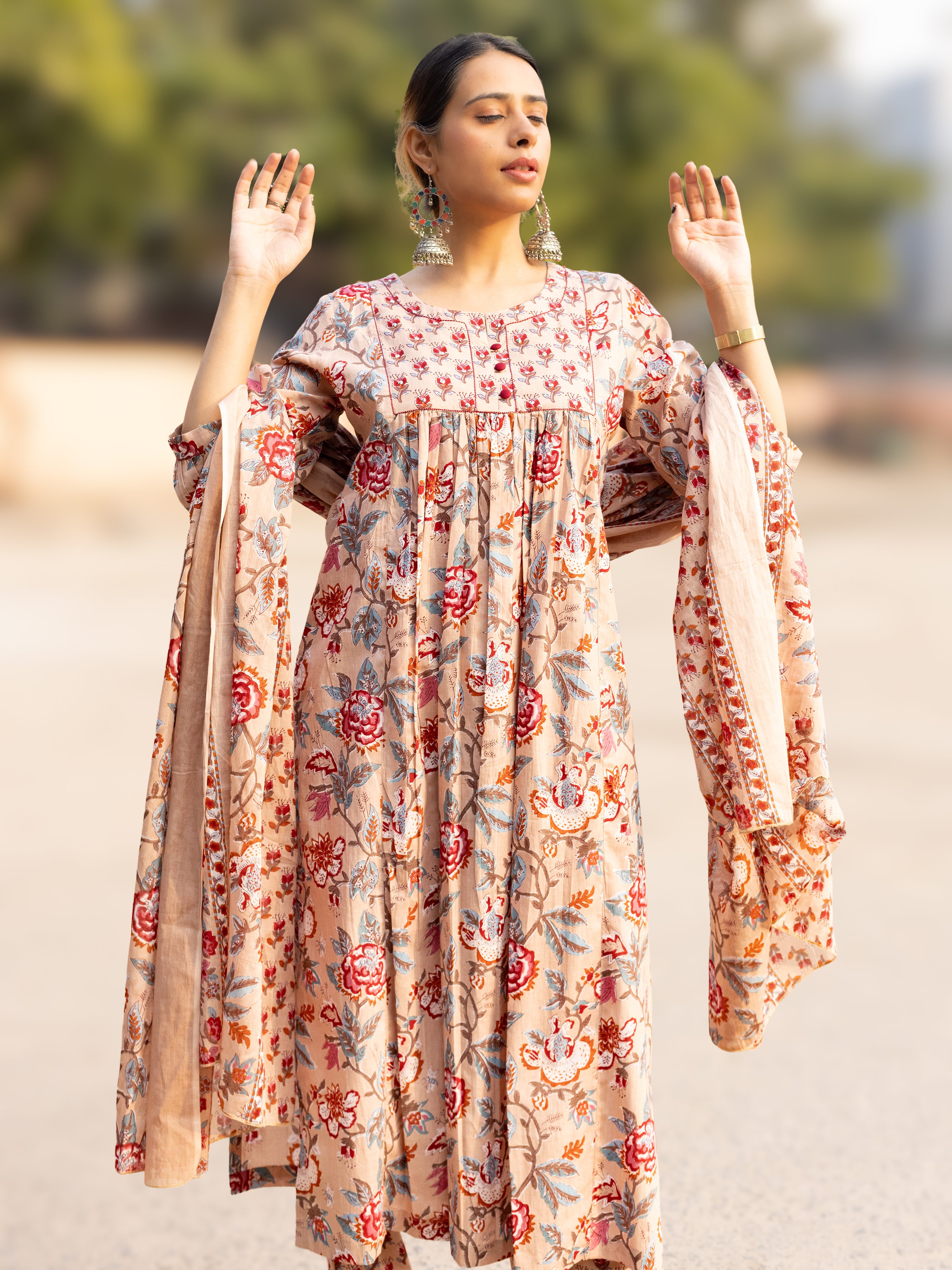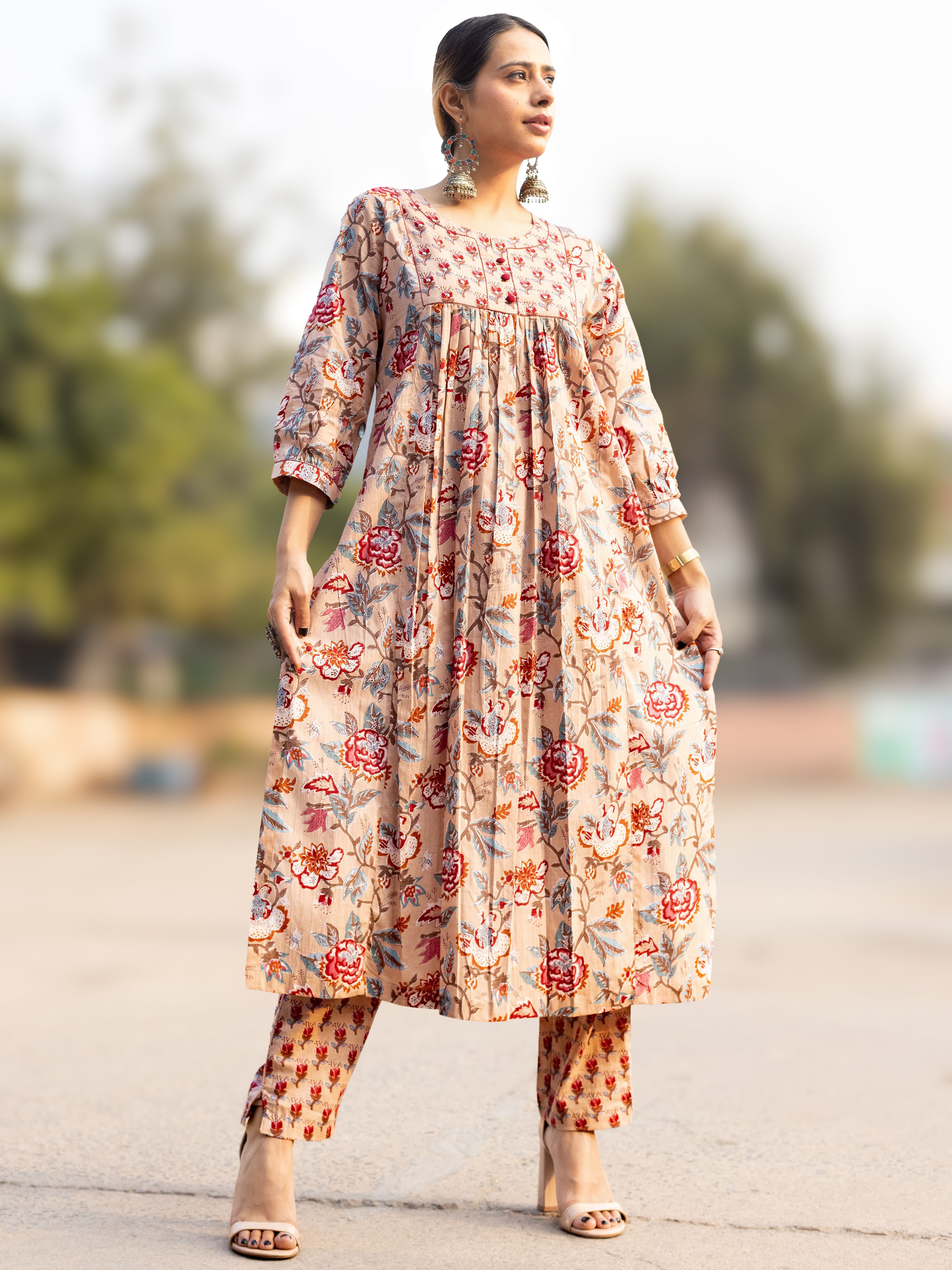 Product: This set contains Handcrafted Sanganeri Premium Cotton Kurta, 100% Cotton Pants and Cotton Dupatta.