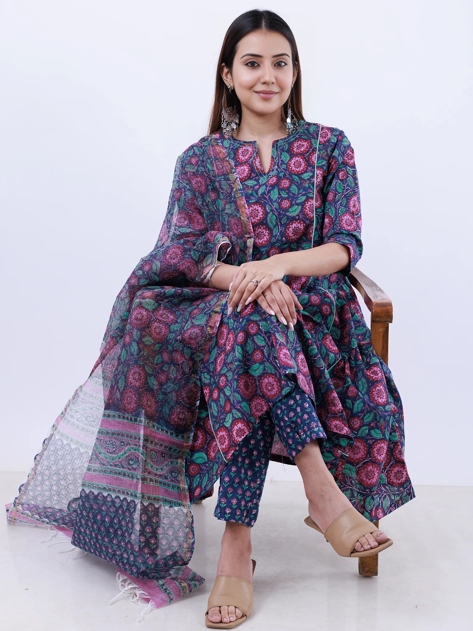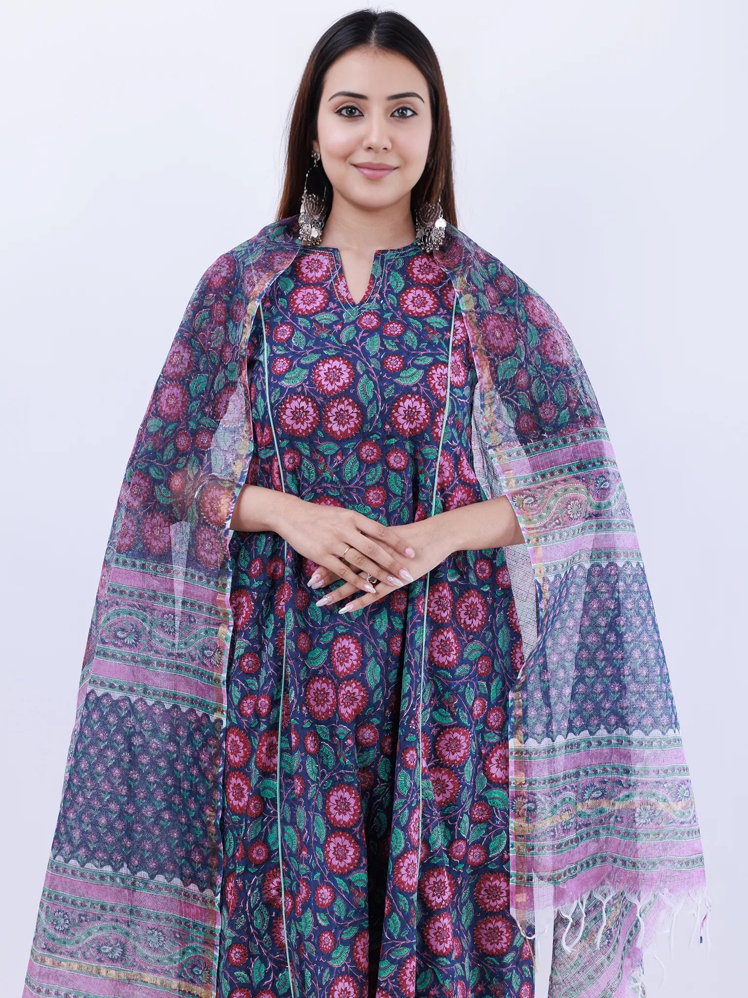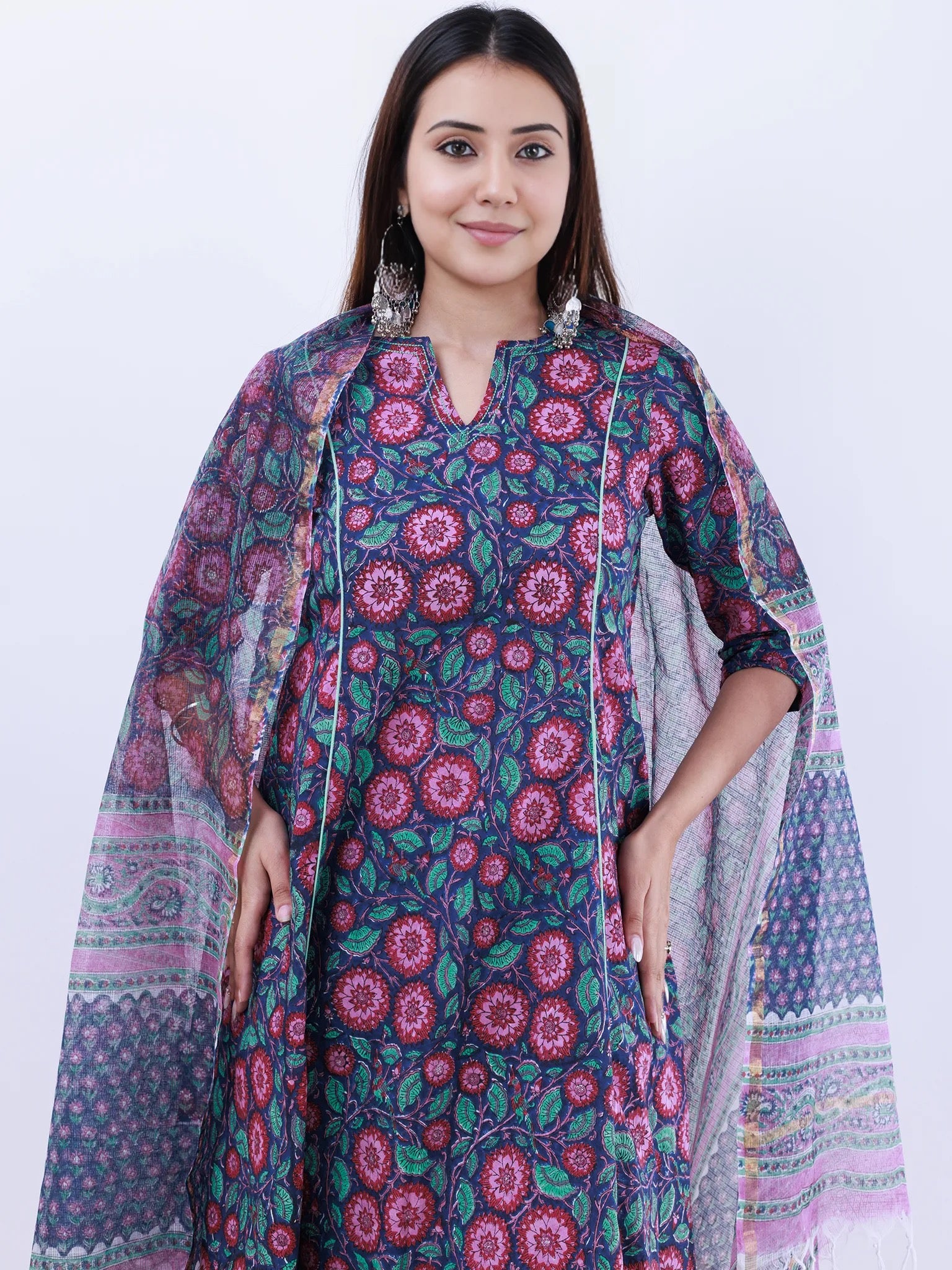 Product: This set contains Hand Block Printed Premium Cotton Kurta, 100% Cotton Pants and Kota Doria Dupatta.
