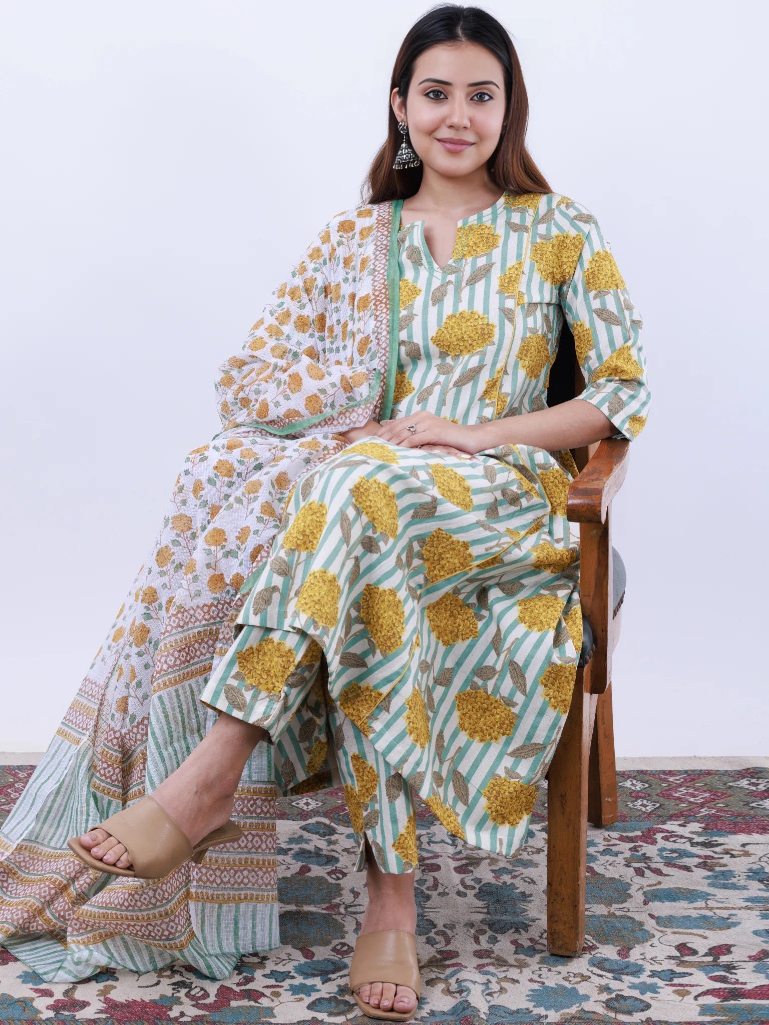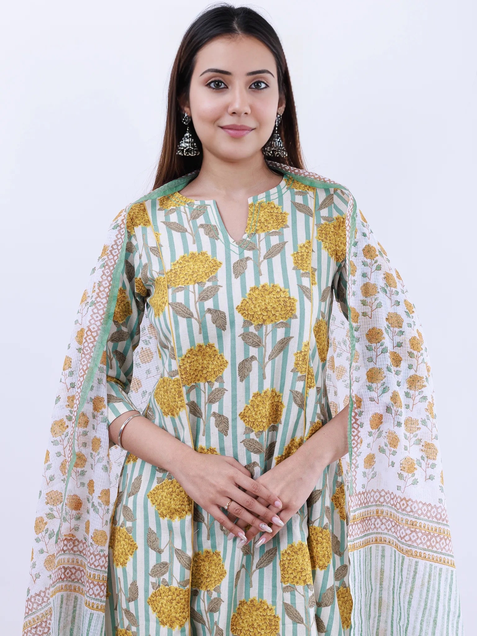 Product: This set contains Handcrafted Sanganeri Premium Cotton Linen Kurta, 100% Cotton Linen Pants and Kota Doria Dupatta.