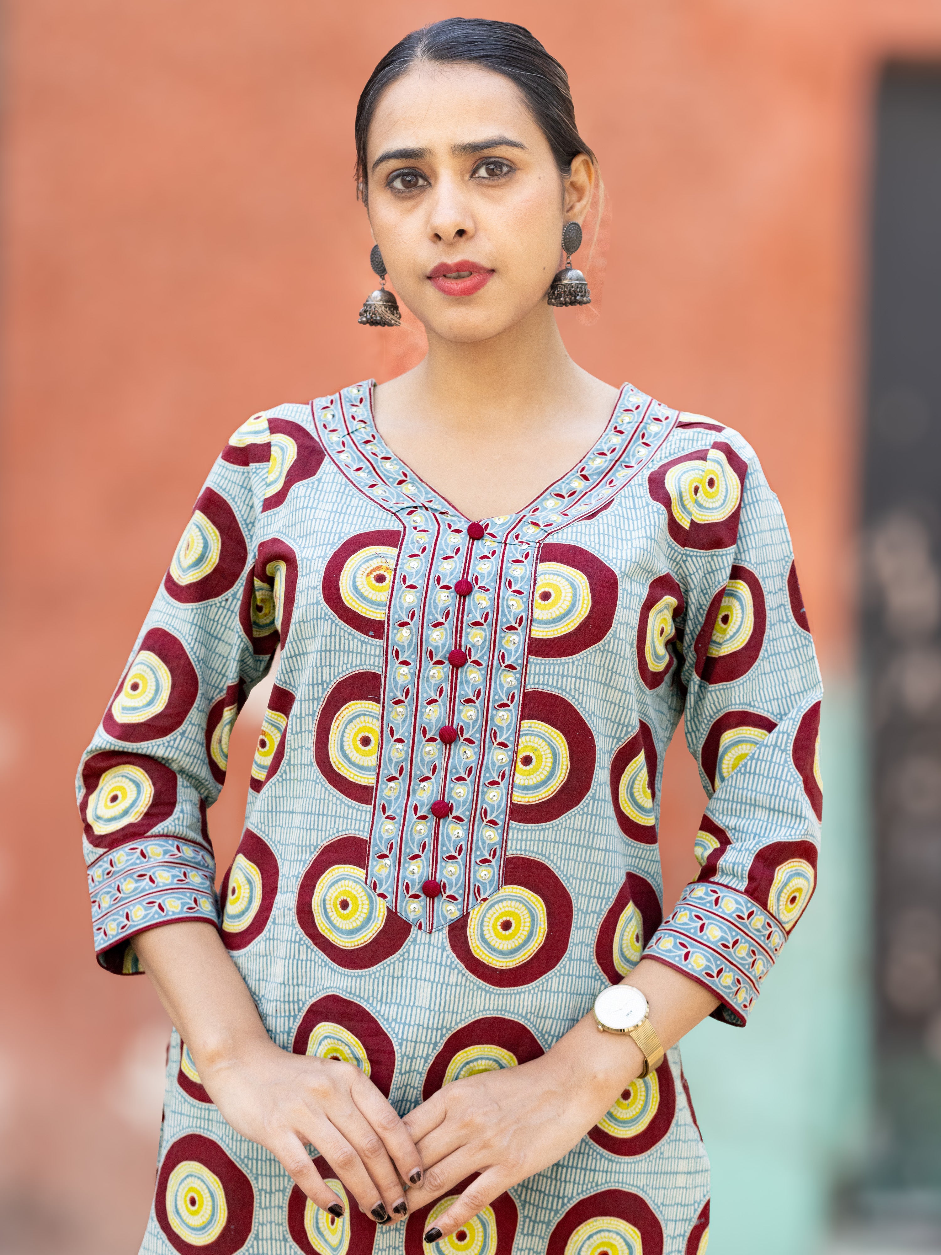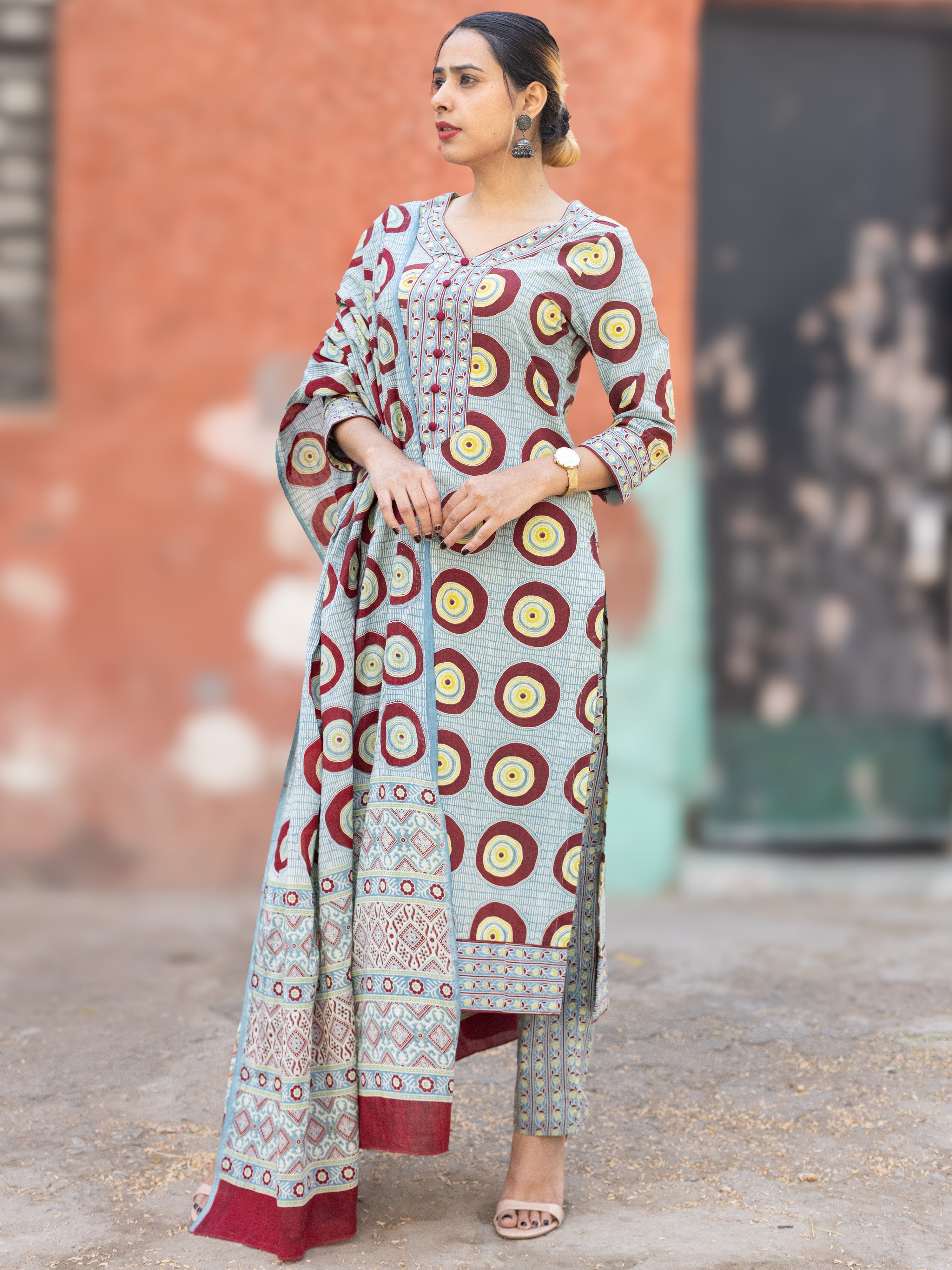 Product: This set contains Handcrafted Ajrakh Premium Cotton Kurta, 100% Cotton Pants and Cotton Dupatta.