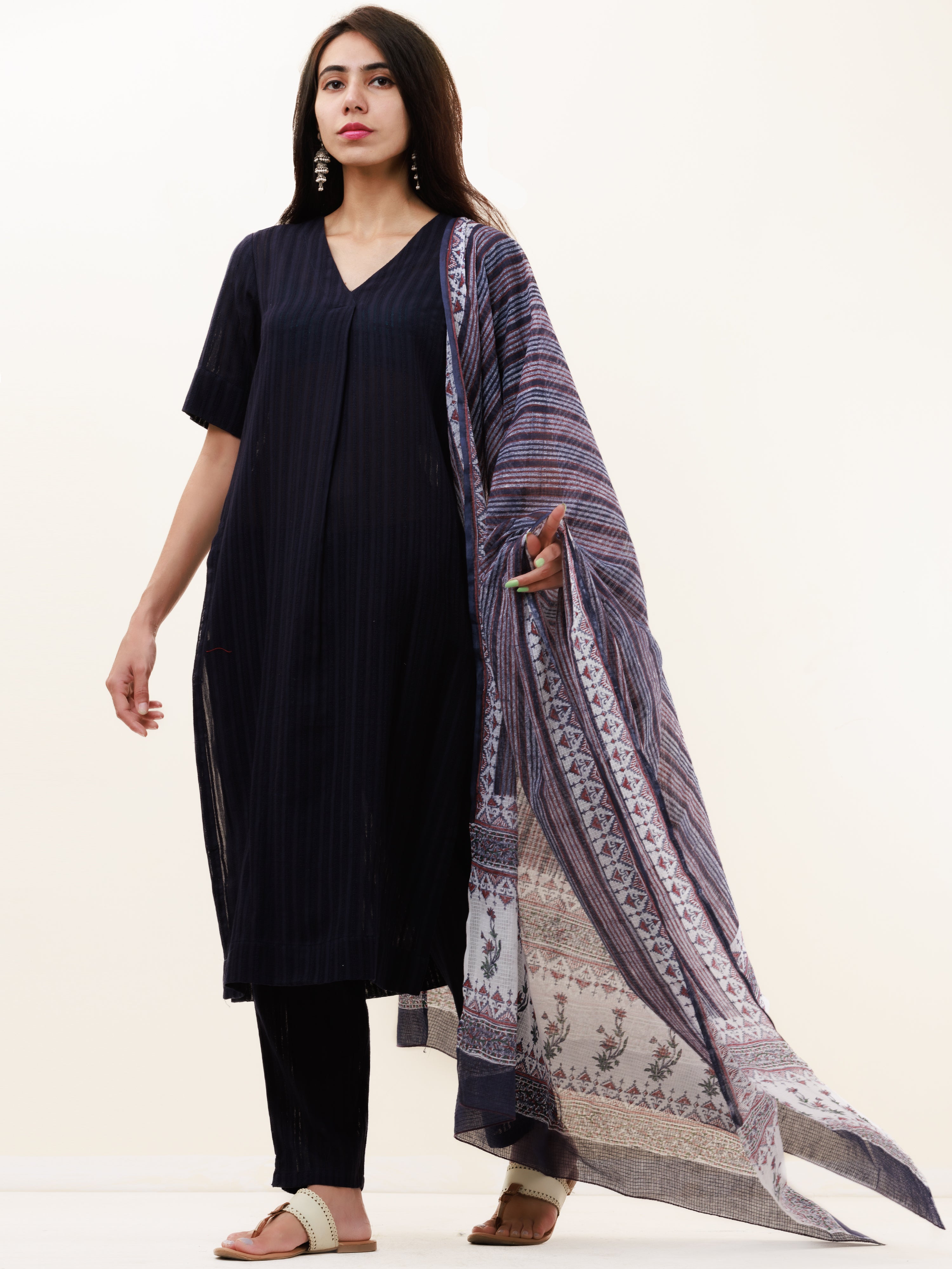 Product: This set contains Premium Cotton Dobby Kurta, 100% Cotton Dobby Pants and Kota Doria Dupatta.
