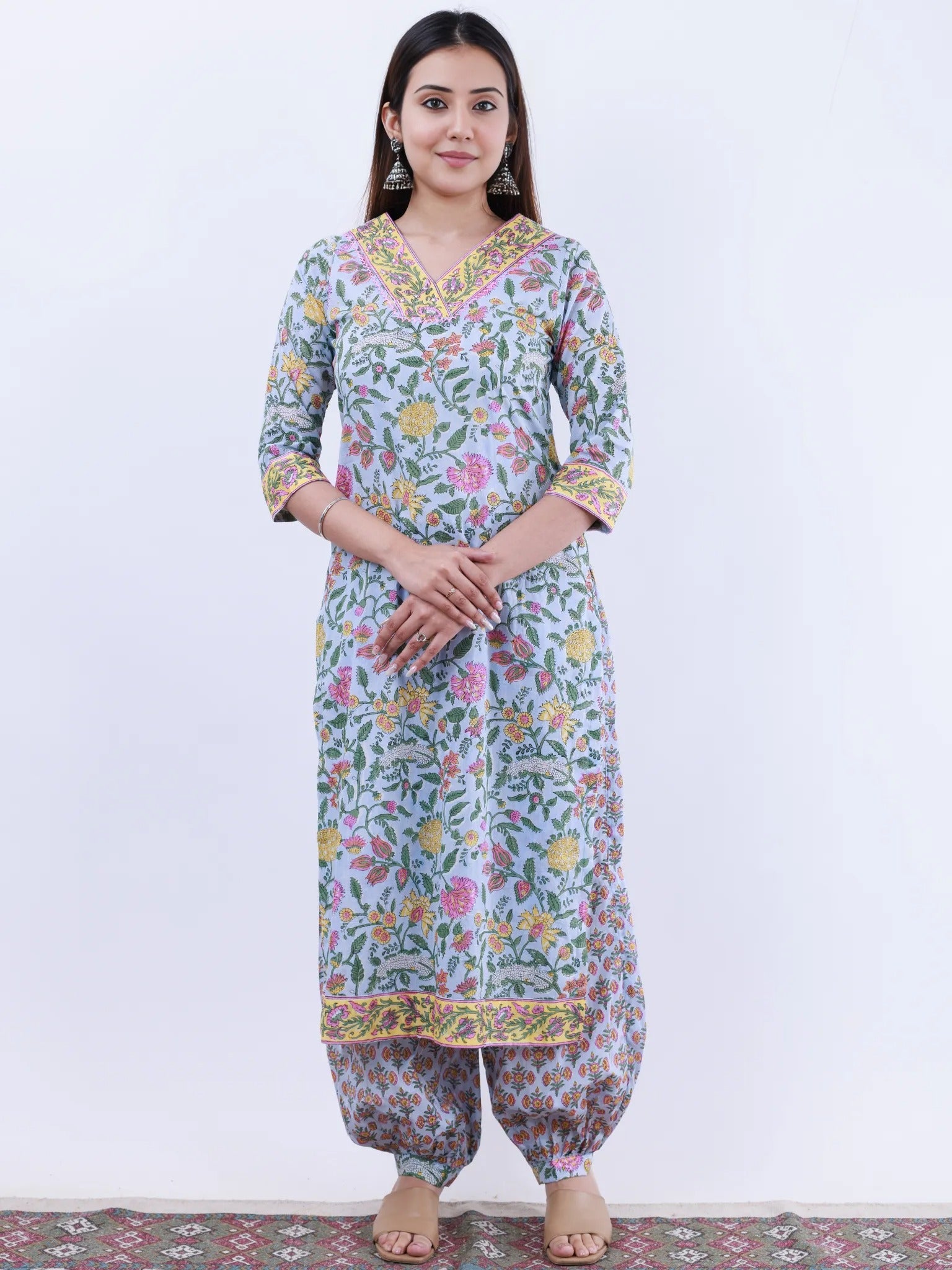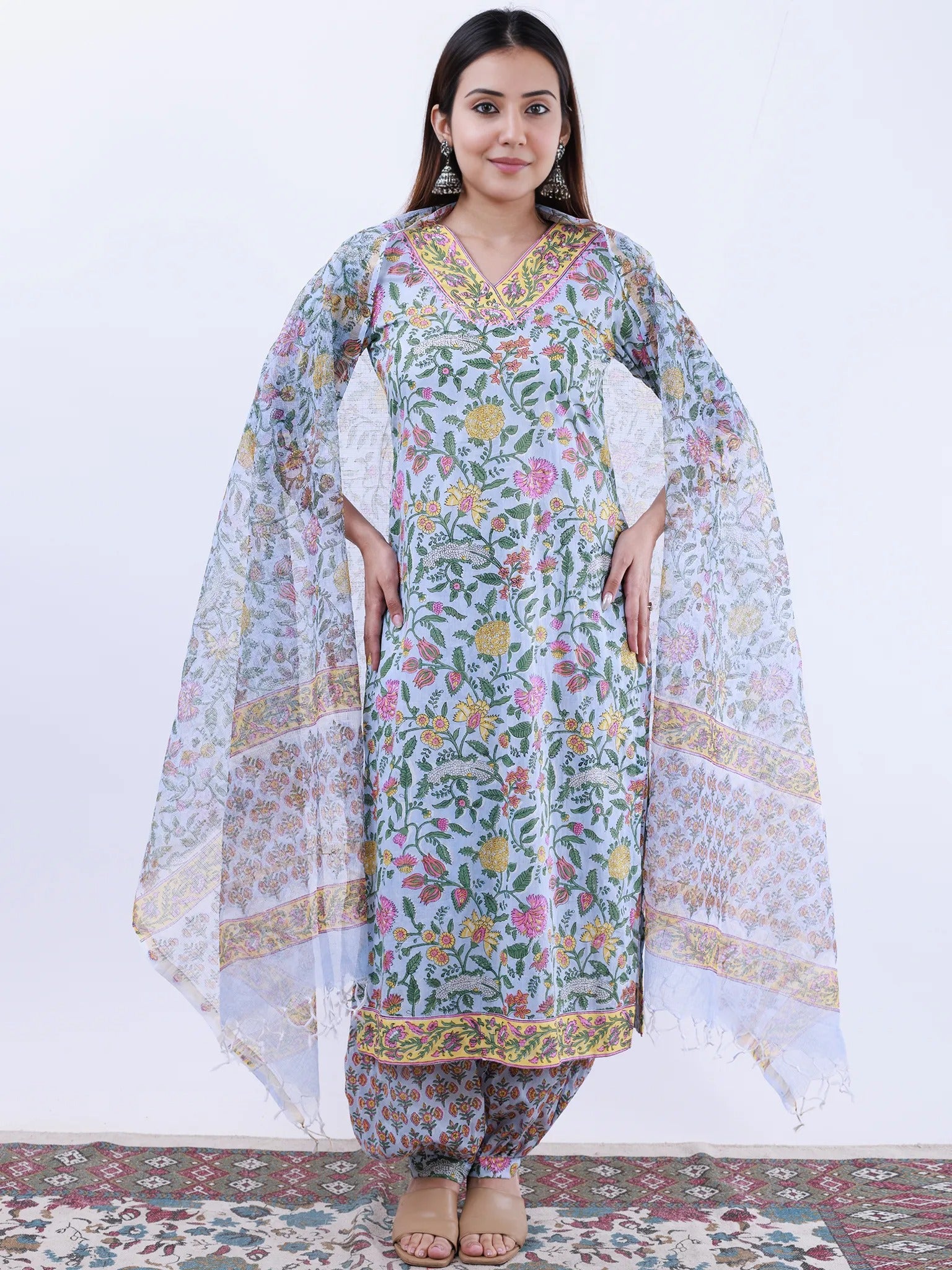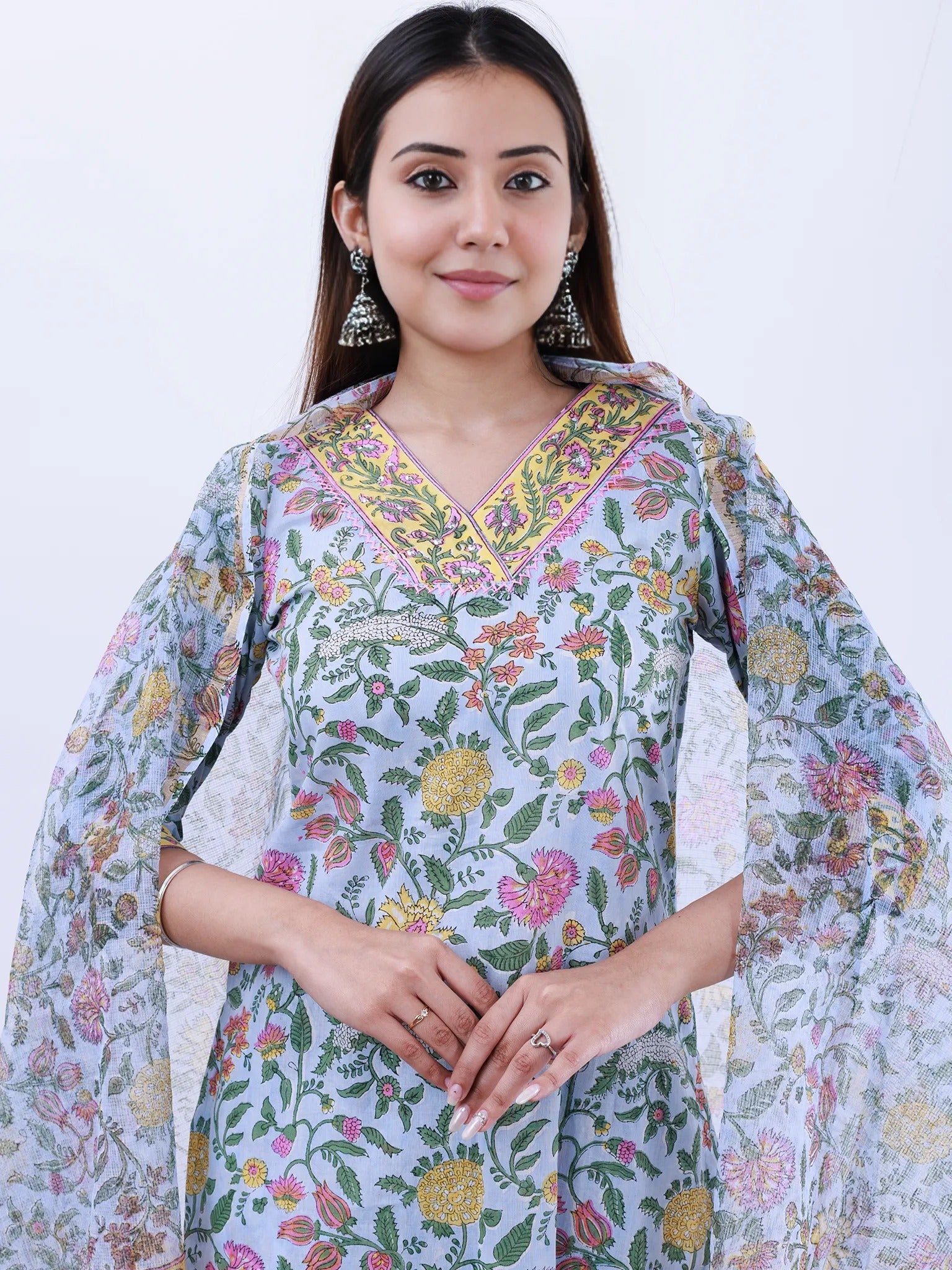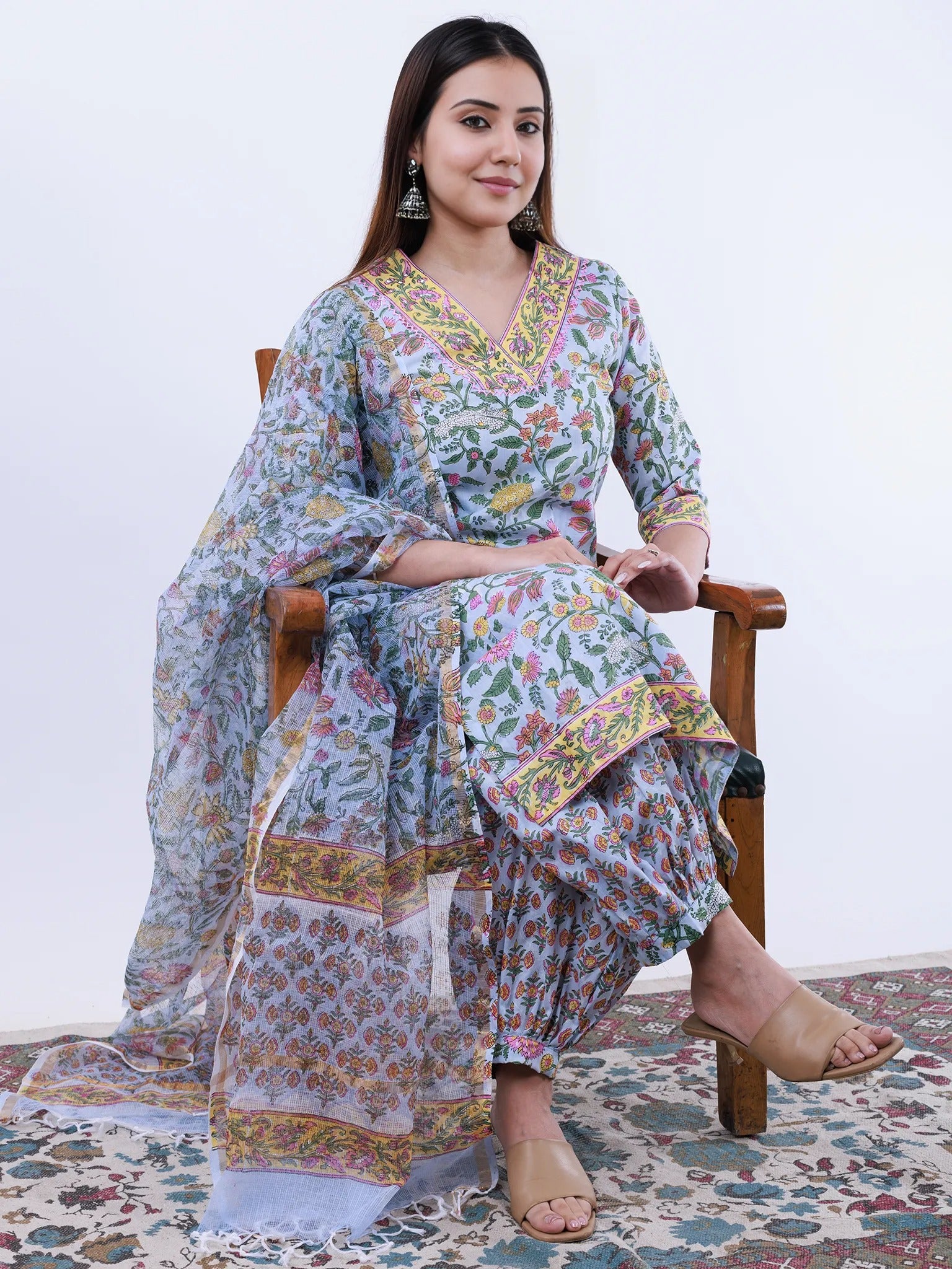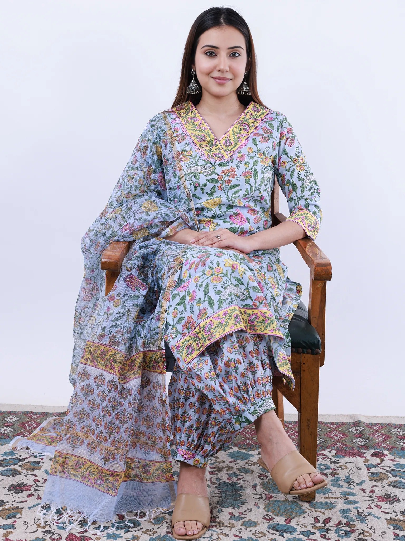 Product: This set contains Handcrafted Sanganeri Premium Cotton Kurta, 100% Cotton Pants and Kota Doria Dupatta.