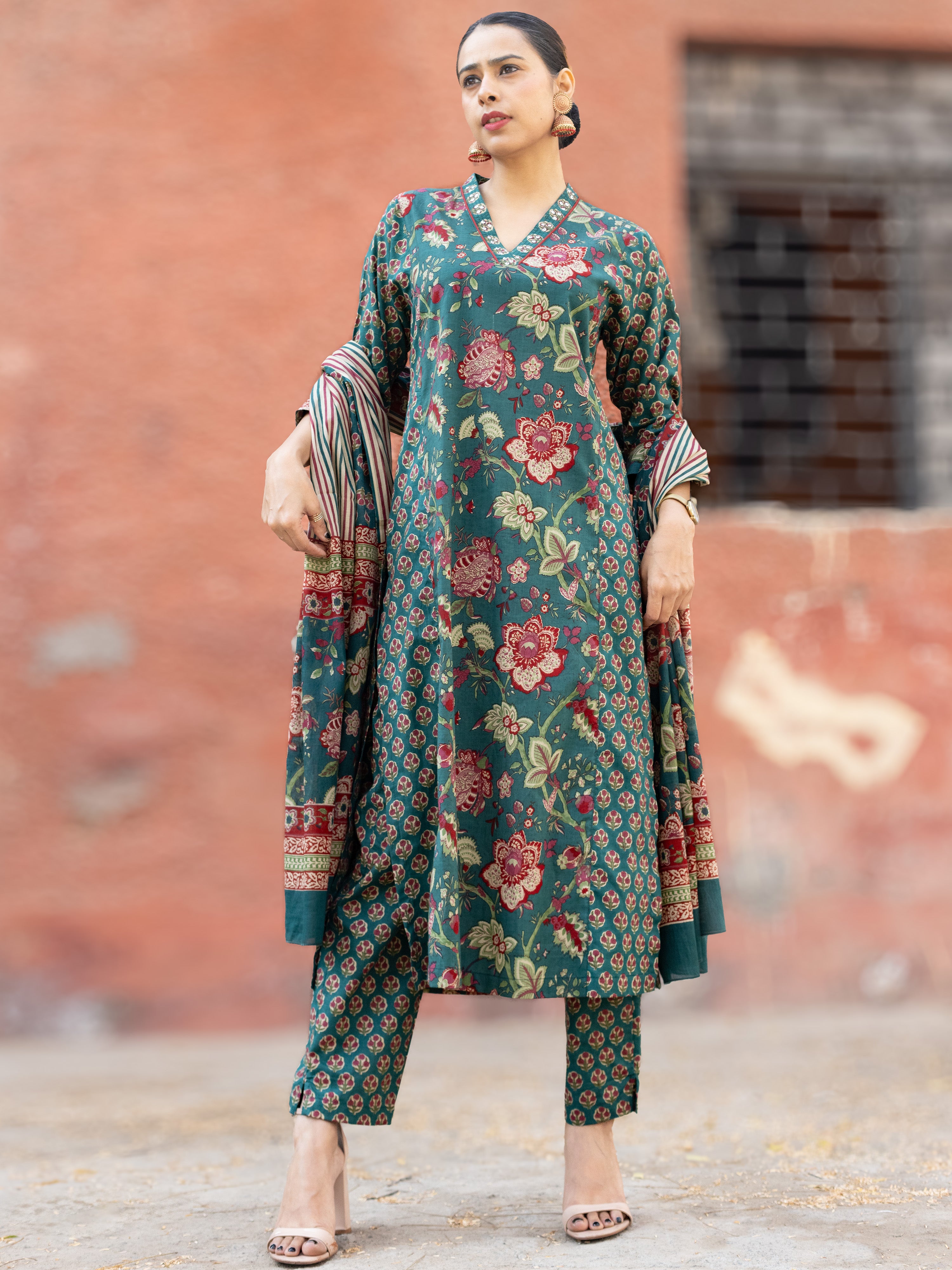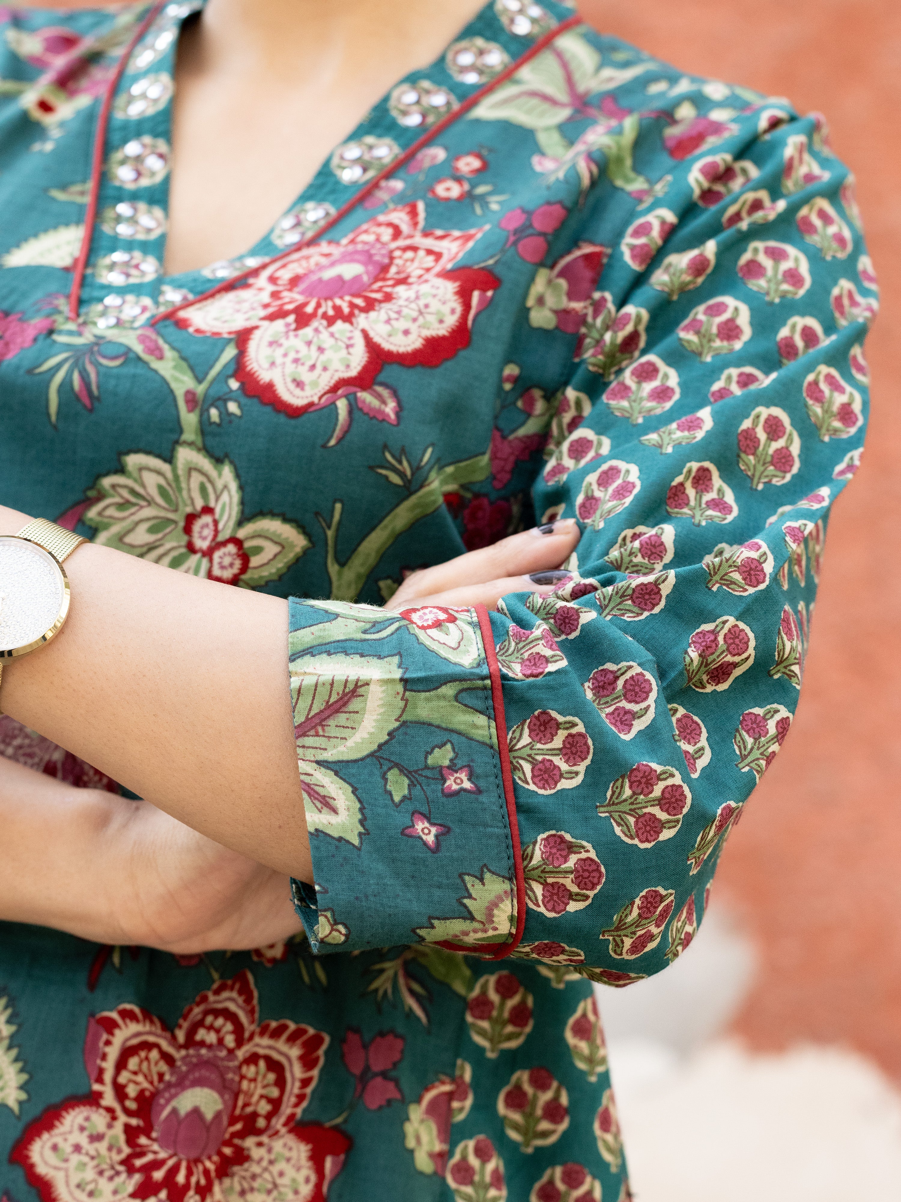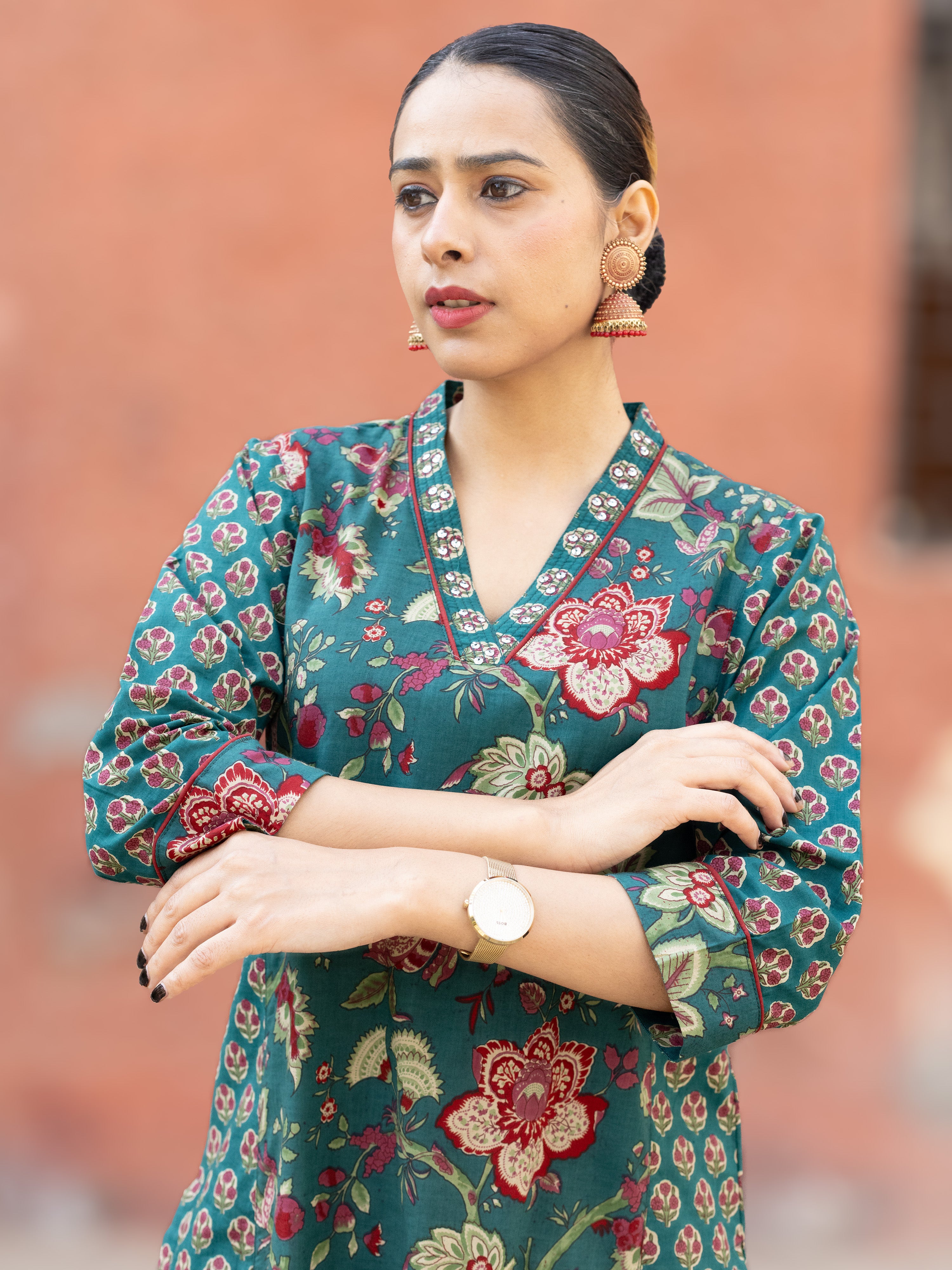 Product: This set contains Handcrafted Sanganeri Premium Cotton Kurta, 100% Cotton Pants and Cotton Dupatta.