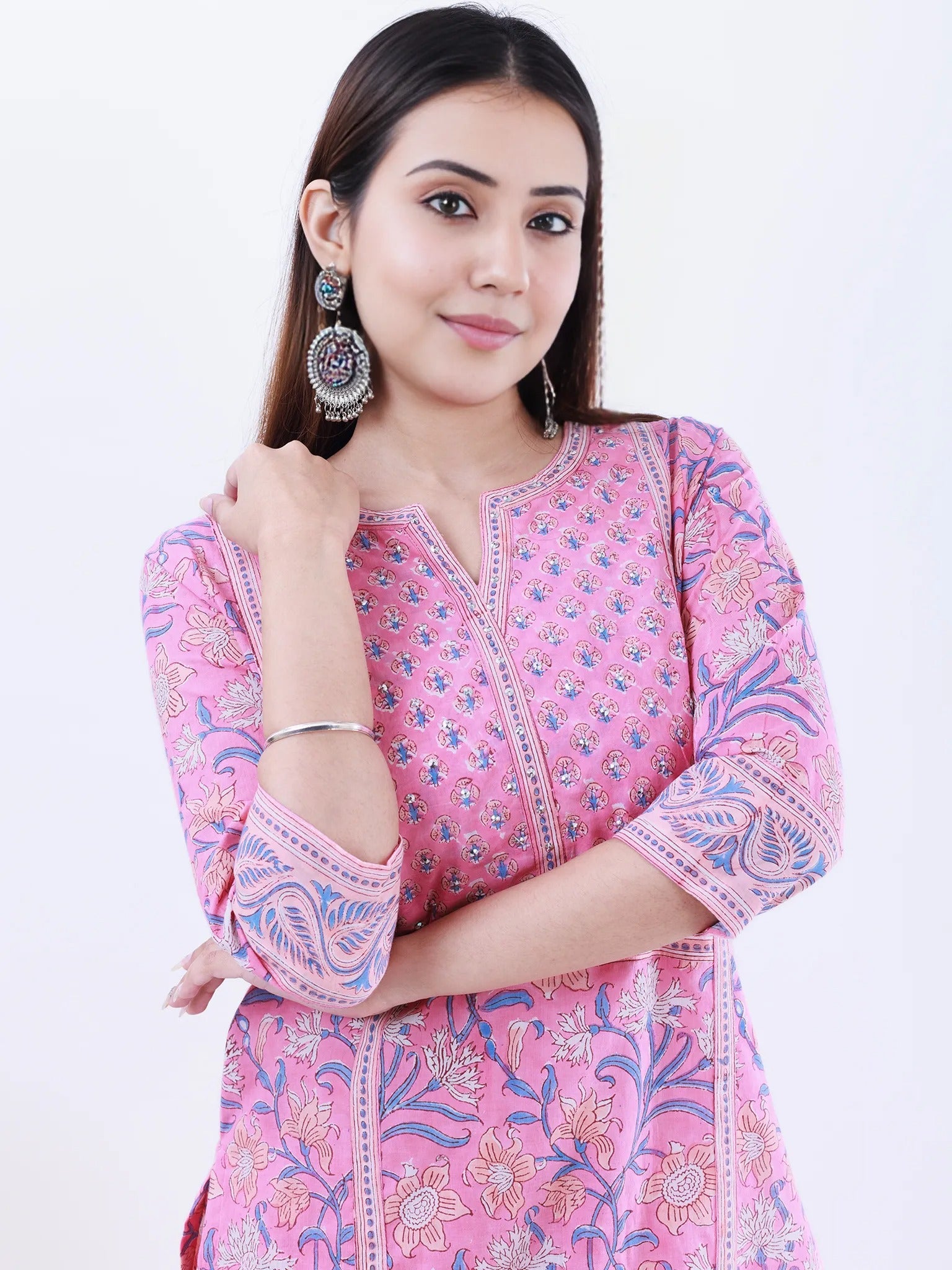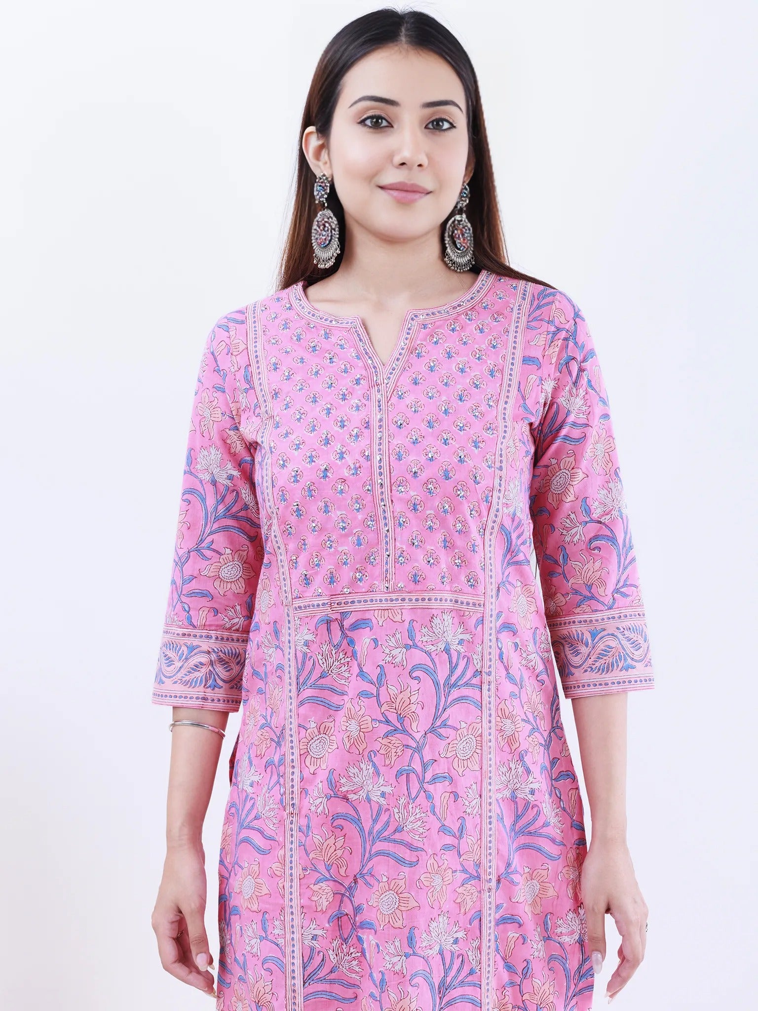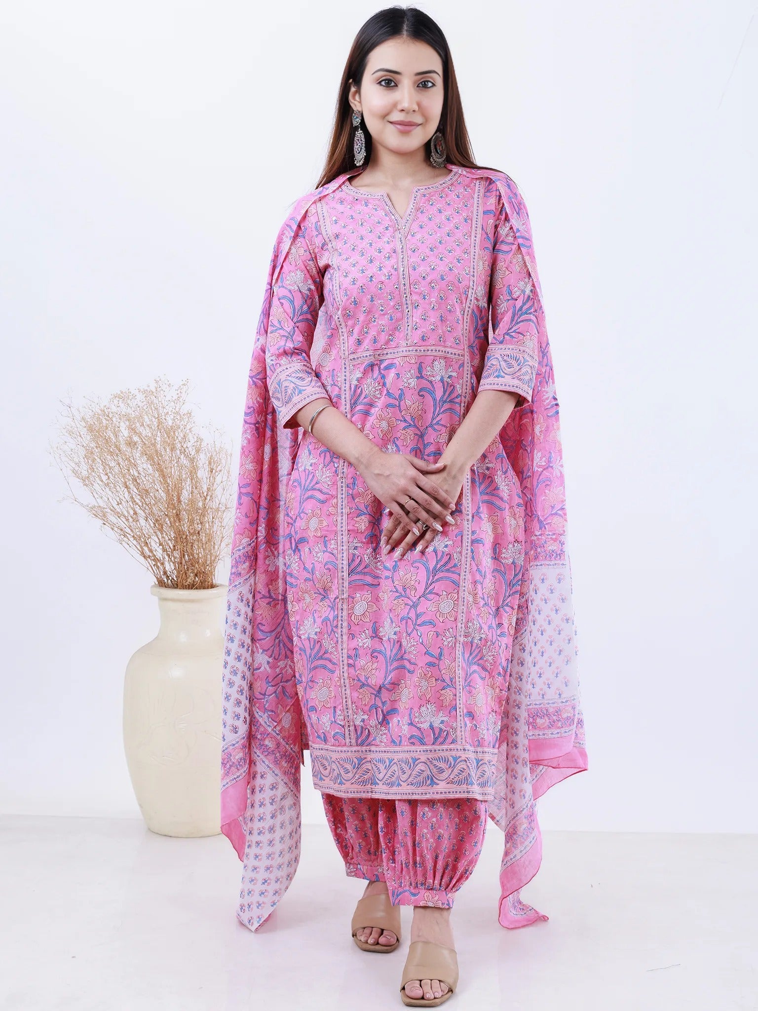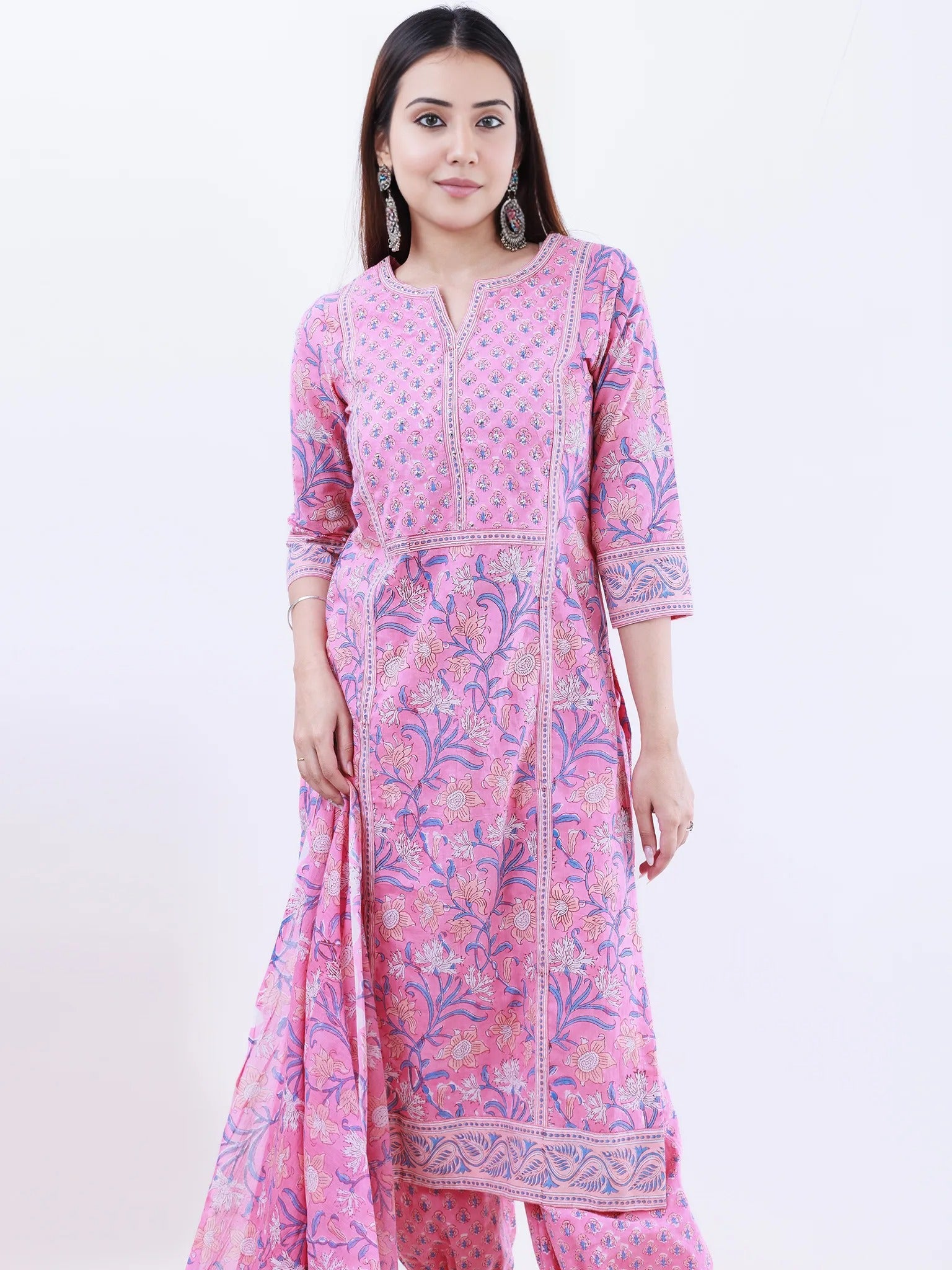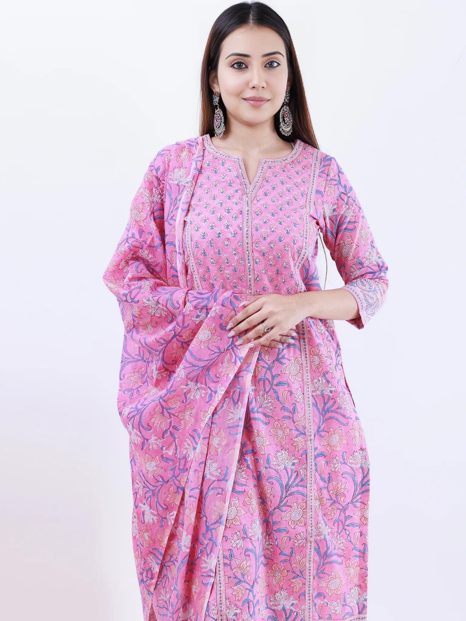Product: This set contains Handcrafted Sanganeri Premium Cotton Kurta, 100% Cotton Pants and Cotton Dupatta.