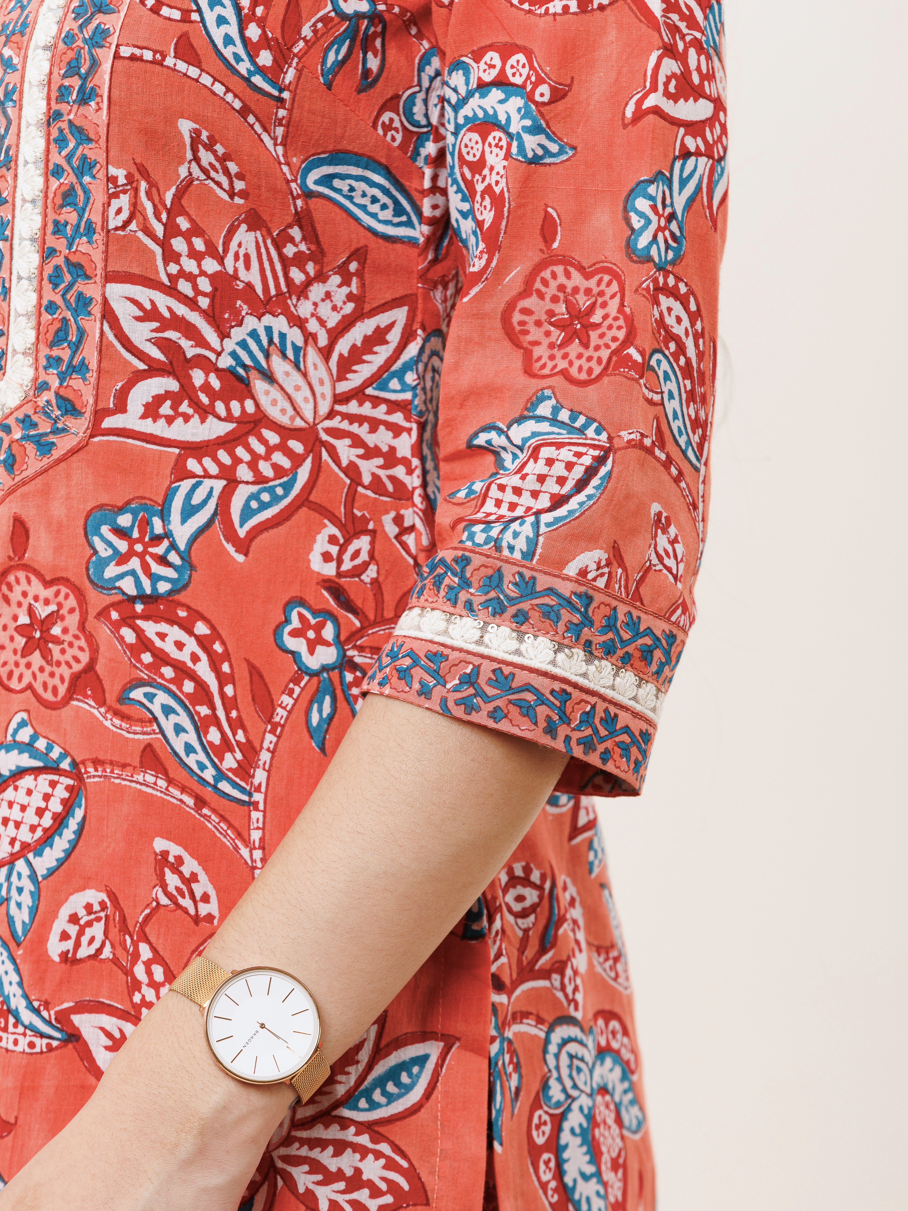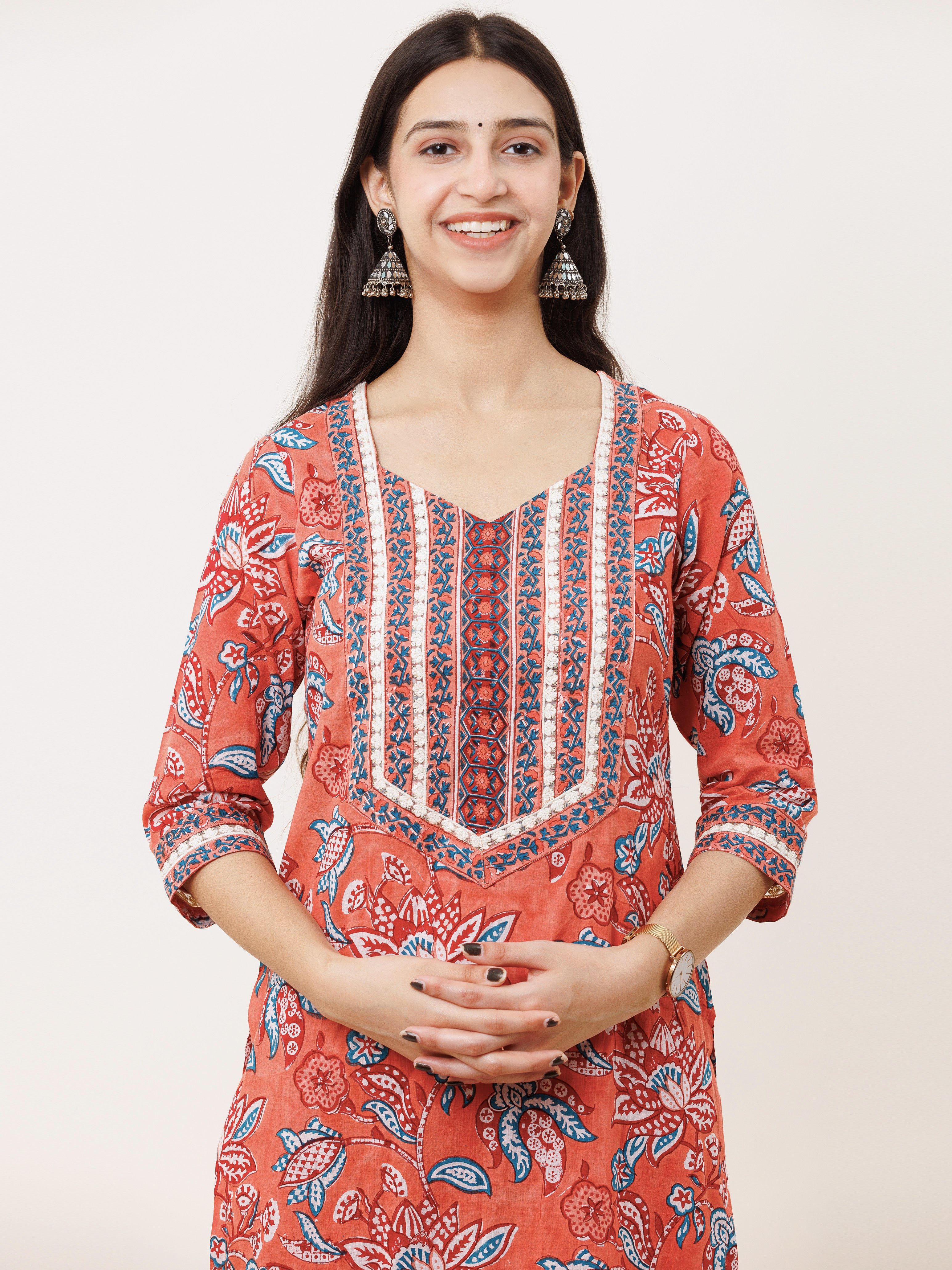 Product: This set contains Handcrafted Sanganeri Premium Cotton Kurta, 100% Cotton Pants and Cotton Dupatta.