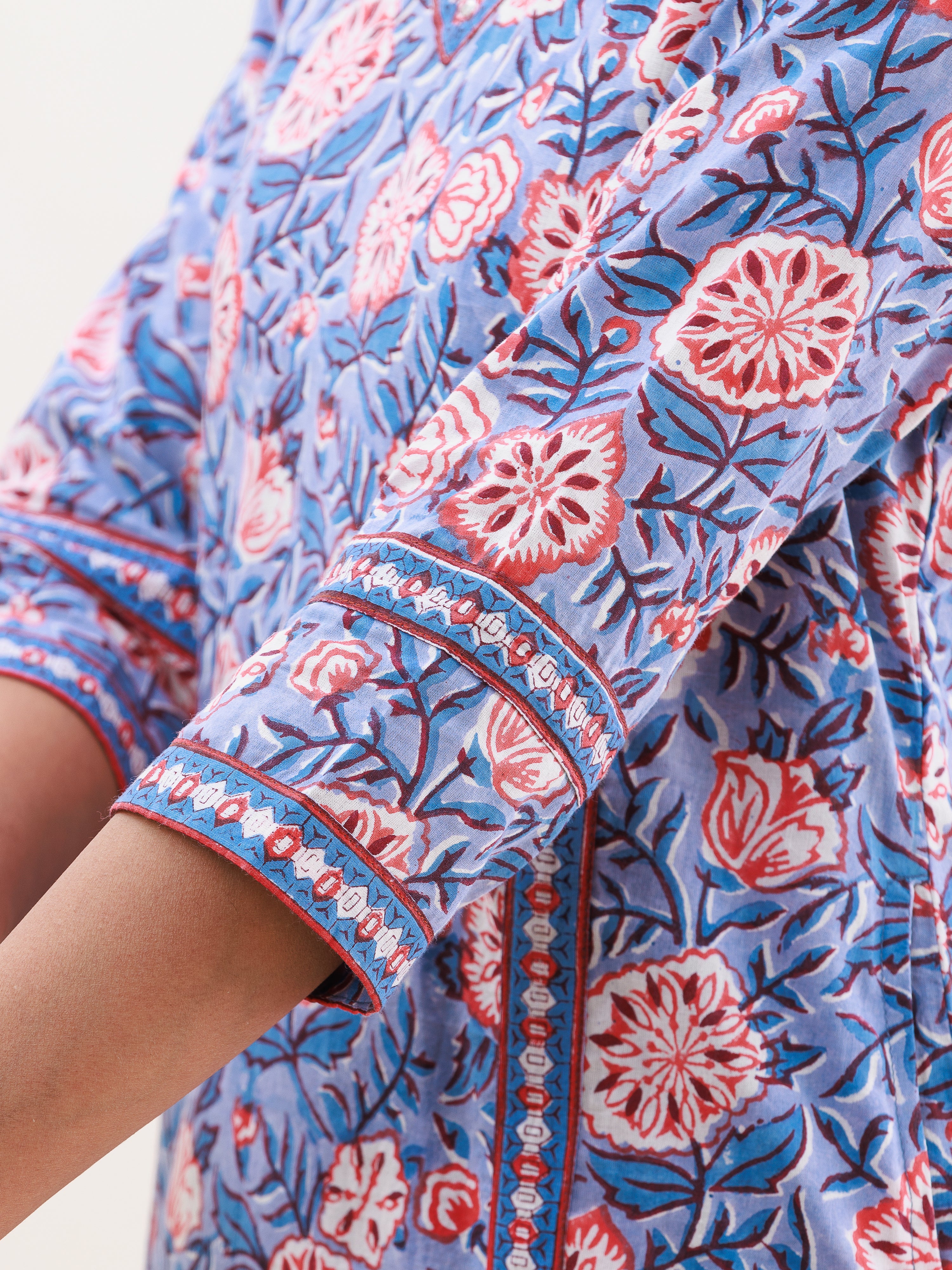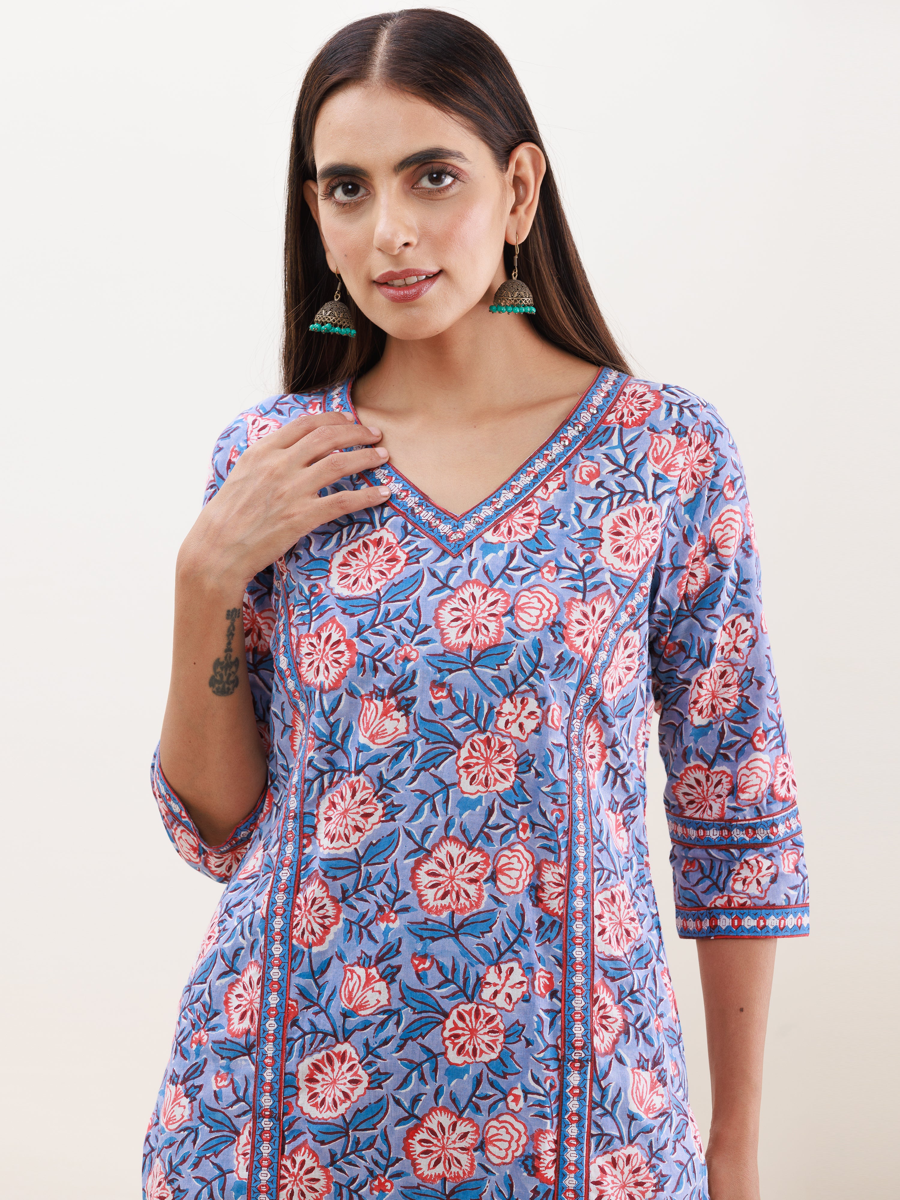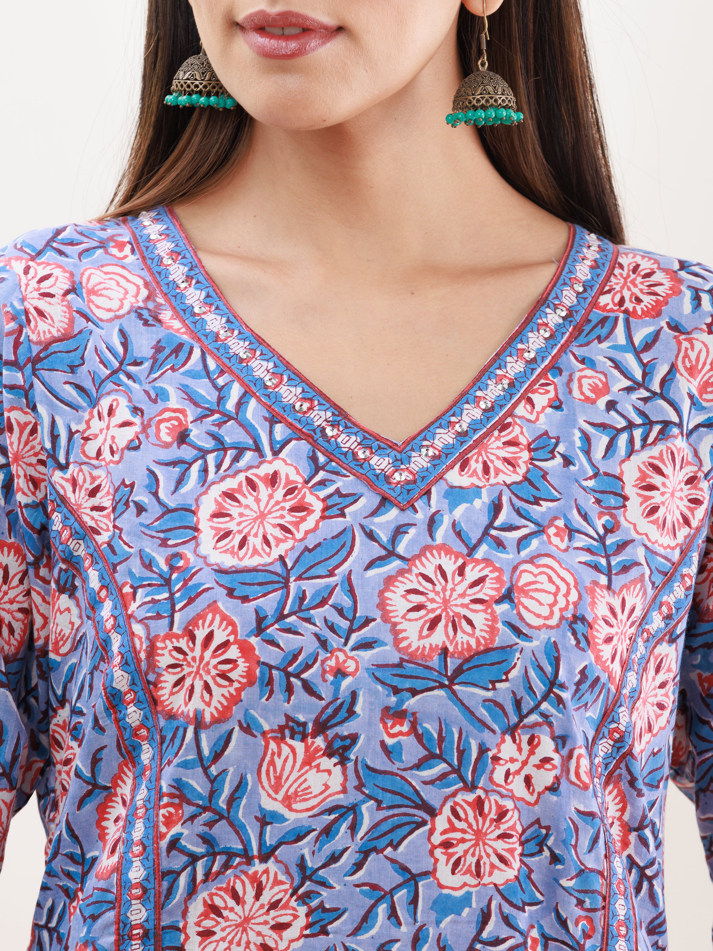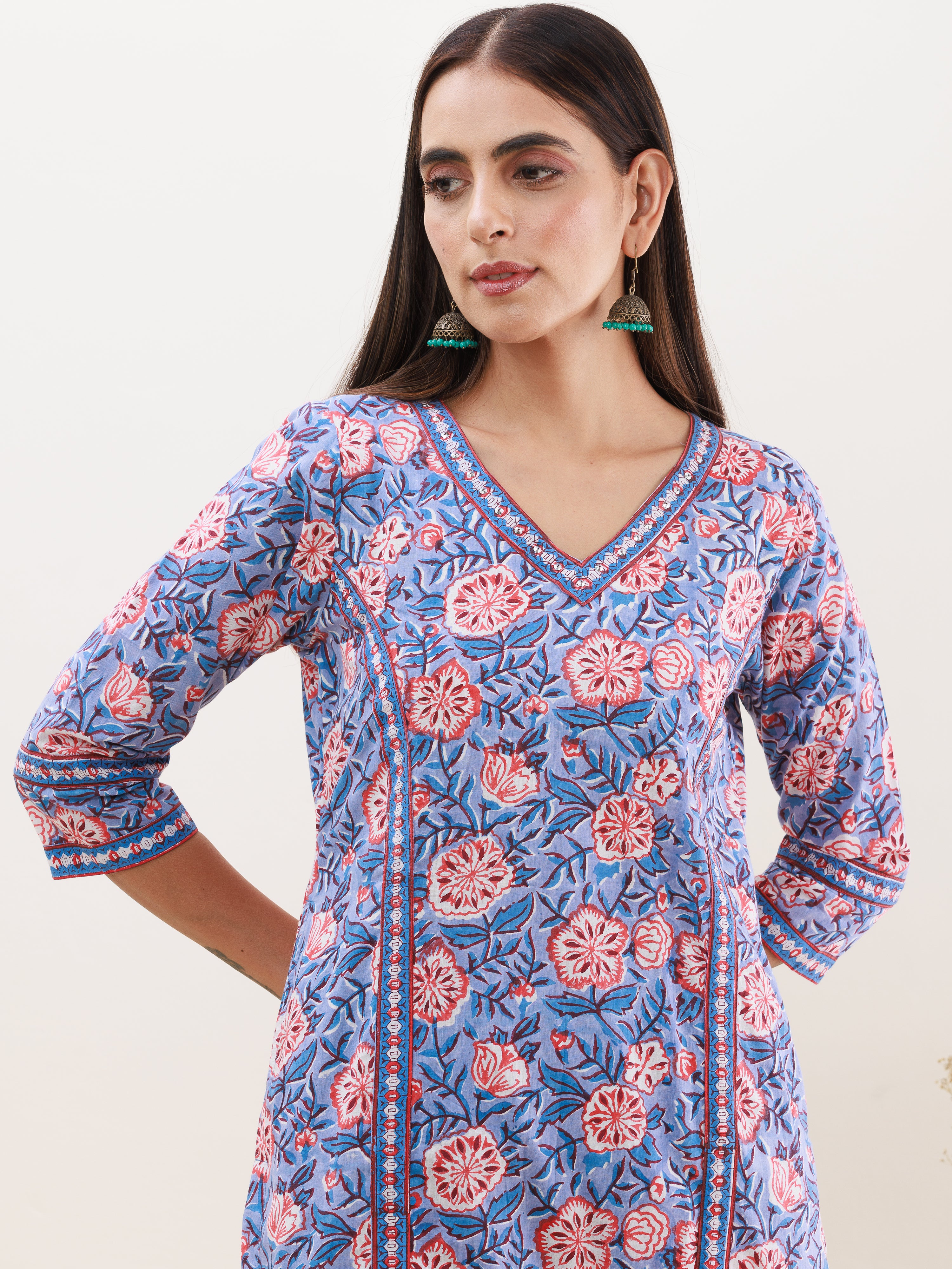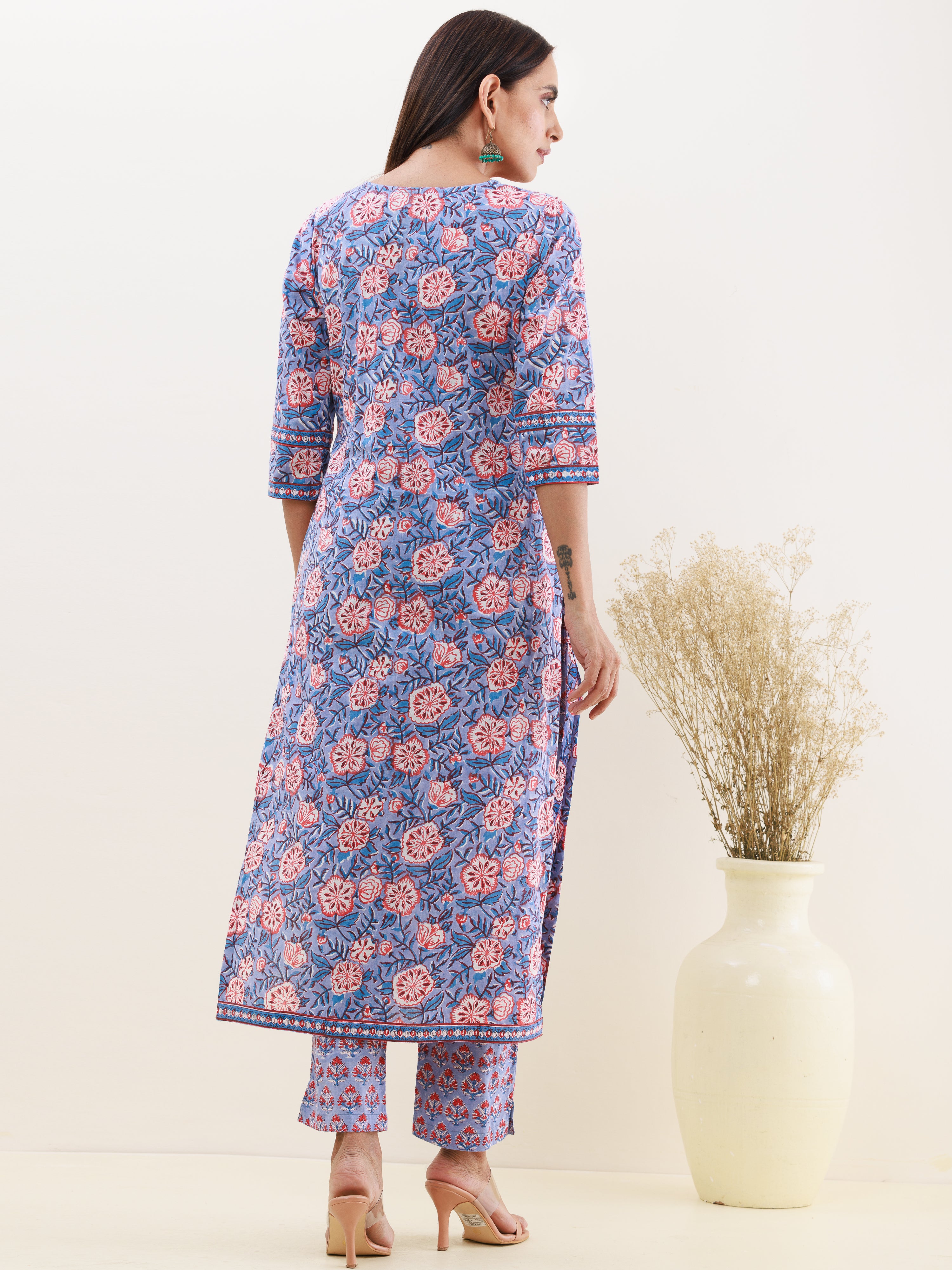 Product: This set contains Handcrafted Sanganeri Premium Cotton Kurta, 100% Cotton Pants and Cotton mulmul Dupatta.