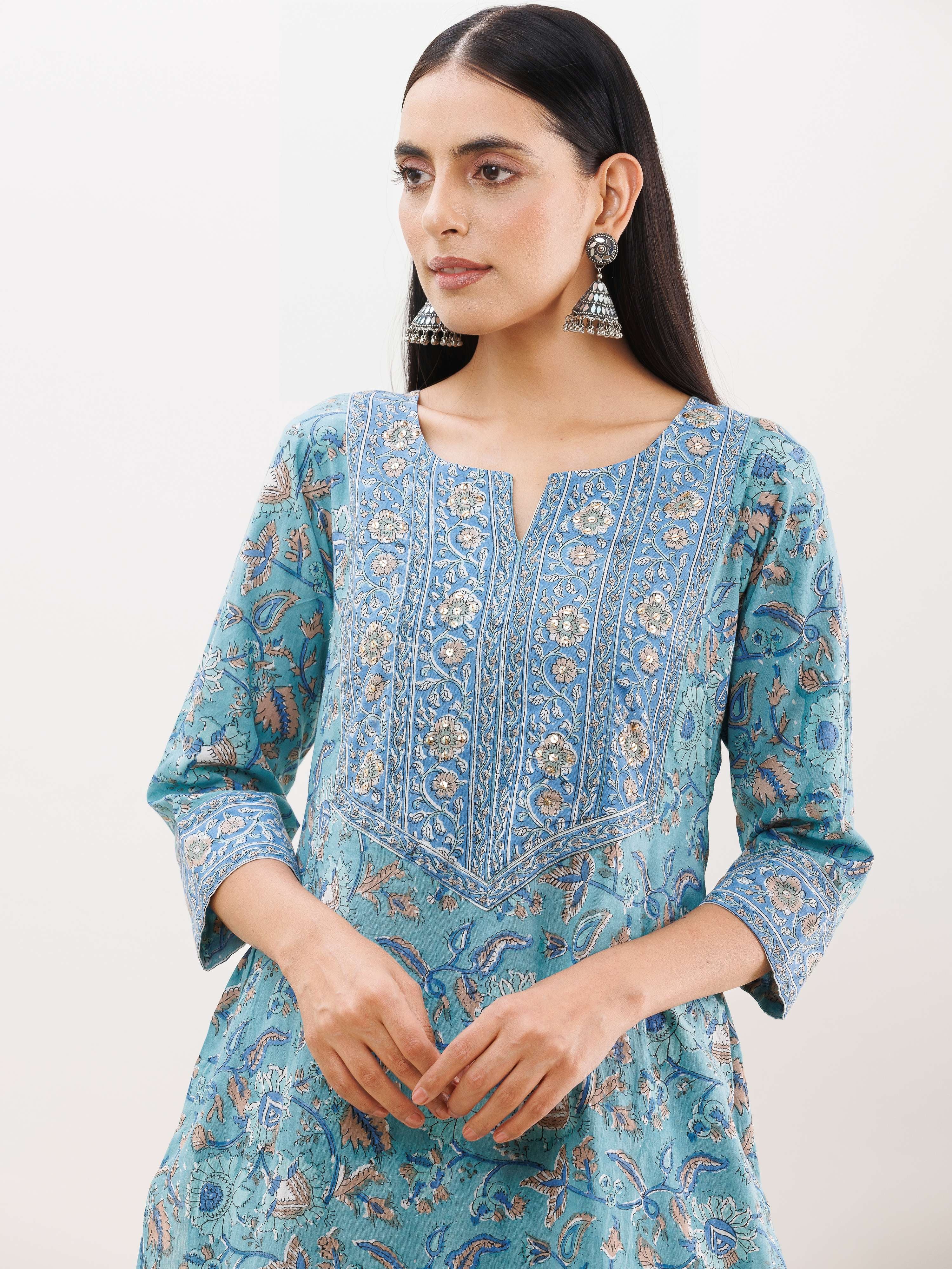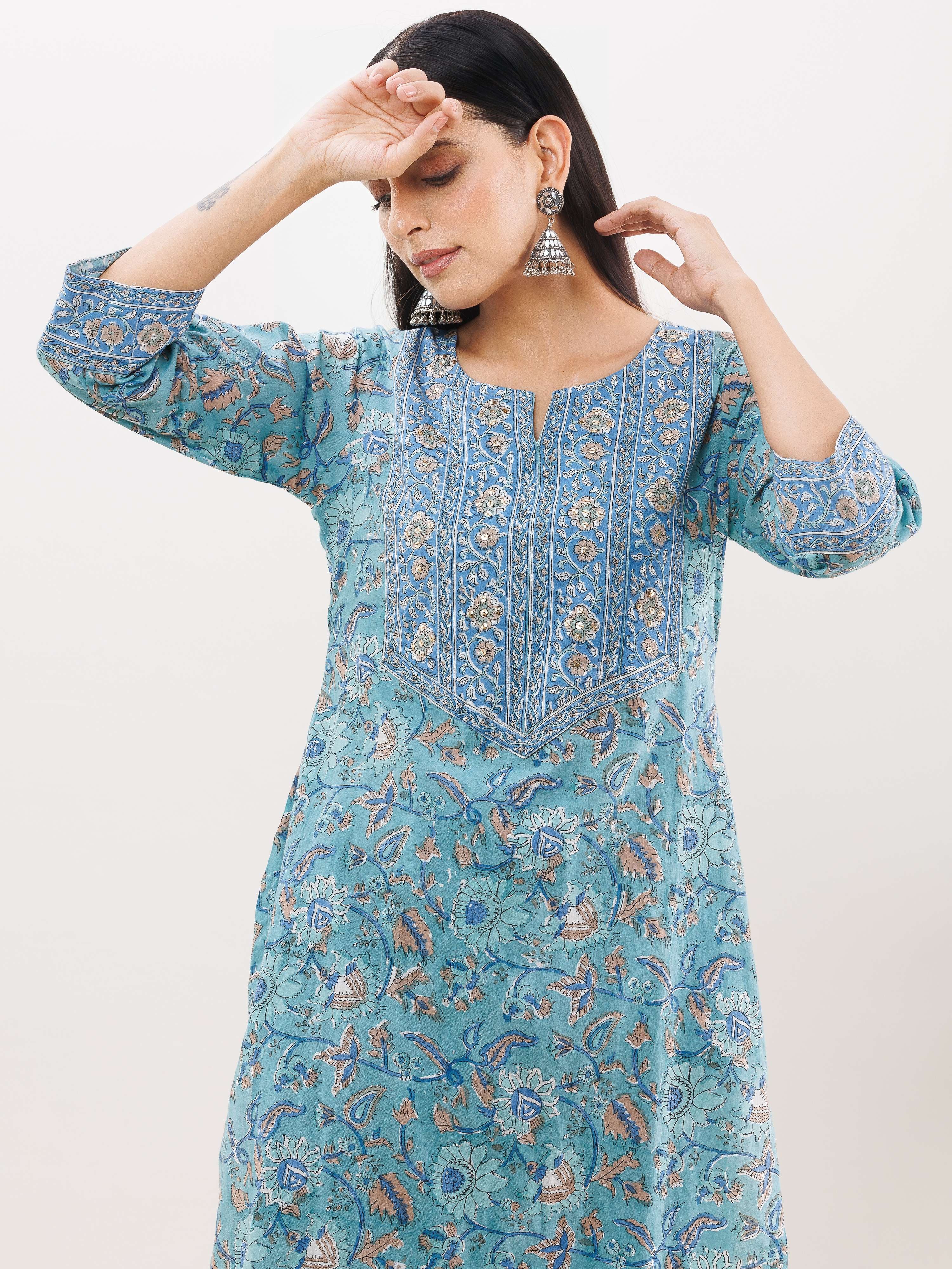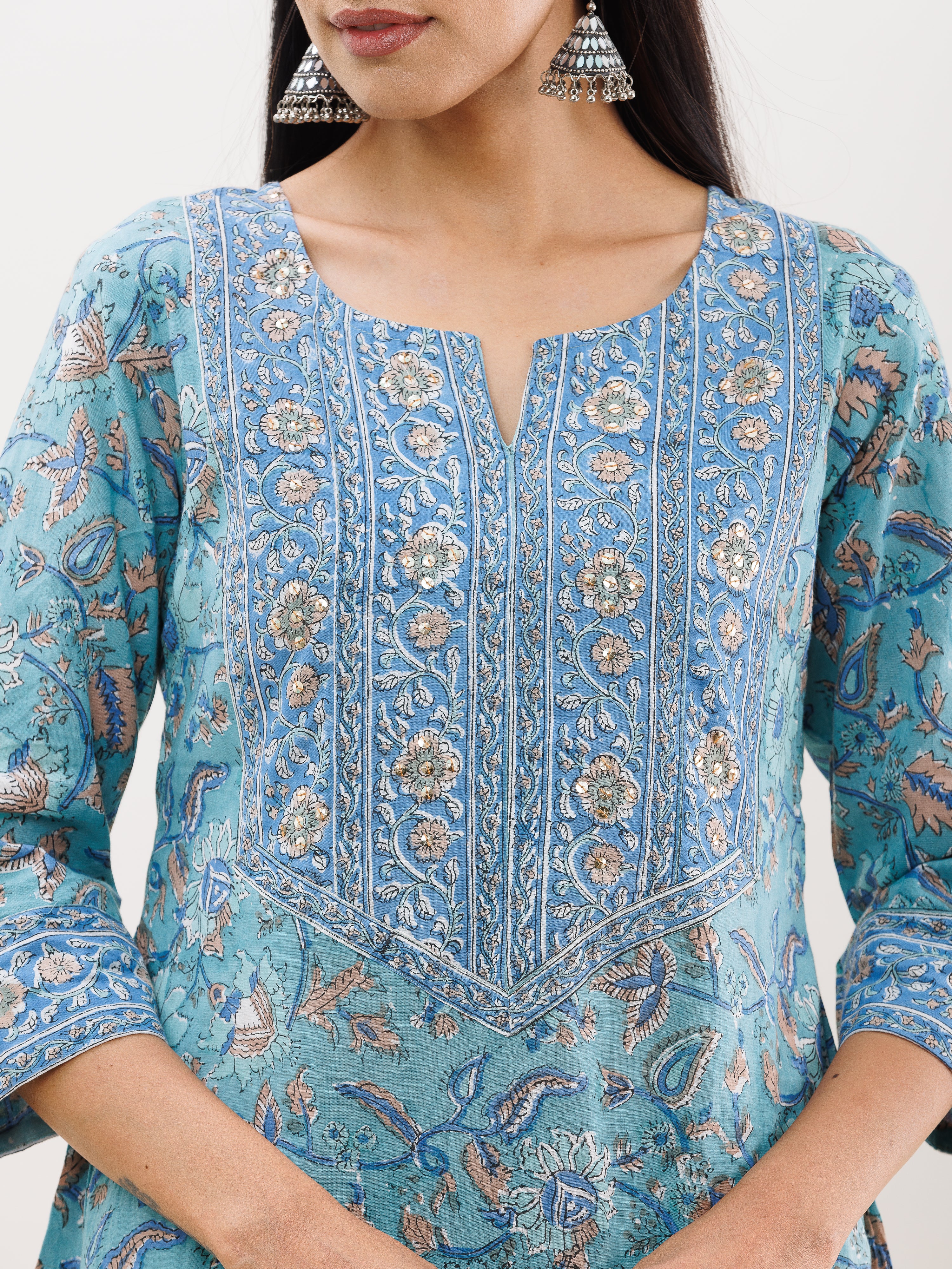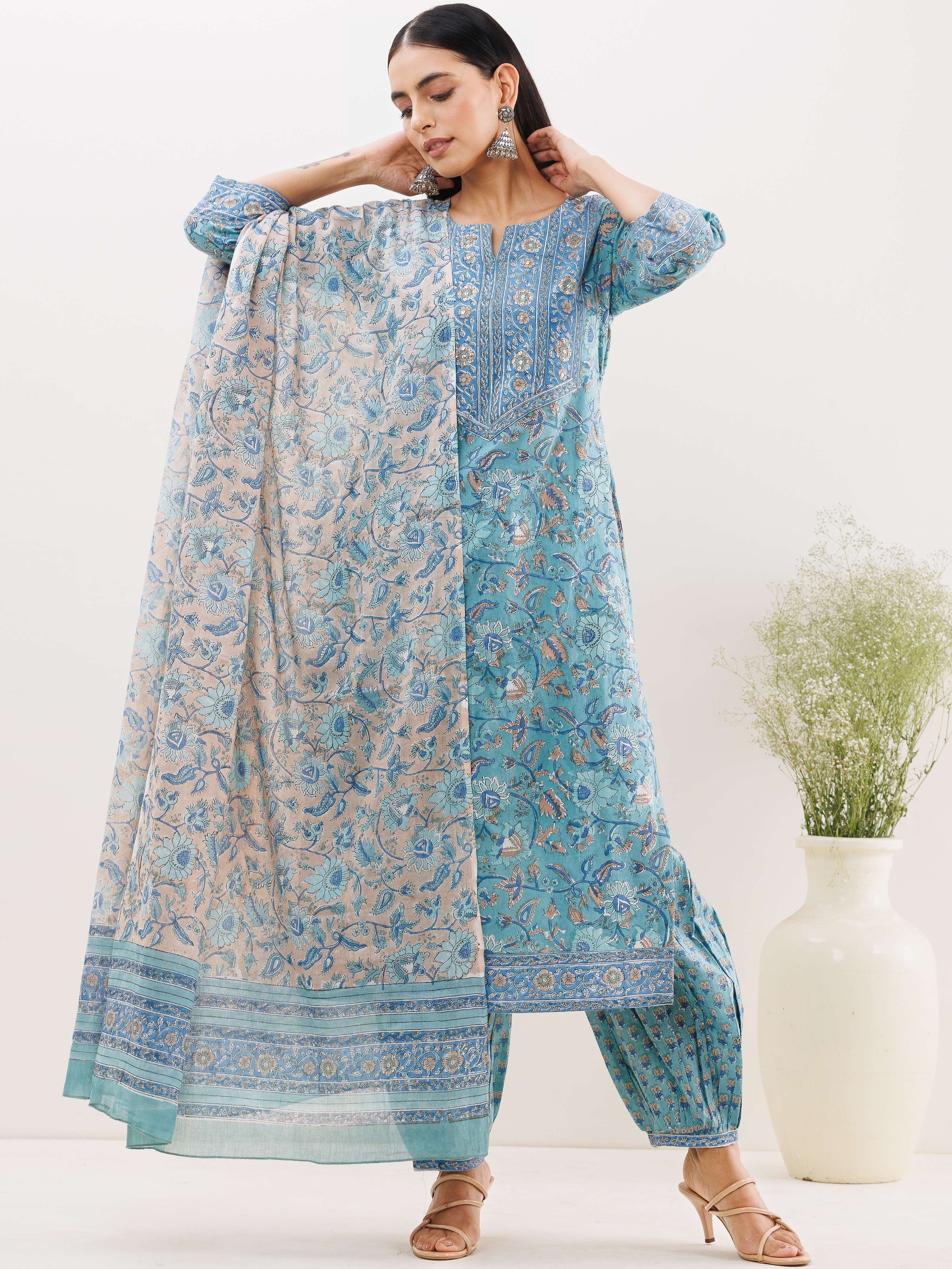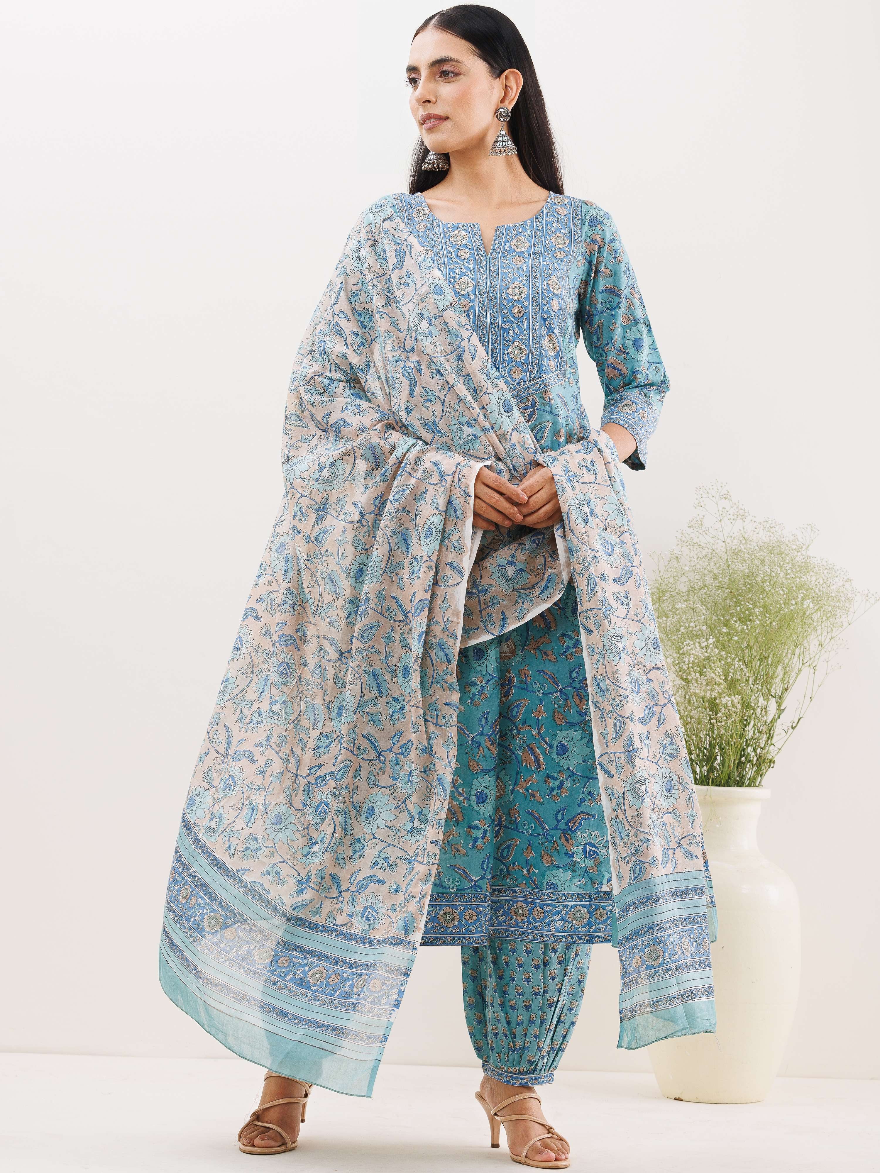 Product: This set contains Handcrafted Sanganeri Premium Cotton Kurta, 100% Cotton Pants and Cotton Mulmul Dupatta.