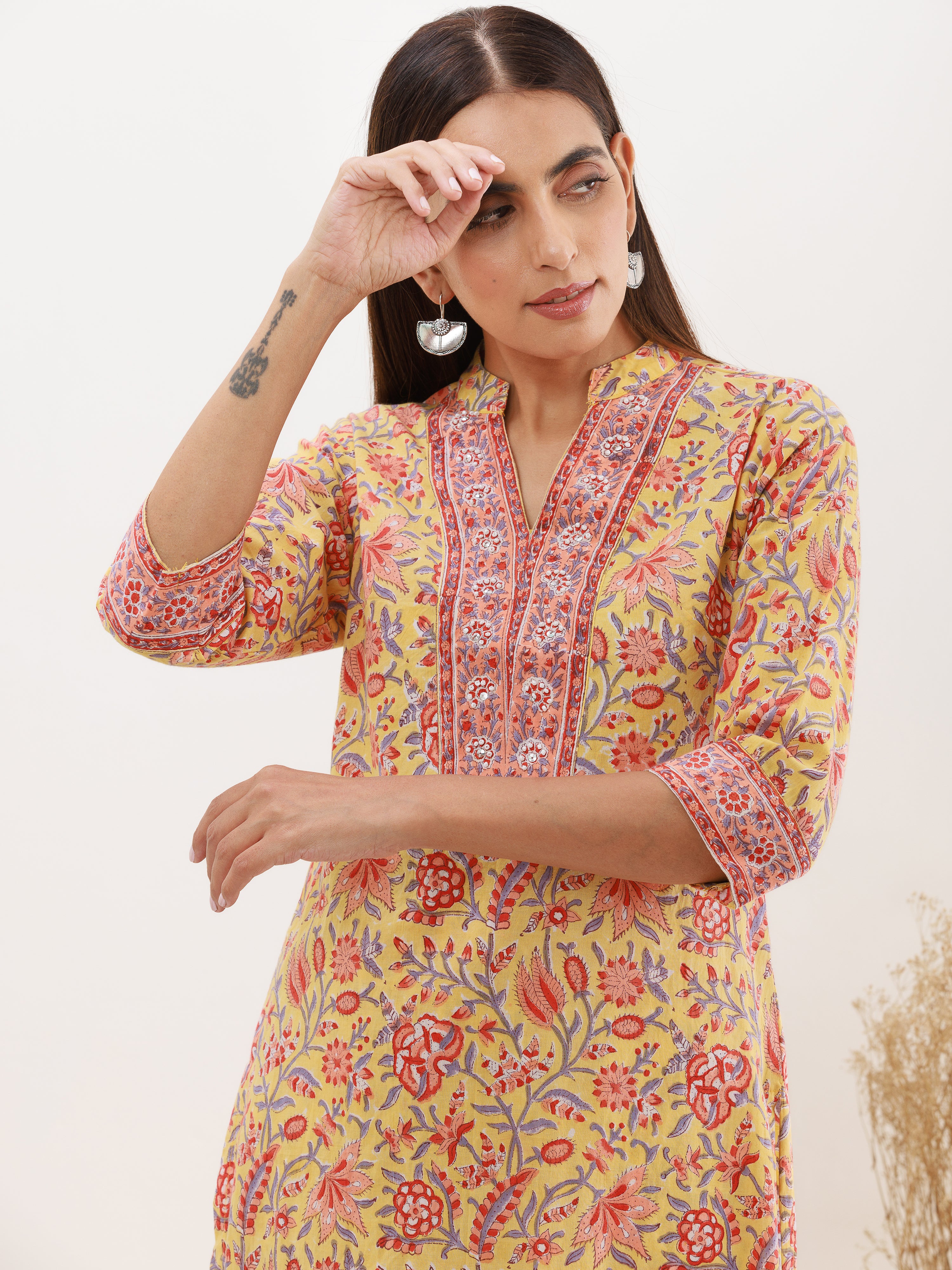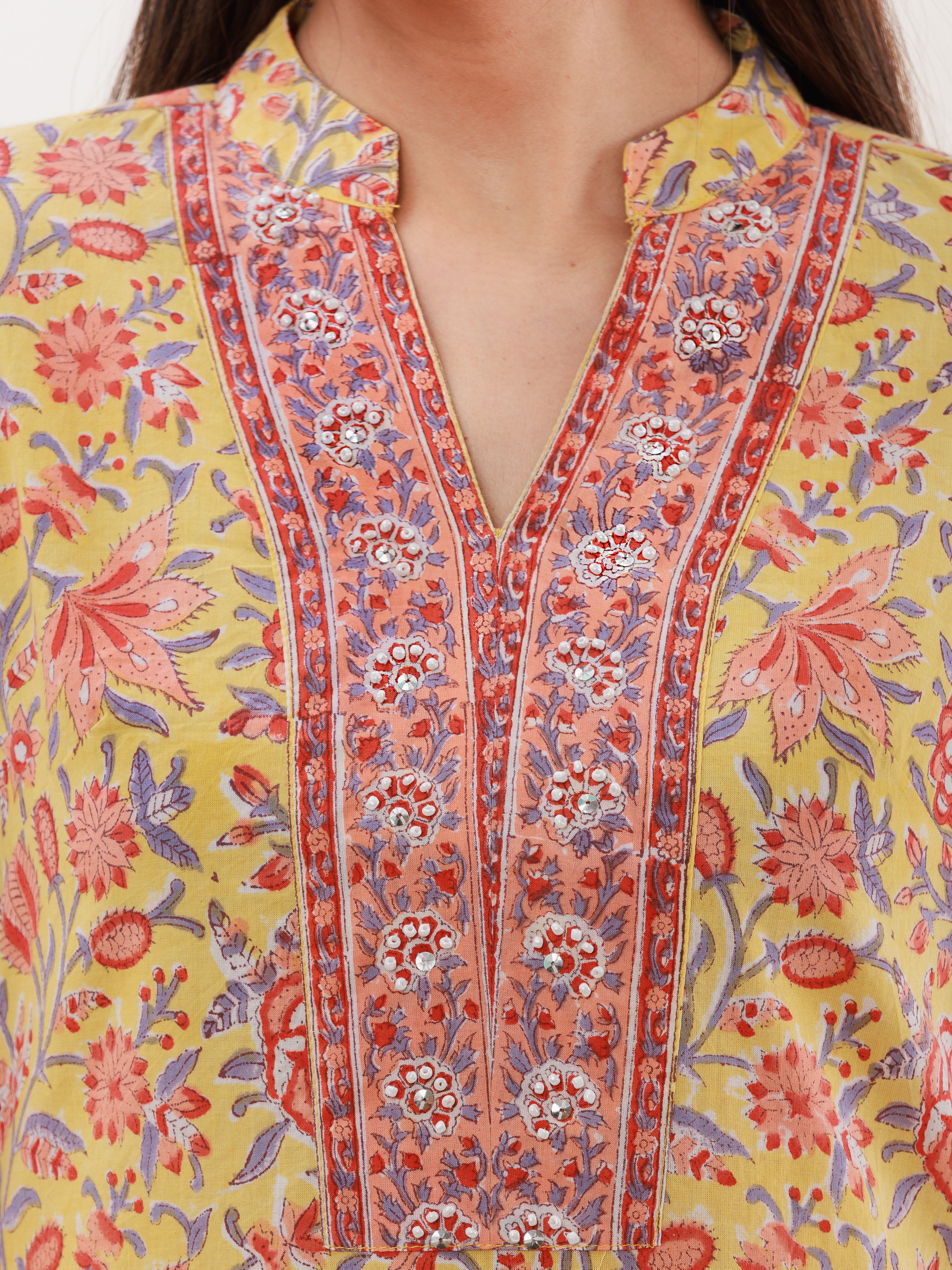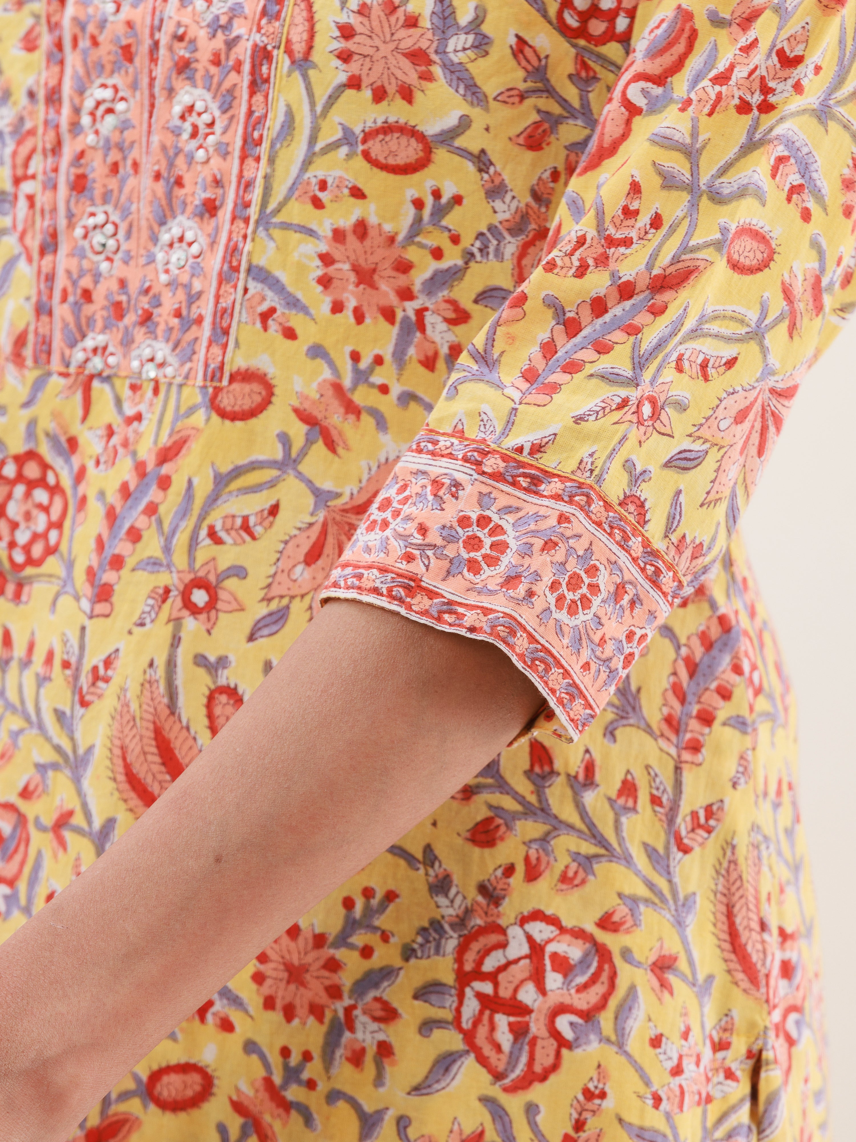Product: This set contains Handcrafted Sanganeri Premium Cotton Kurta, 100% Cotton Pants and Cotton Dupatta.