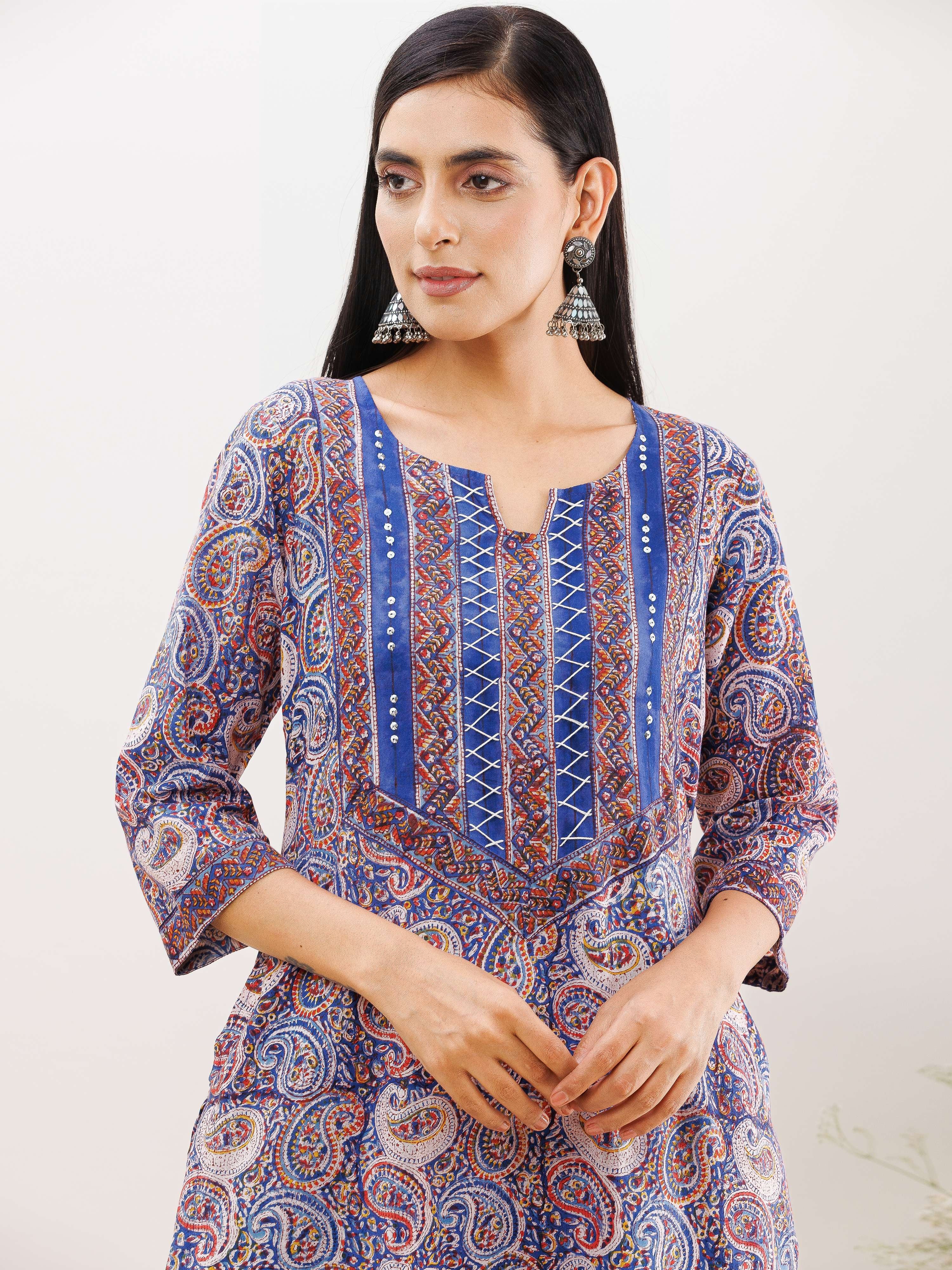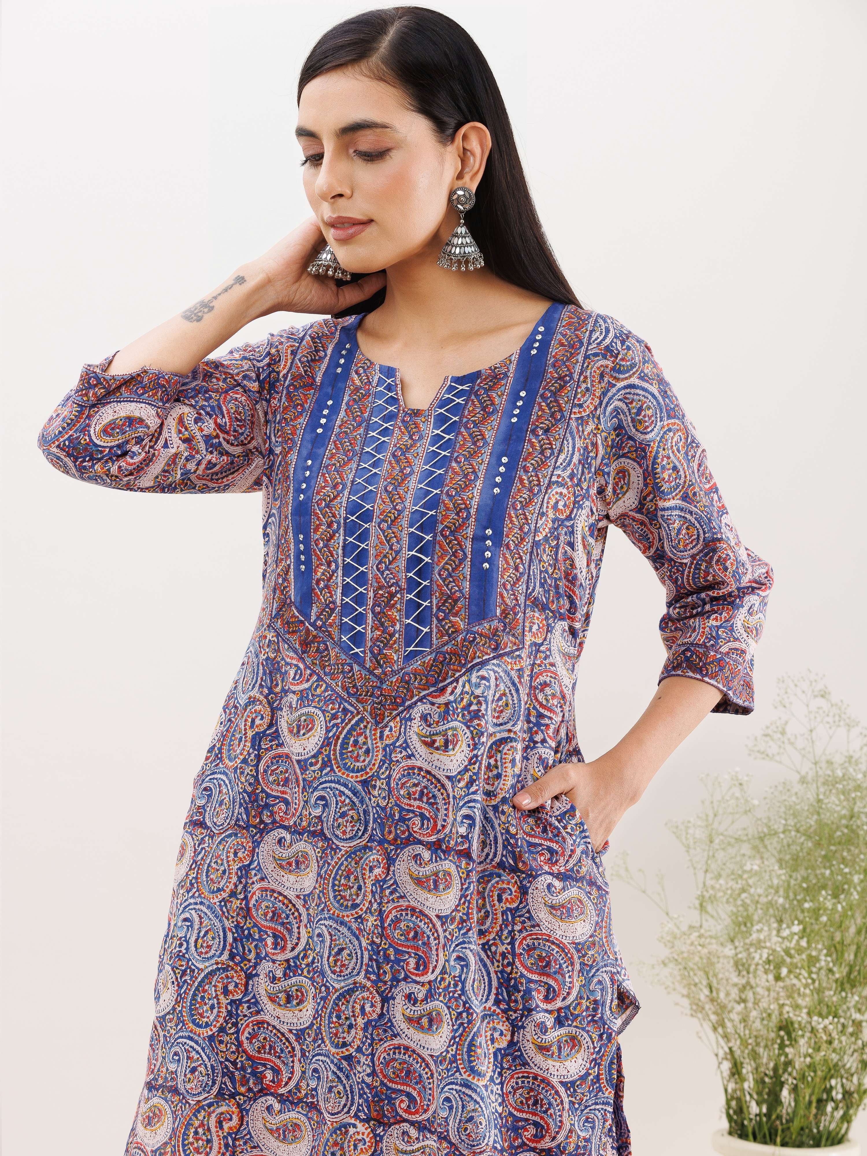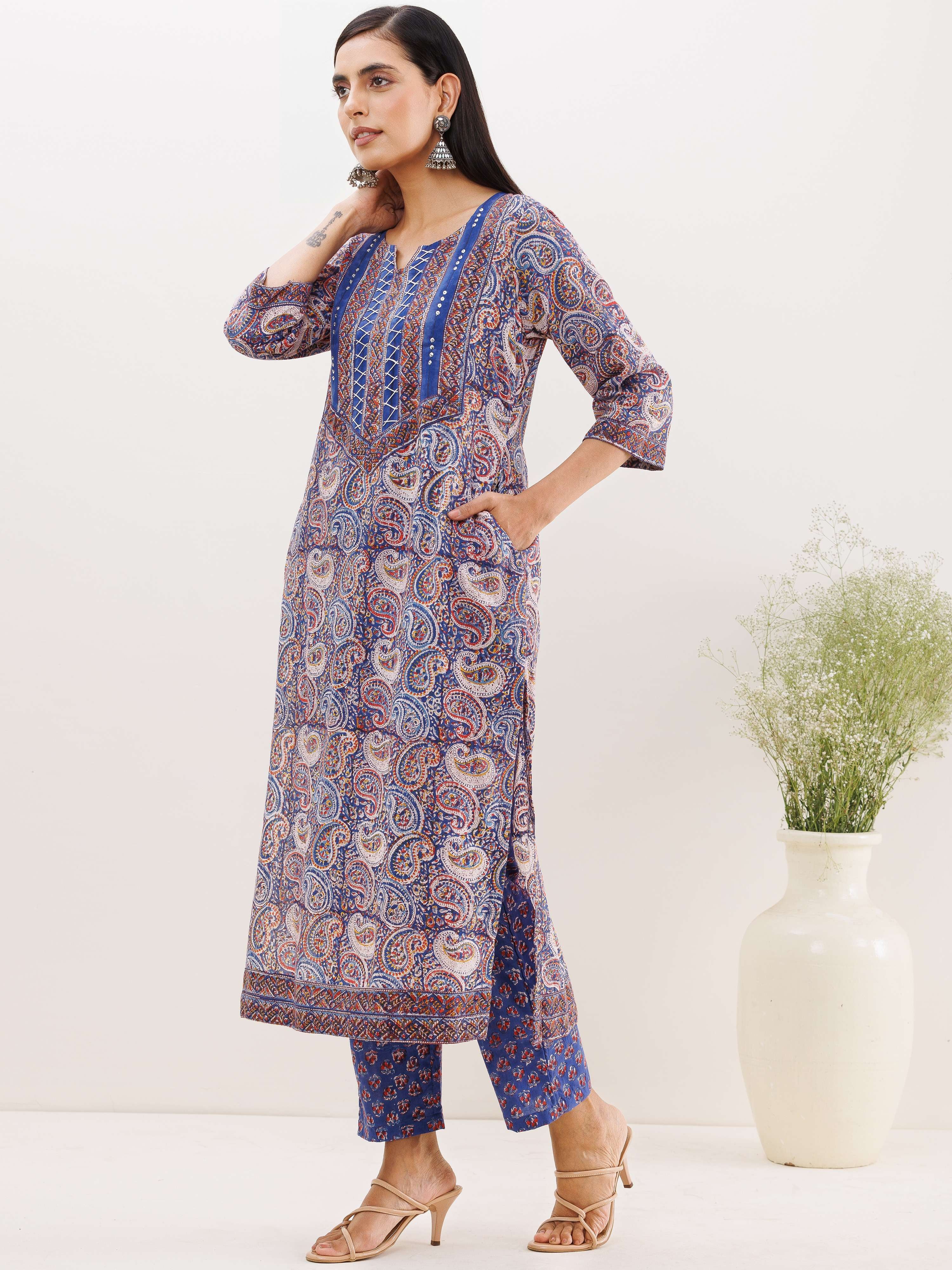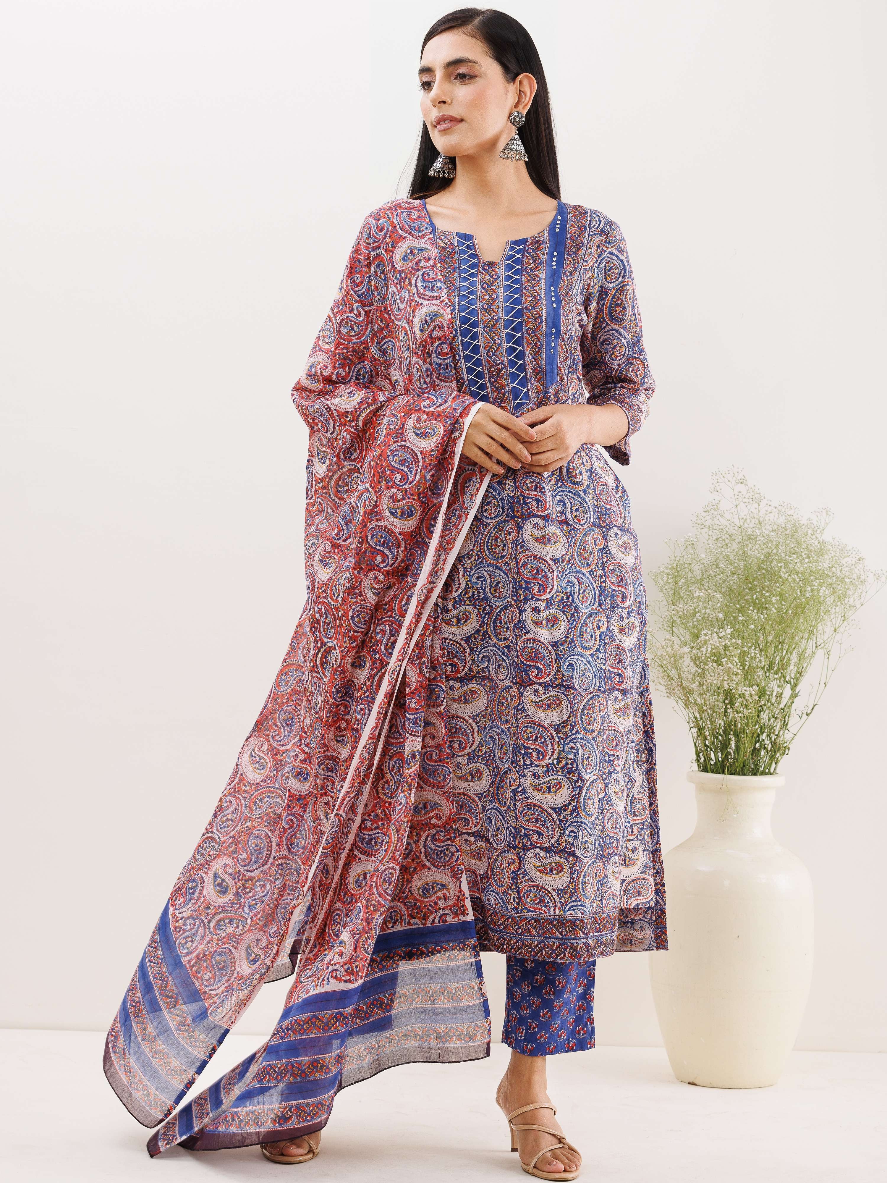 Product: This set contains Handcrafted Sanganeri Premium Cotton Kurta, 100% Cotton Pants and Cotton Mulmul Dupatta.