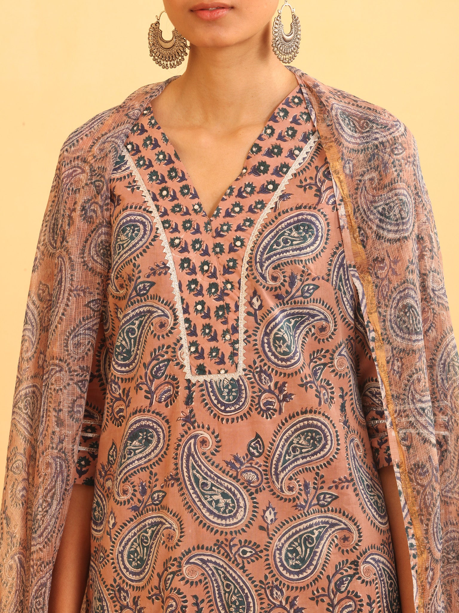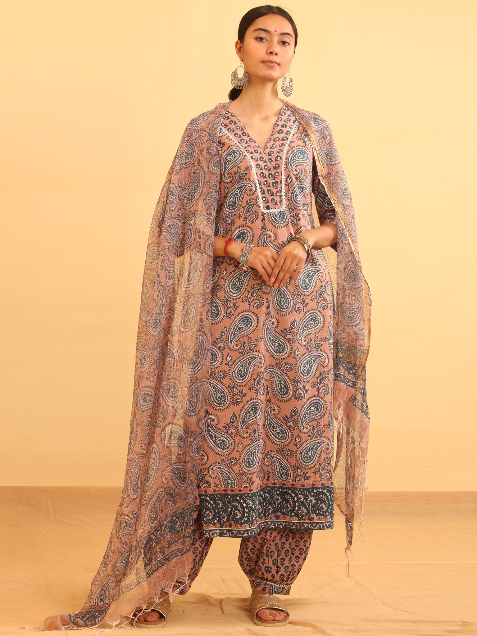 Product: This set contains Handcrafted Sanganeri Premium Cotton Kurta, 100% Cotton Pants and Kota Doria Dupatta.