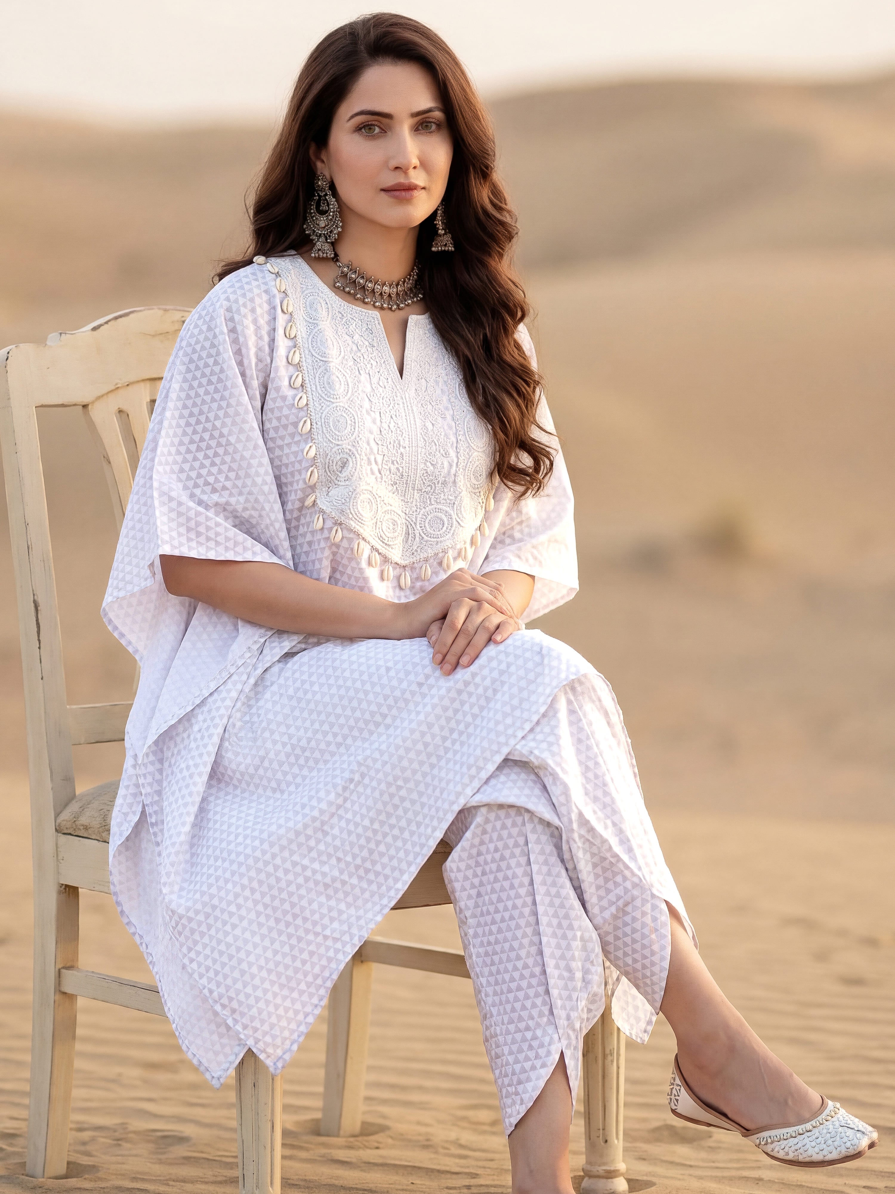Safed Riya Set Of Kaftan & Tulip Dhoti Pants