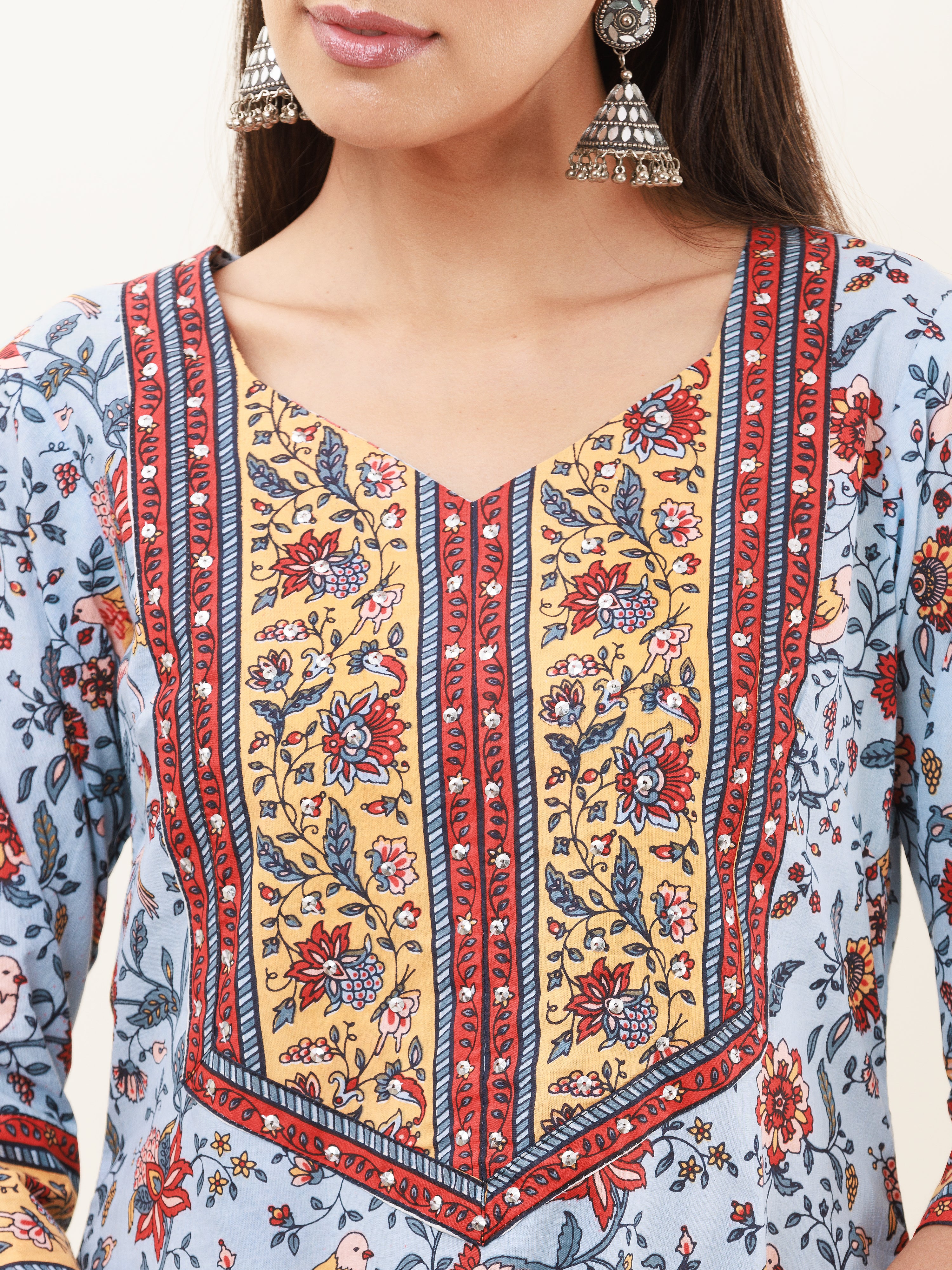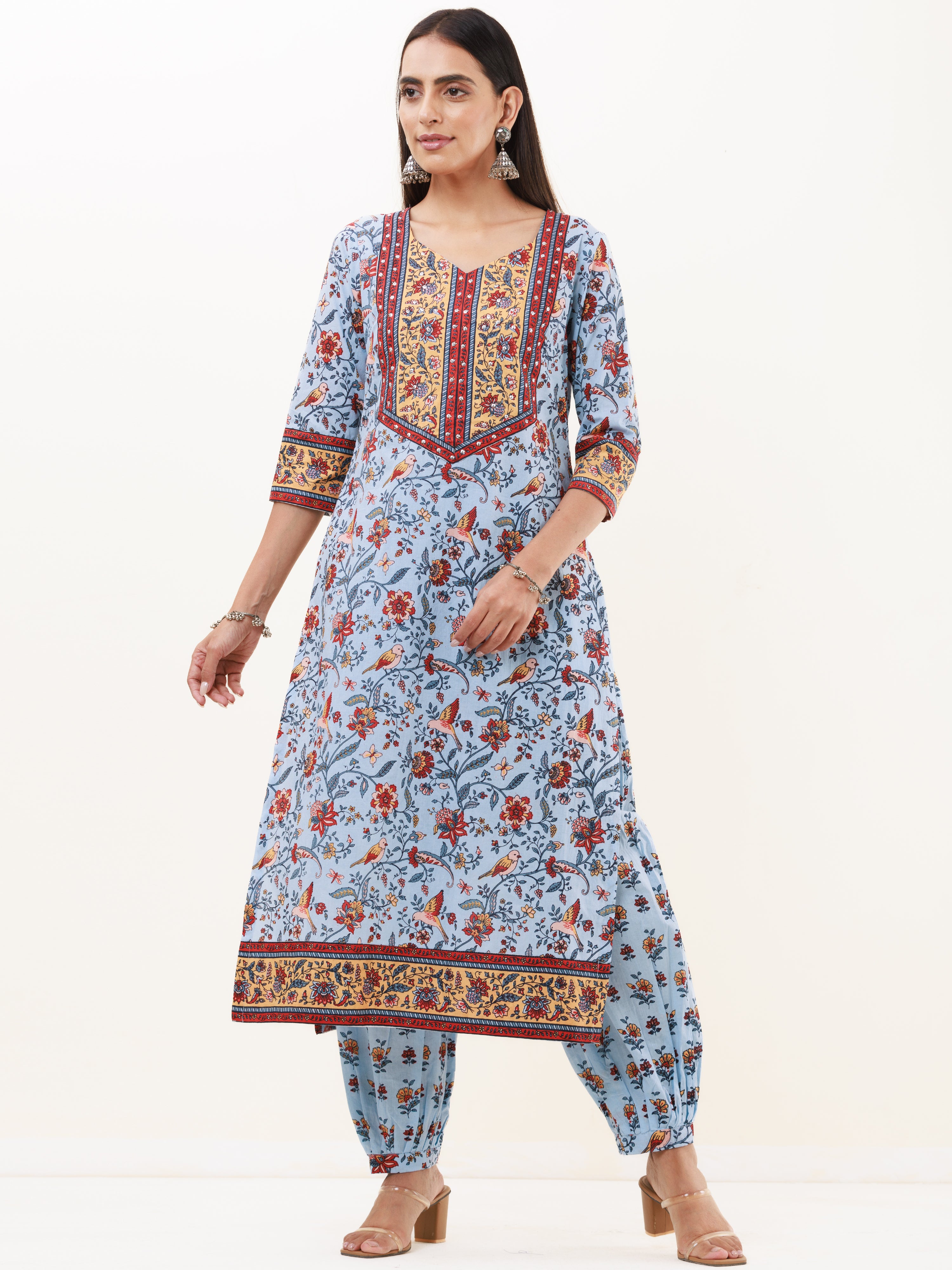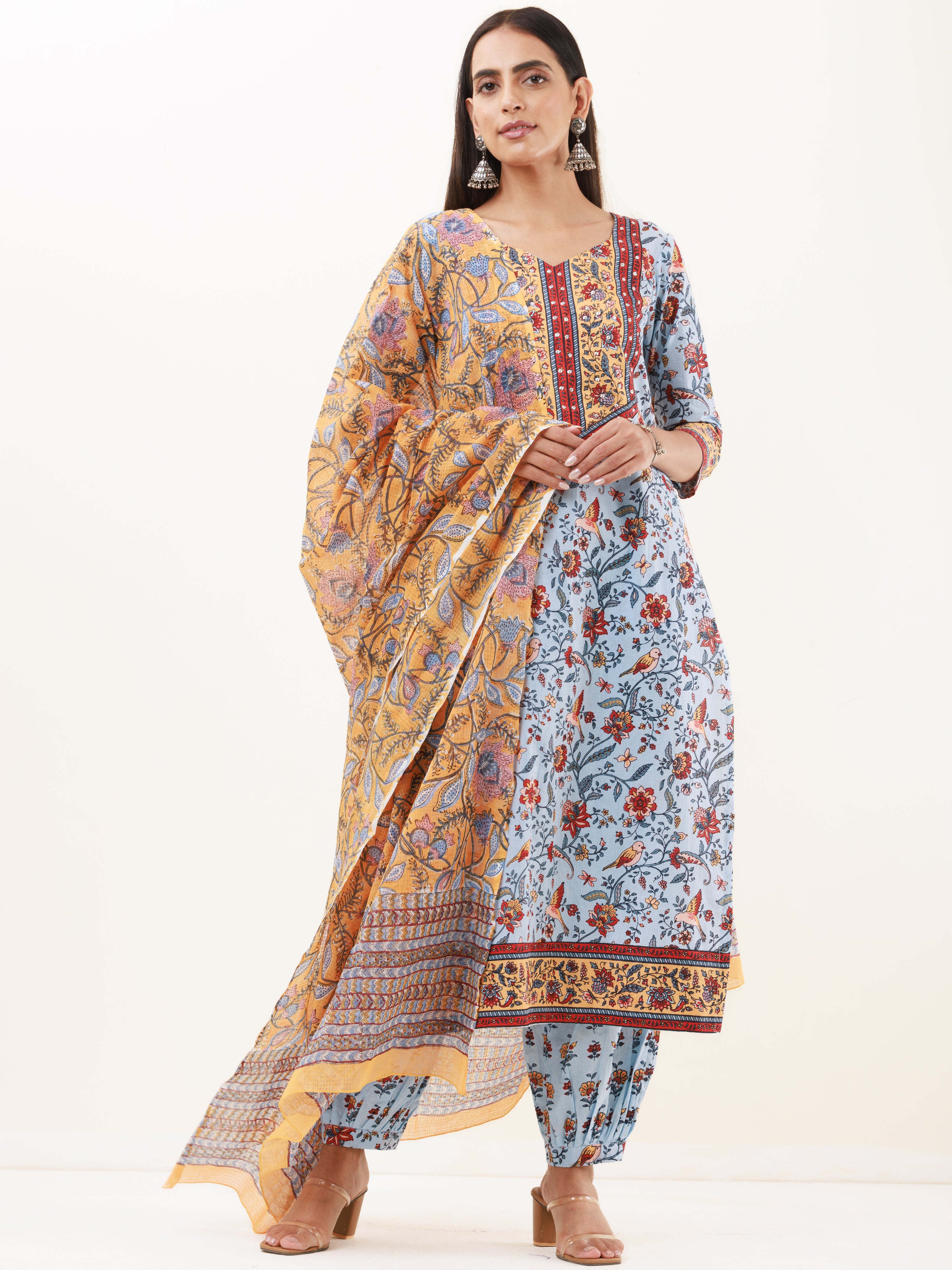 Product: This set contains Handcrafted Sanganeri Premium Cotton Kurta, 100% Cotton Pants and Kota Doria Dupatta.