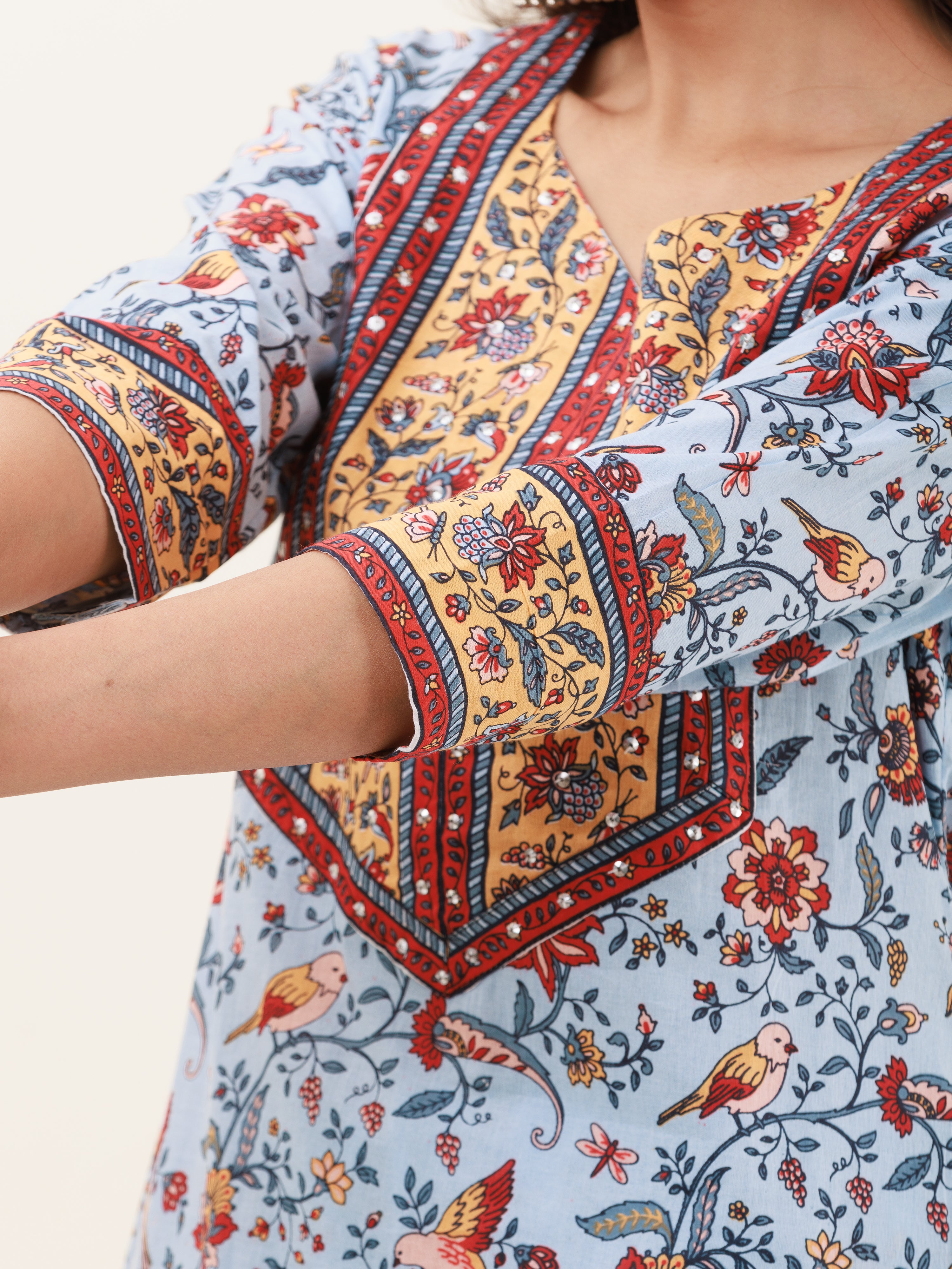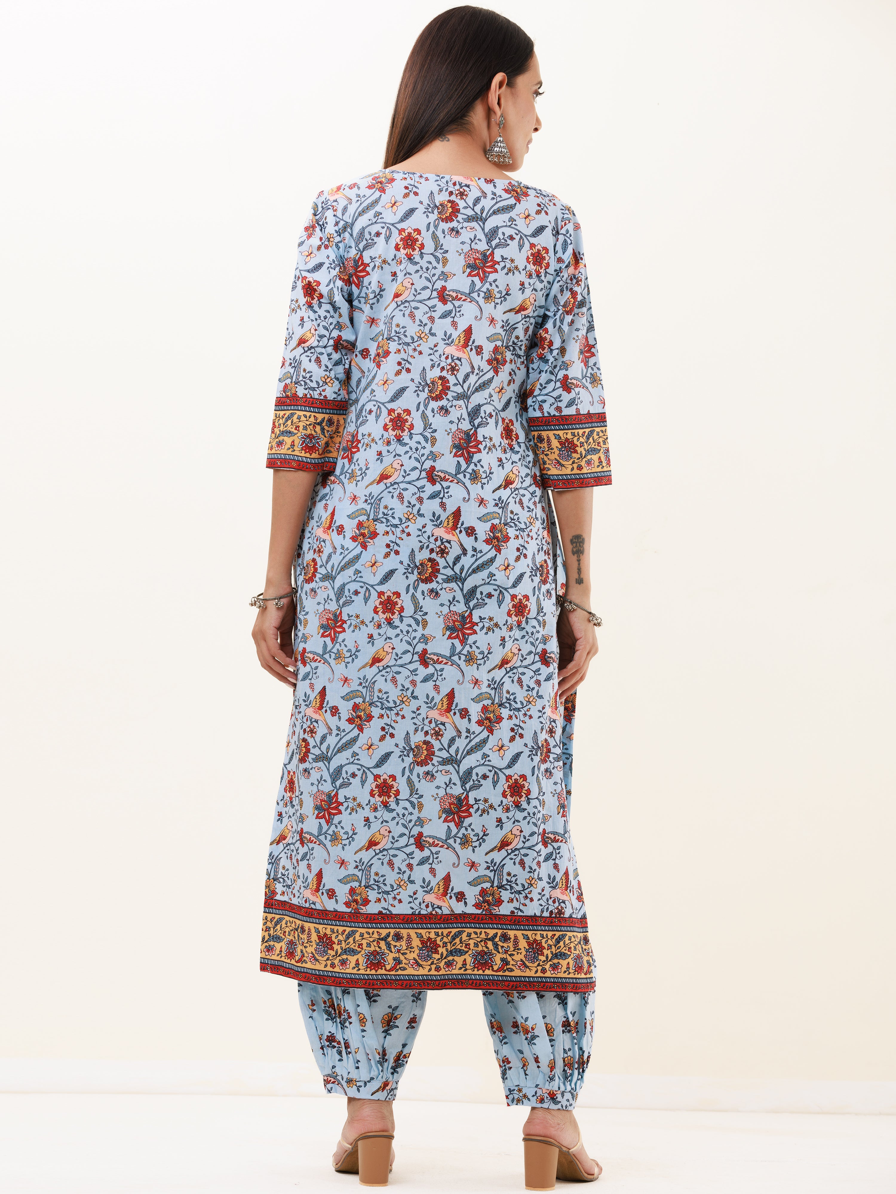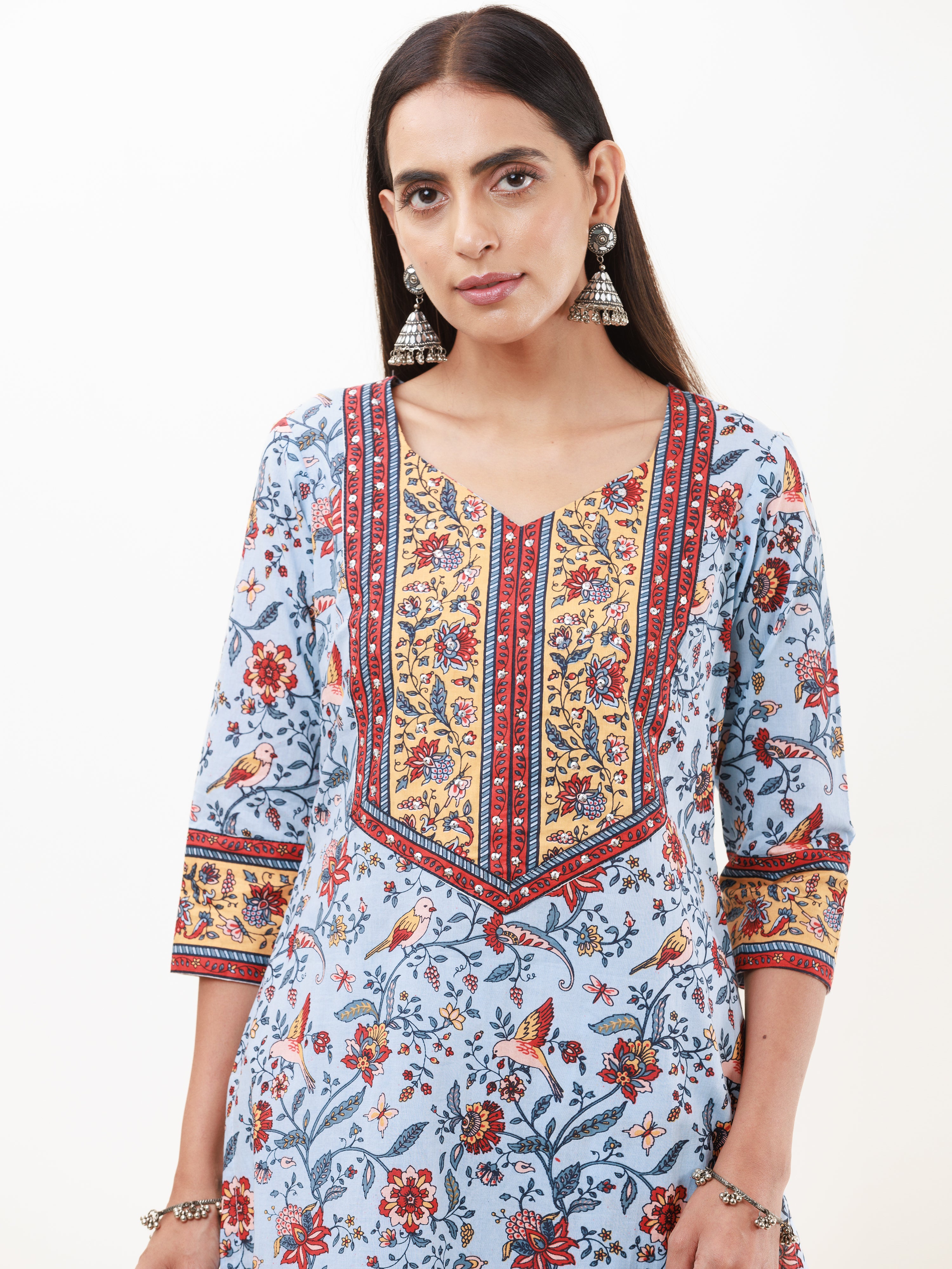 Product: This set contains Handcrafted Sanganeri Premium Cotton Kurta, 100% Cotton Pants and Kota Doria Dupatta.