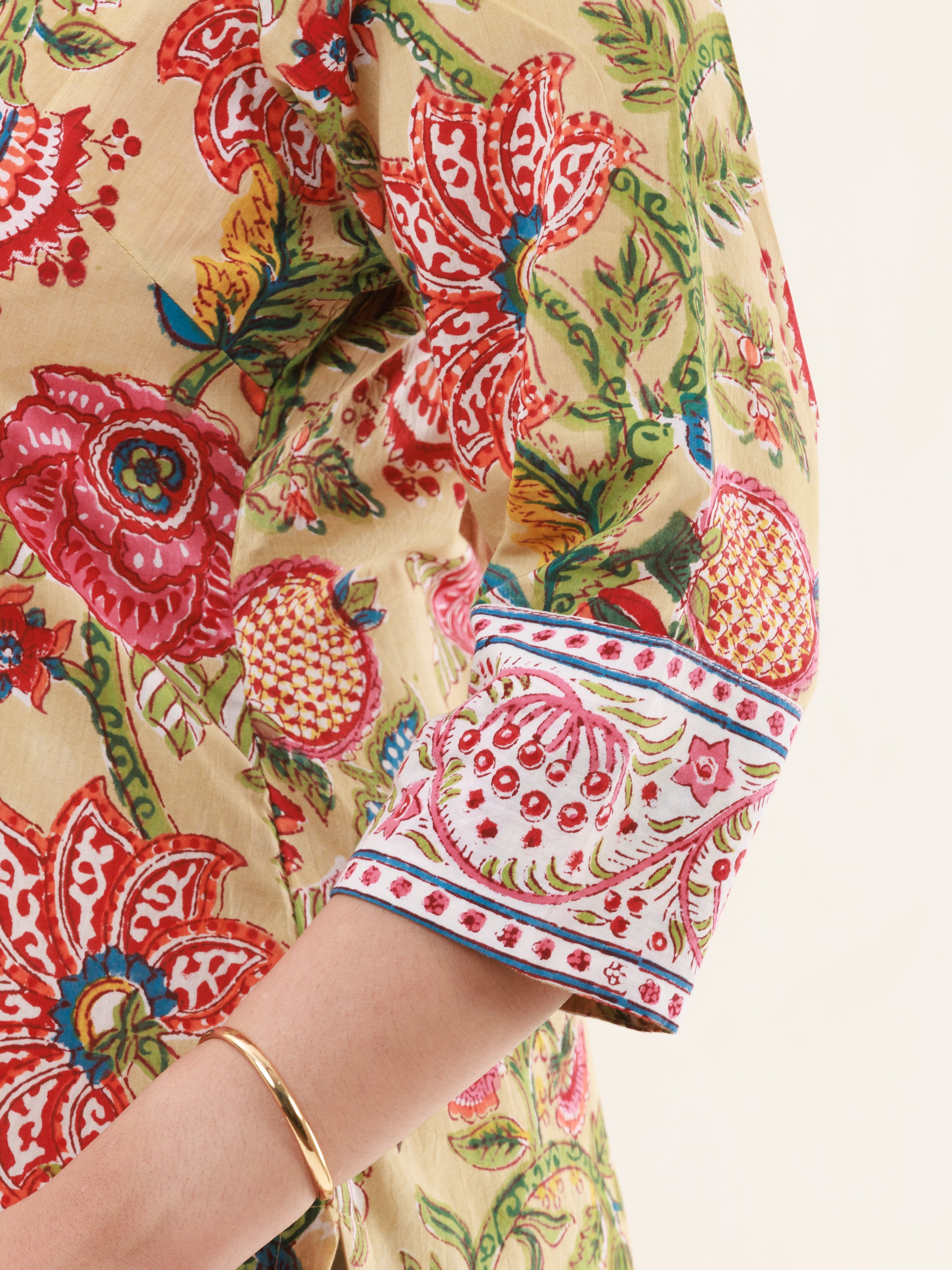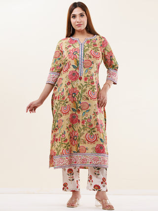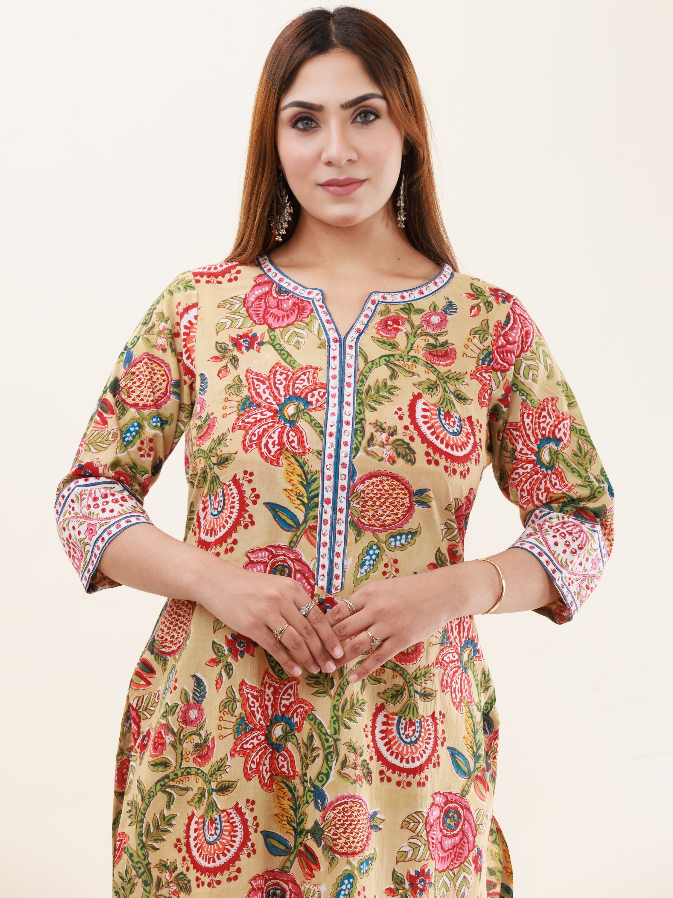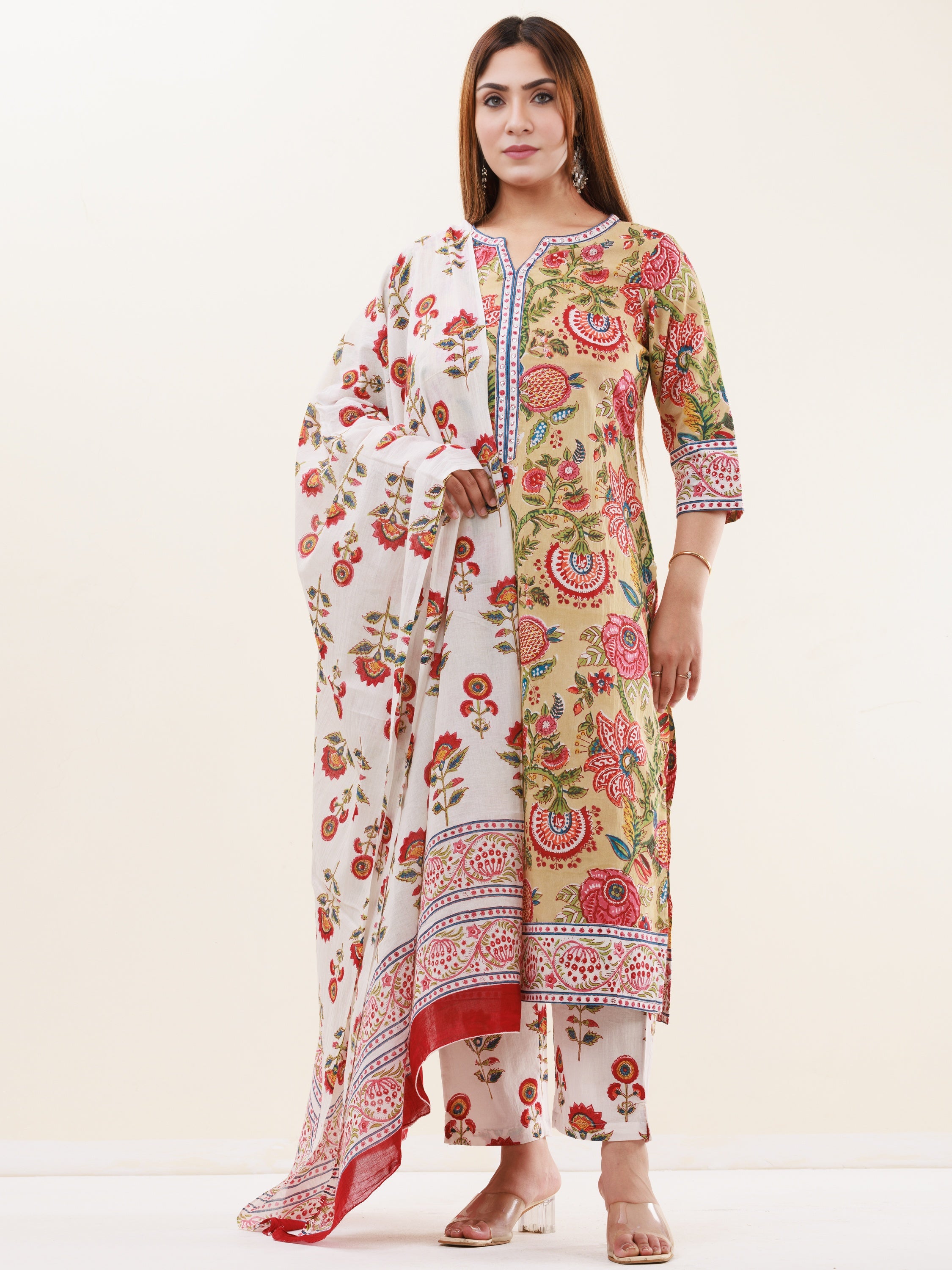 Product: This set contains Handcrafted Sanganeri Premium Cotton Kurta, 100% Cotton Pants and Cotton Mul Mul Dupatta.