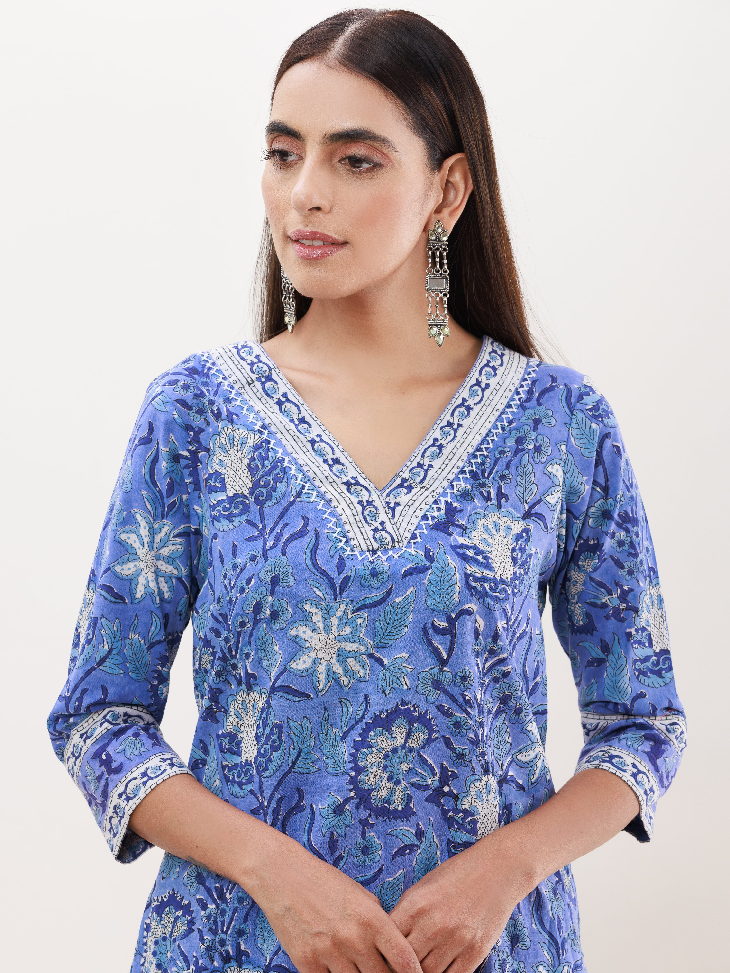 Product: This set contains Handcrafted Sanganeri Premium Cotton Kurta, 100% Cotton Pants and Cotton Mulmul Dupatta.