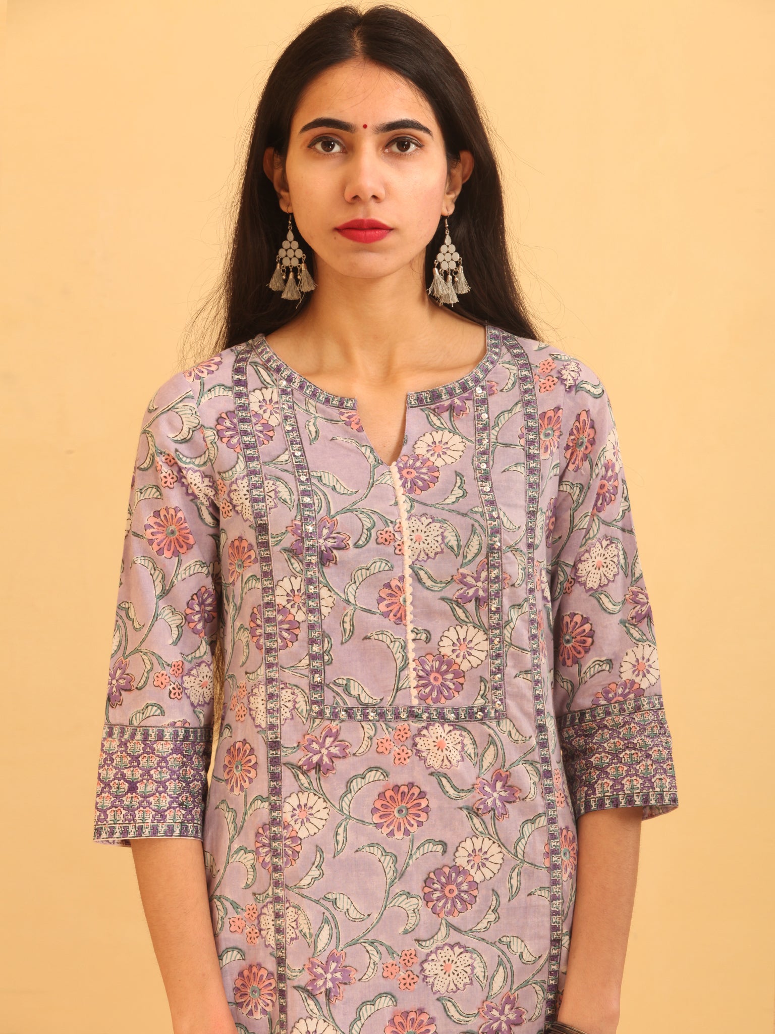 Product: This set contains Handcrafted Sanganeri Premium Cotton Kurta, 100% Cotton Pants and Kota Doria Dupatta.