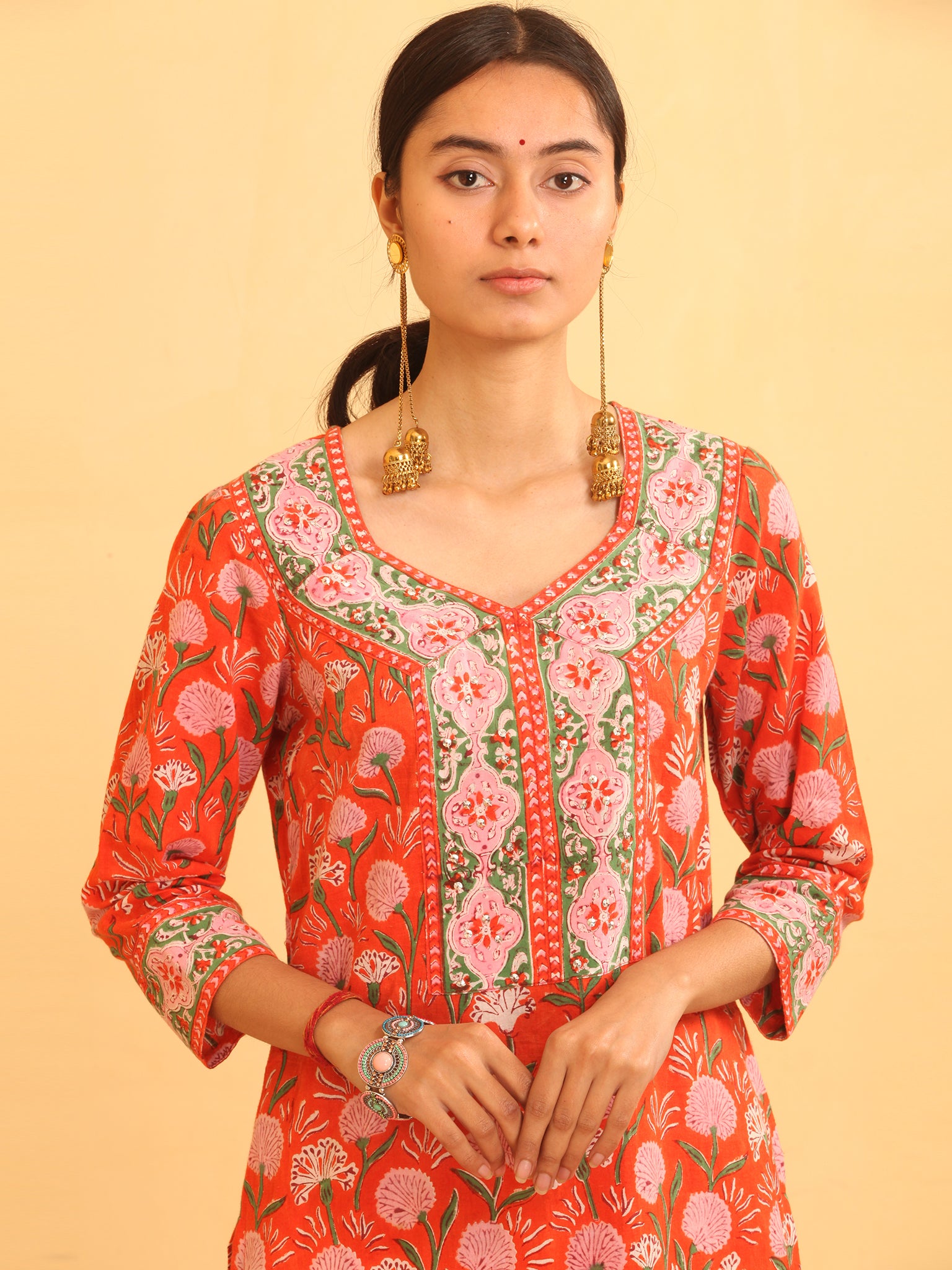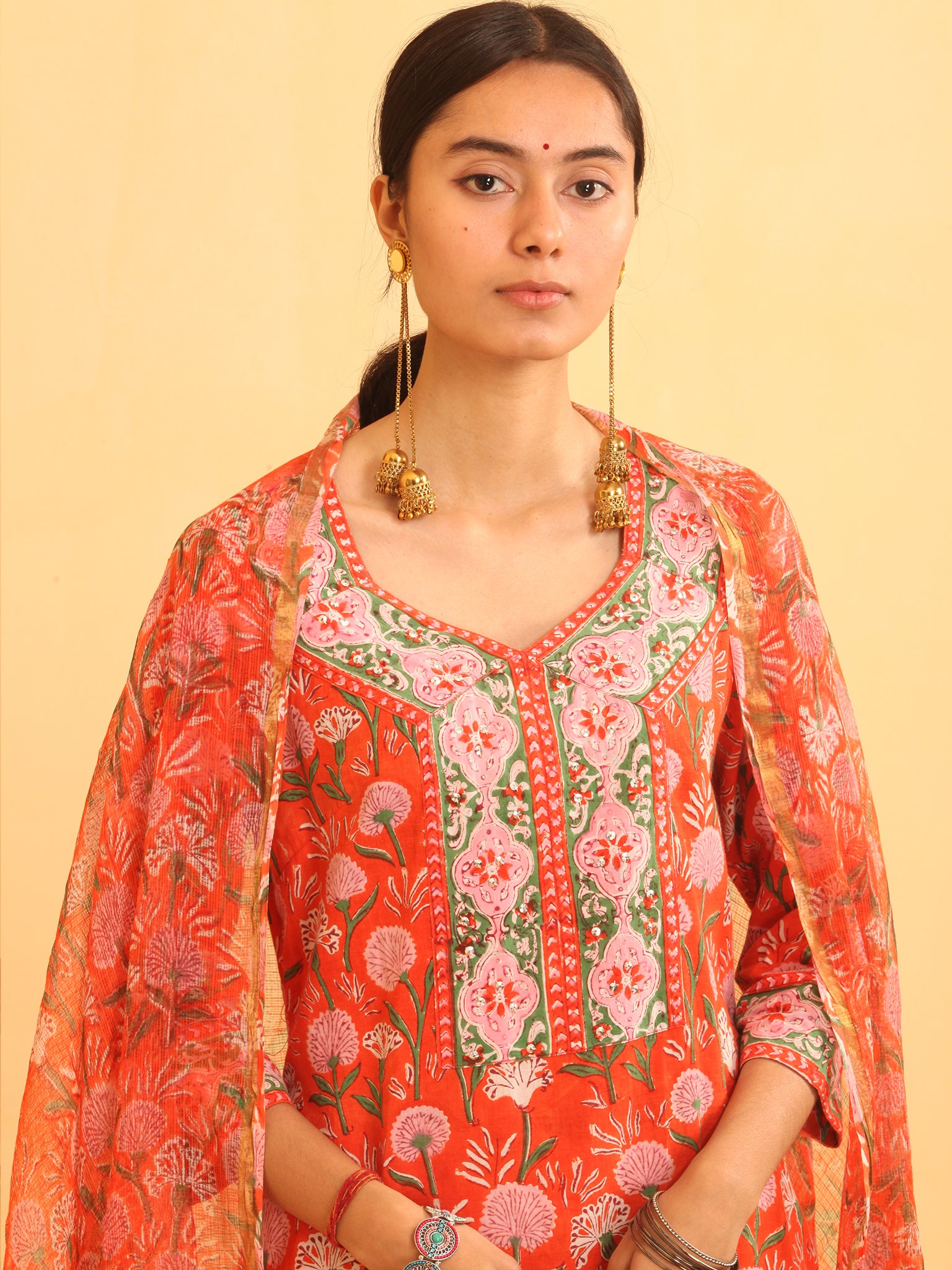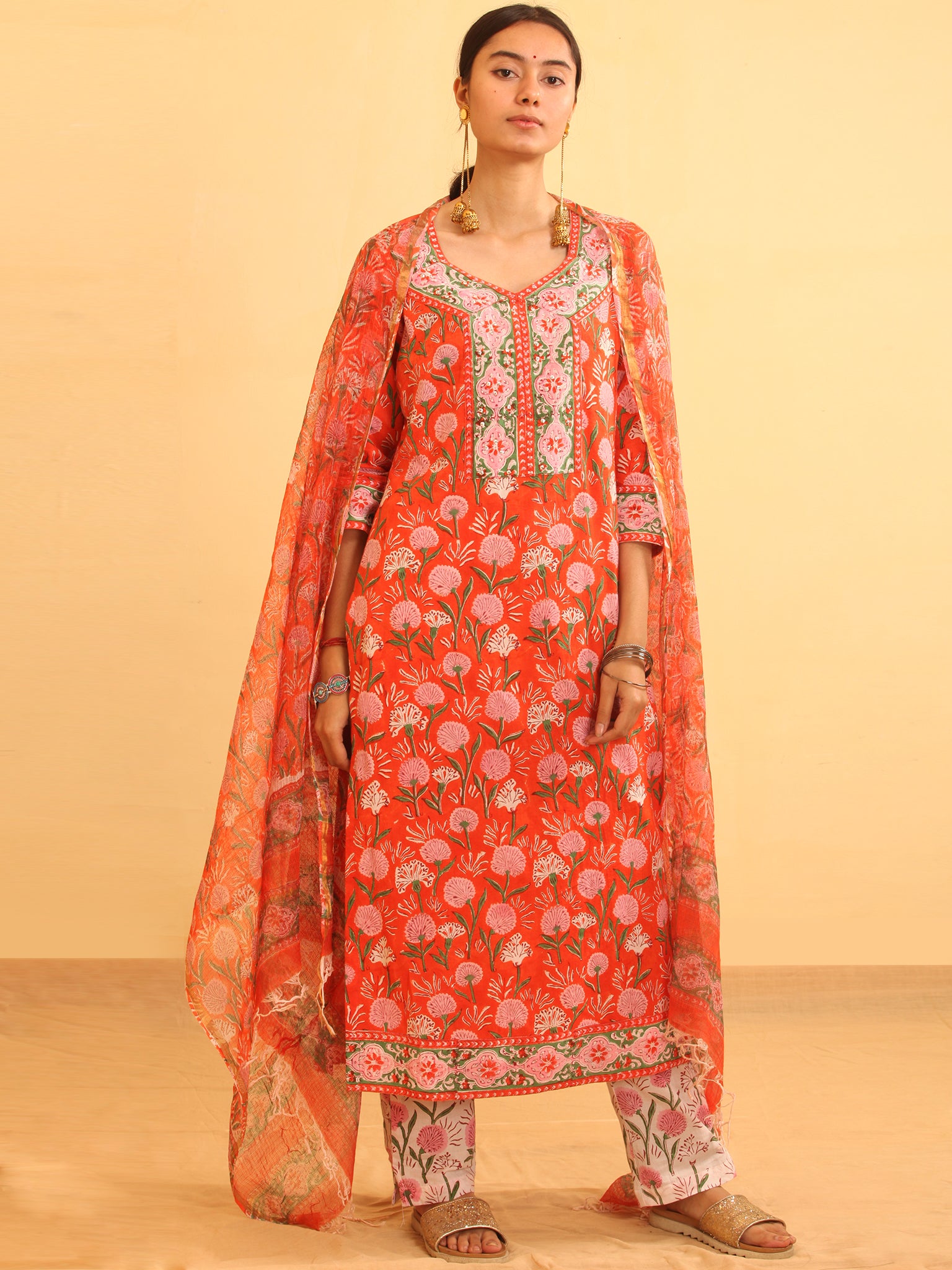 Product: This set contains Handcrafted Sanganeri Premium Cotton Kurta, 100% Cotton Pants and Kota Doria Dupatta.