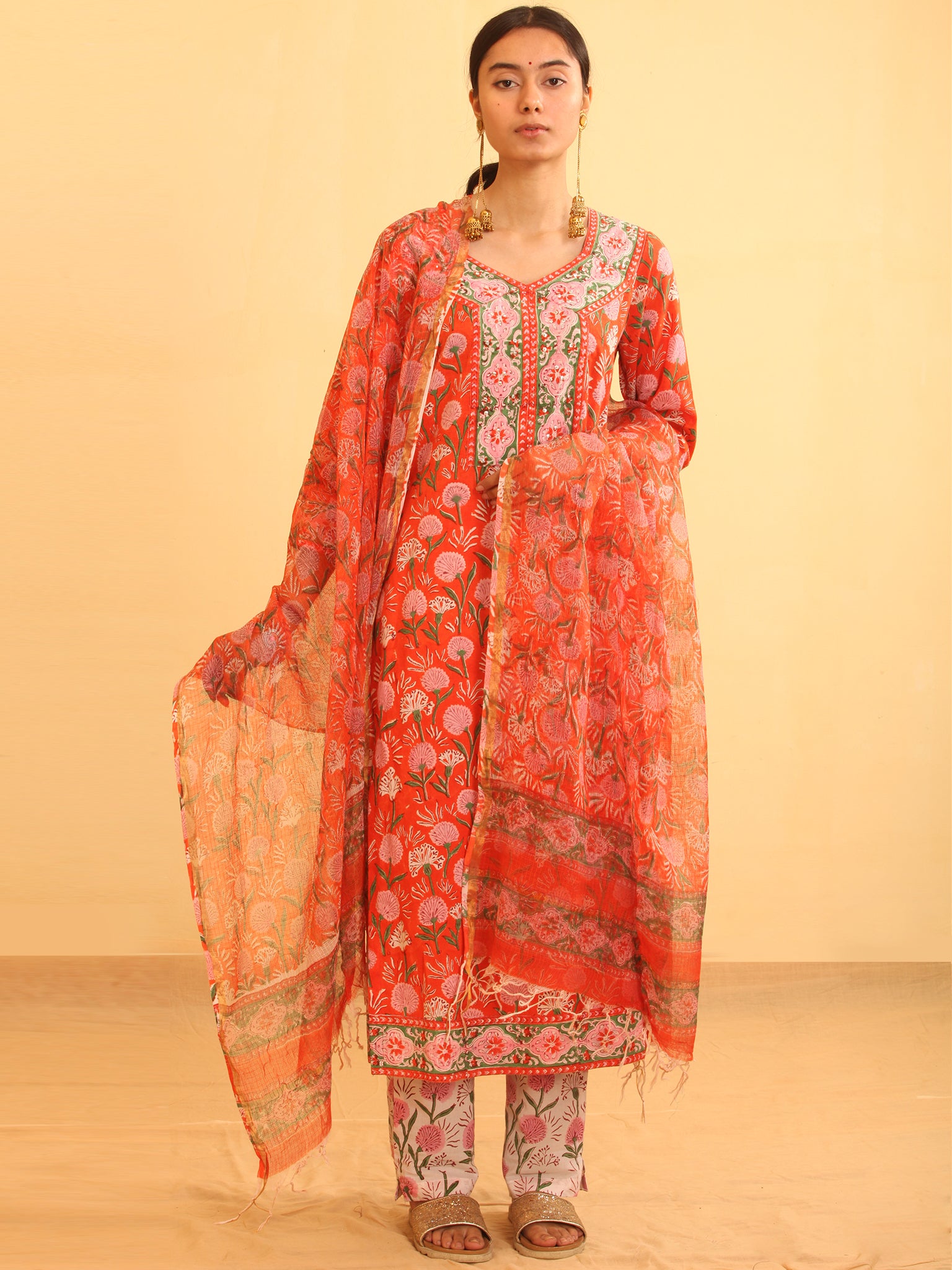 Fabric : Hand Block Printed. Kurta - Cotton. Pants - Cotton, Dupatta - Kota Doria