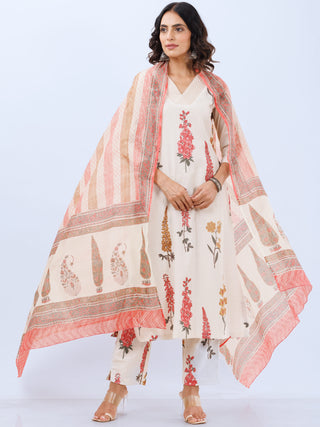Roz Sneh Set Of Kali Kurta Pants Kota Doria Dupatta