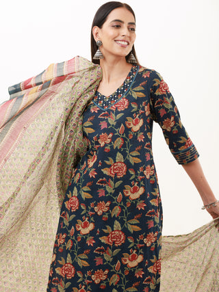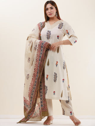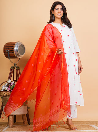 Roz Sarah Set Of Cotton Linen Kurta Pants Dupatta