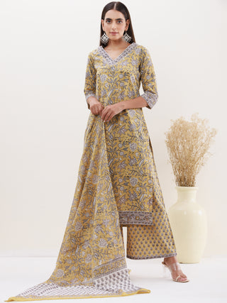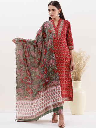 Roz Muskaan Set Of Cotton Slub Kurta Pants Kota Doria Dupatta