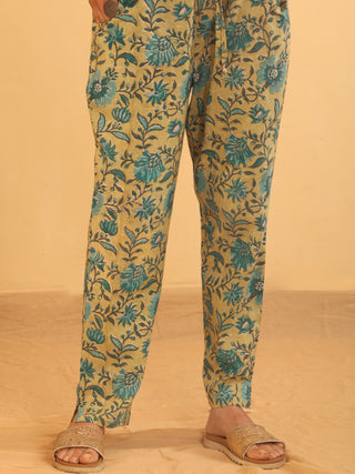Green Yellow Maroon Ajrakh Hand Block Printed Semi Elasticated Waist Pleated Cotton Palazzo - P11F1690