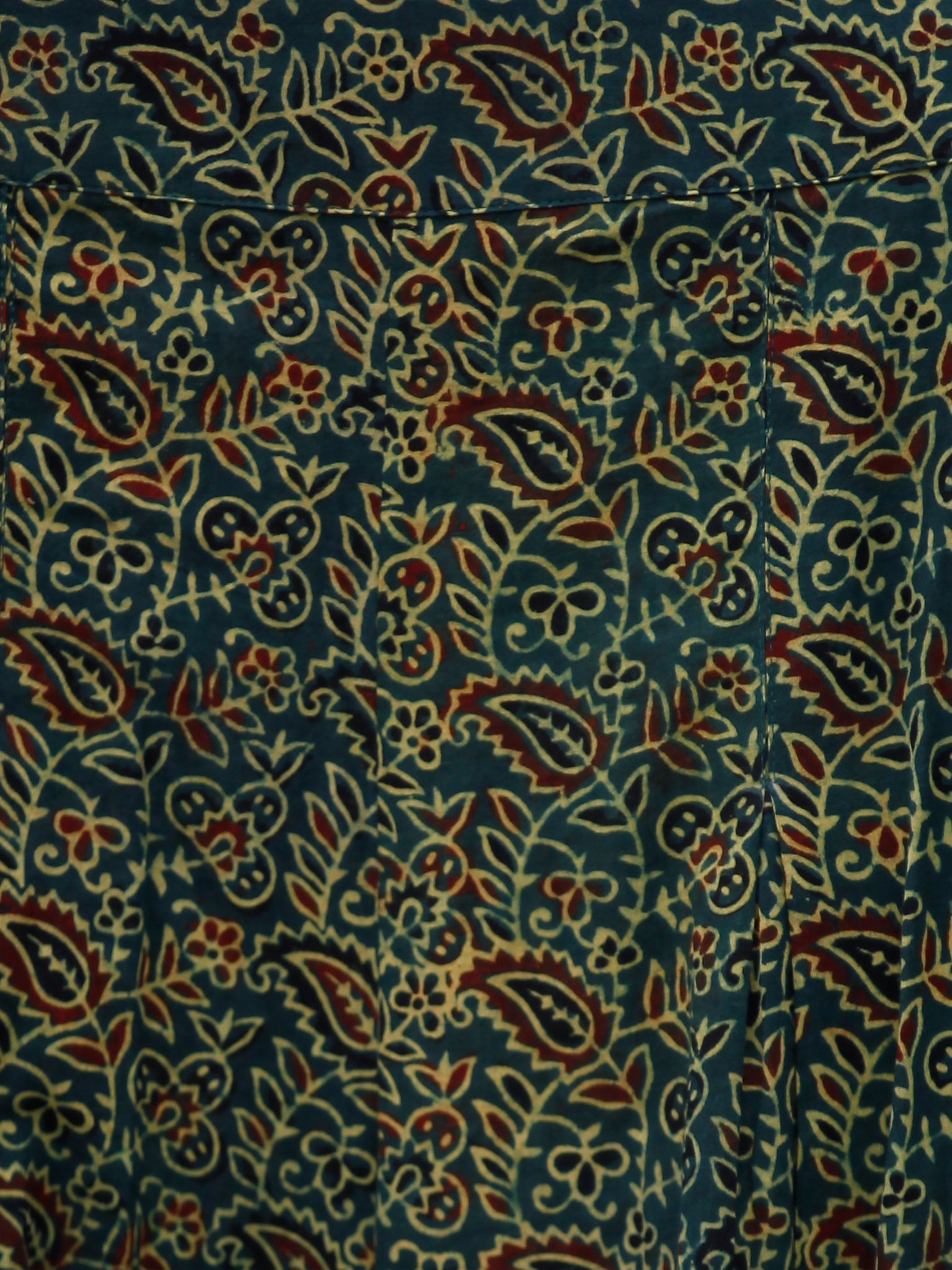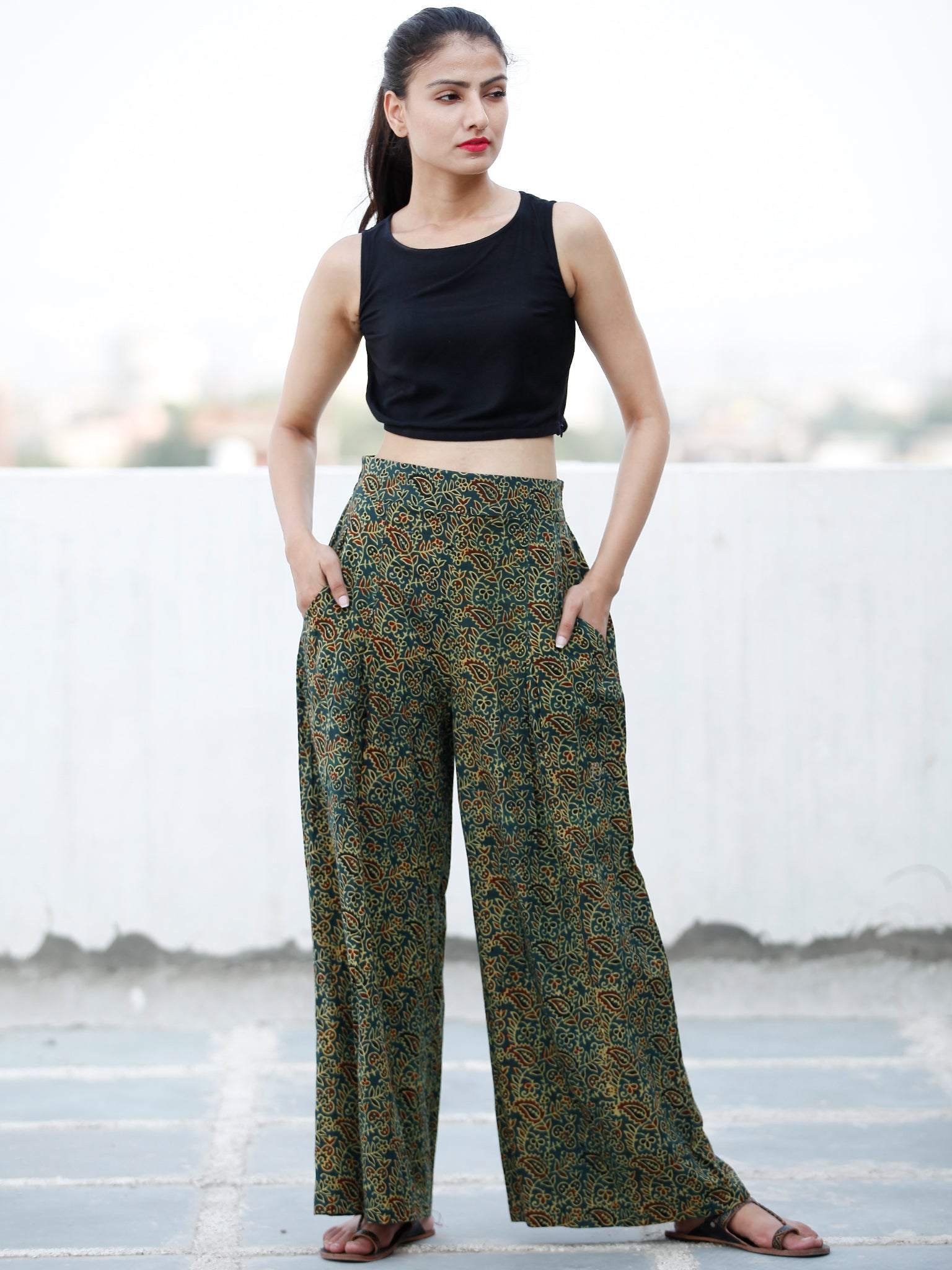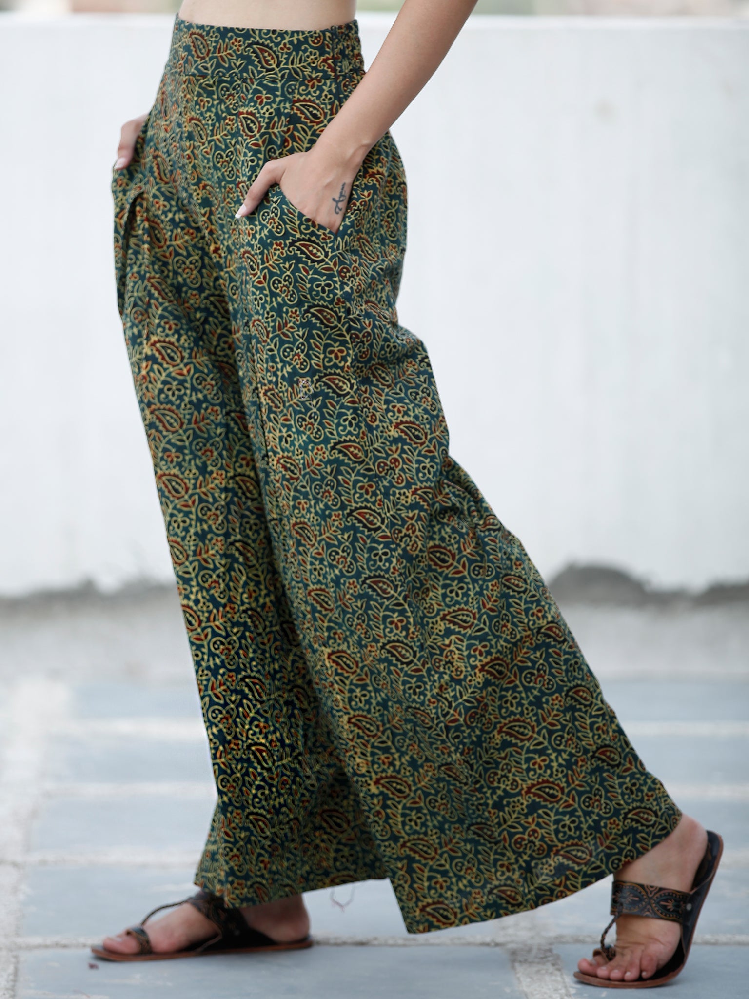 Green Yellow Maroon Ajrakh Hand Block Printed Semi Elasticated Waist Pleated Cotton Palazzo - P11F1690