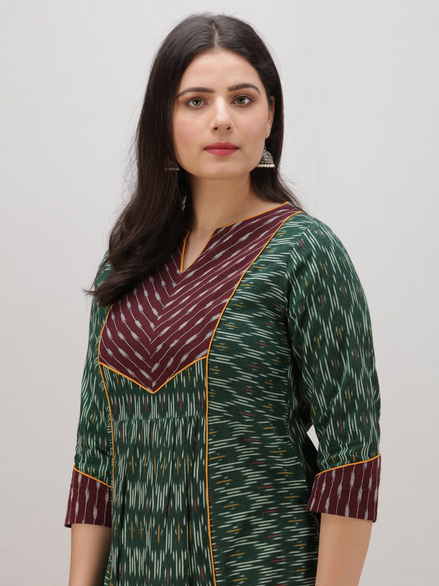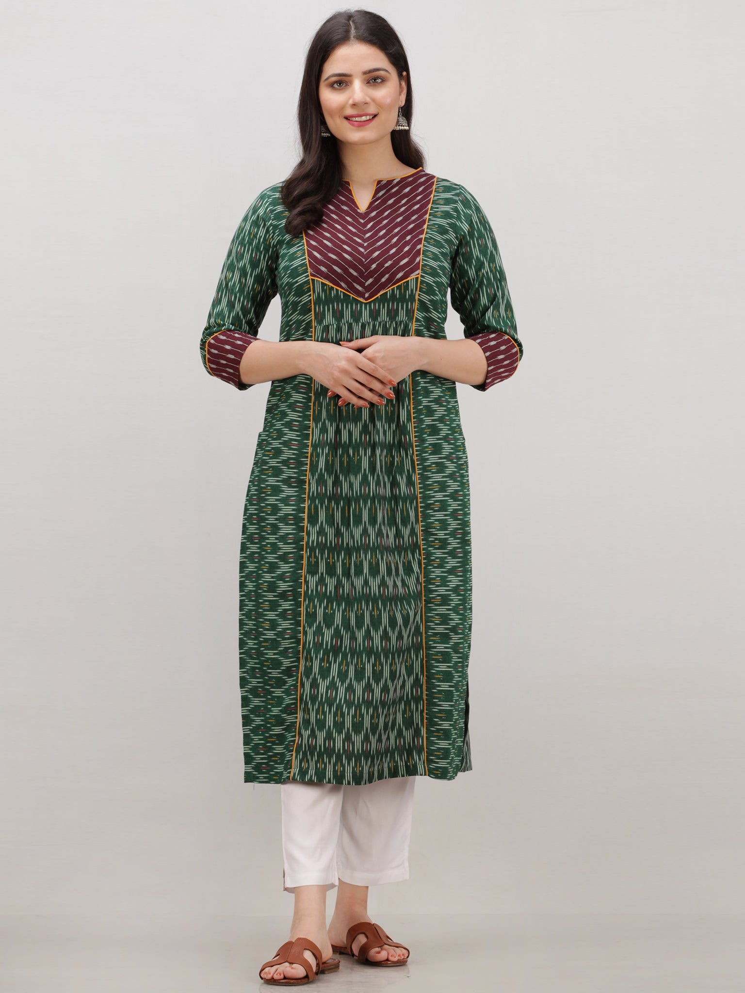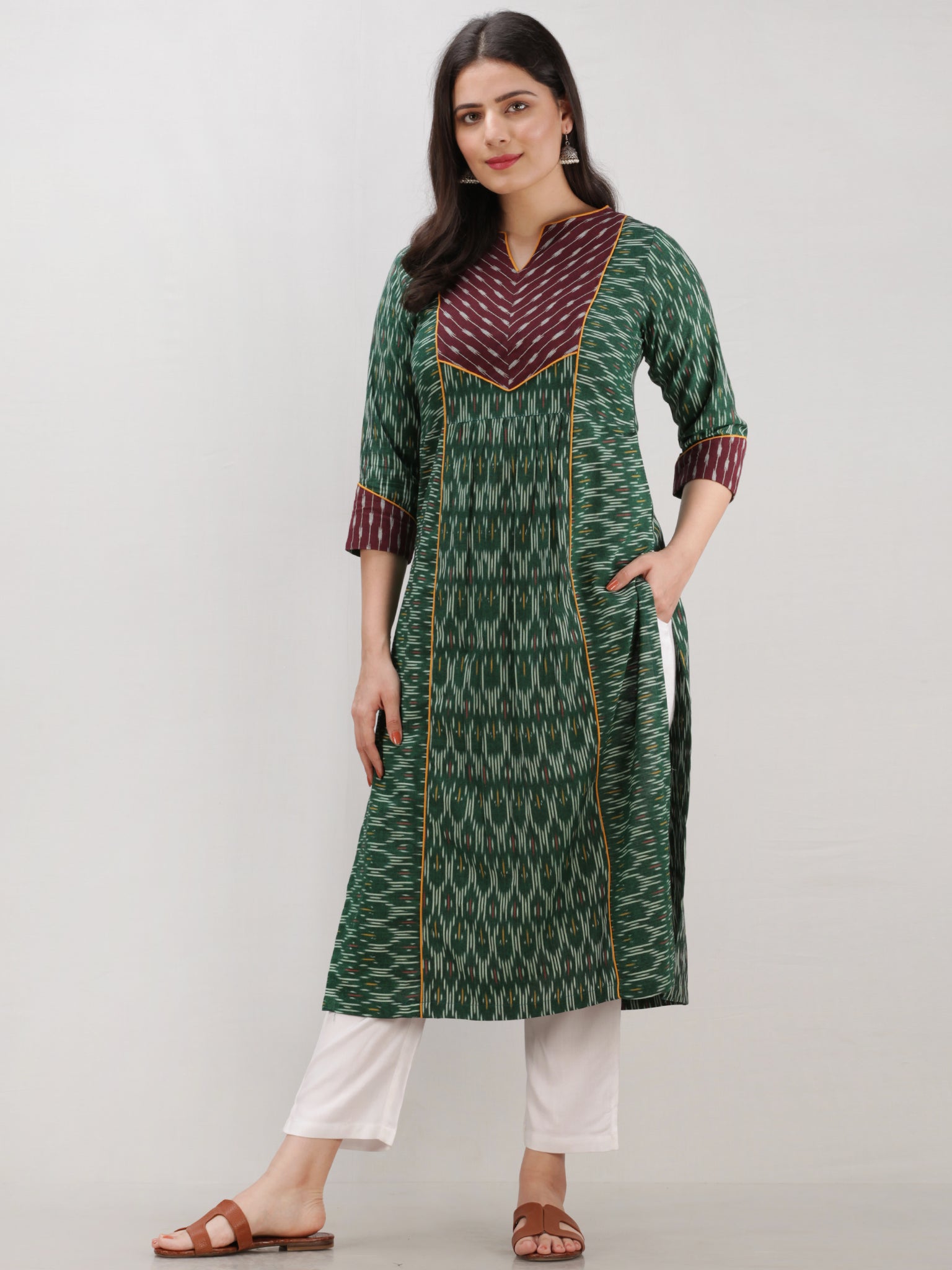 PRODUCT: This Set Contains Ikat Cotton Kurta, Cotton Rayon Elasticated Pants