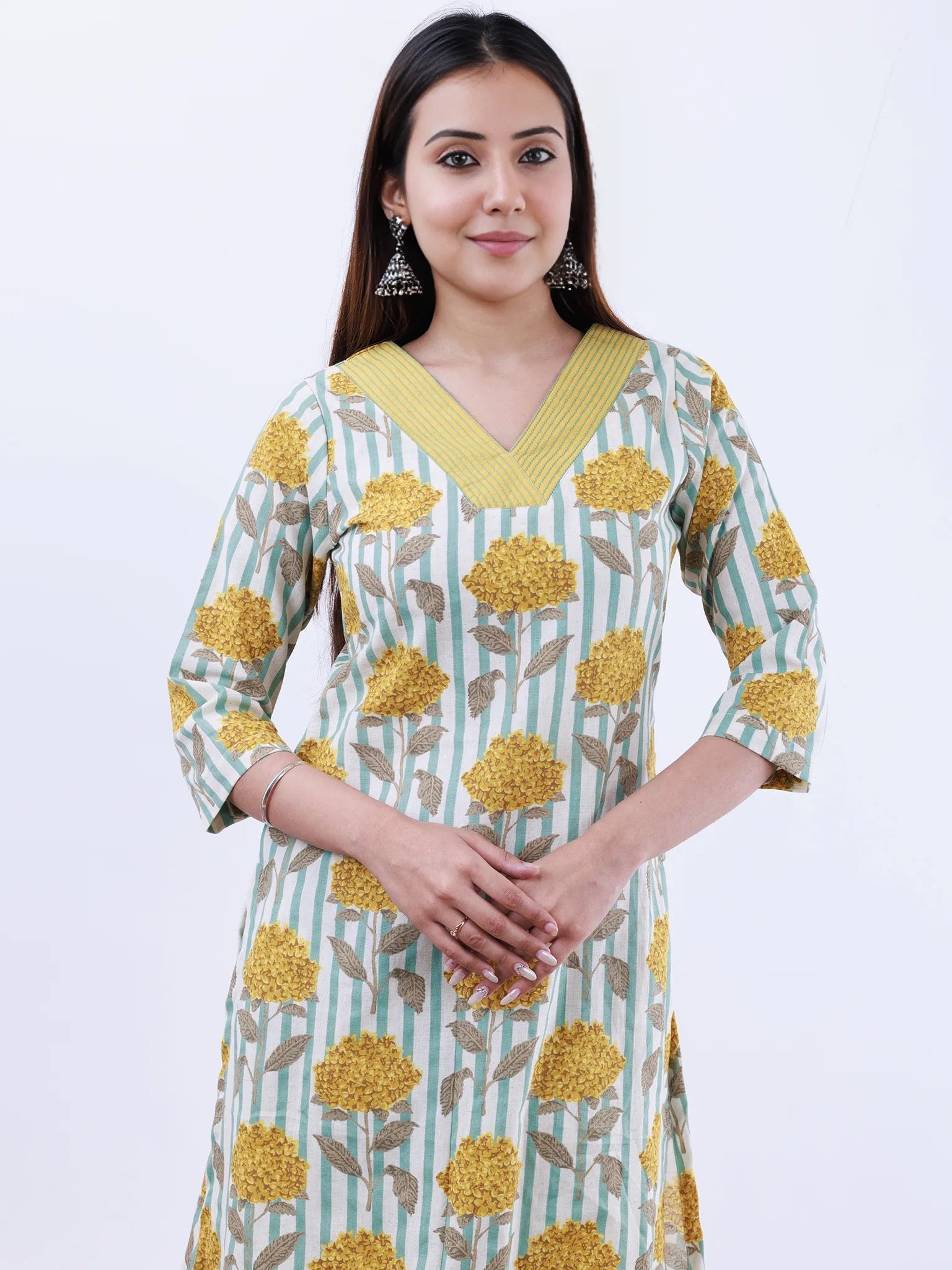 Product: Contains Hand Block Printed Cotton Linen Kurta. Matching Pants/Bottoms and Dupatta are also available separately under BUY THE LOOK section.