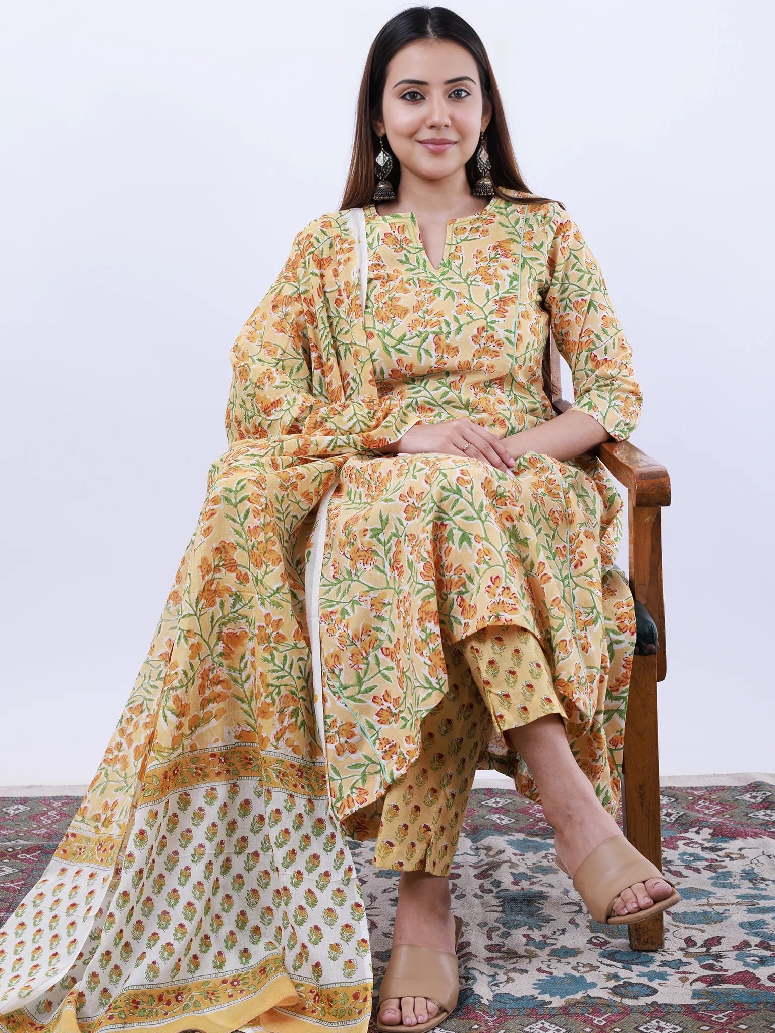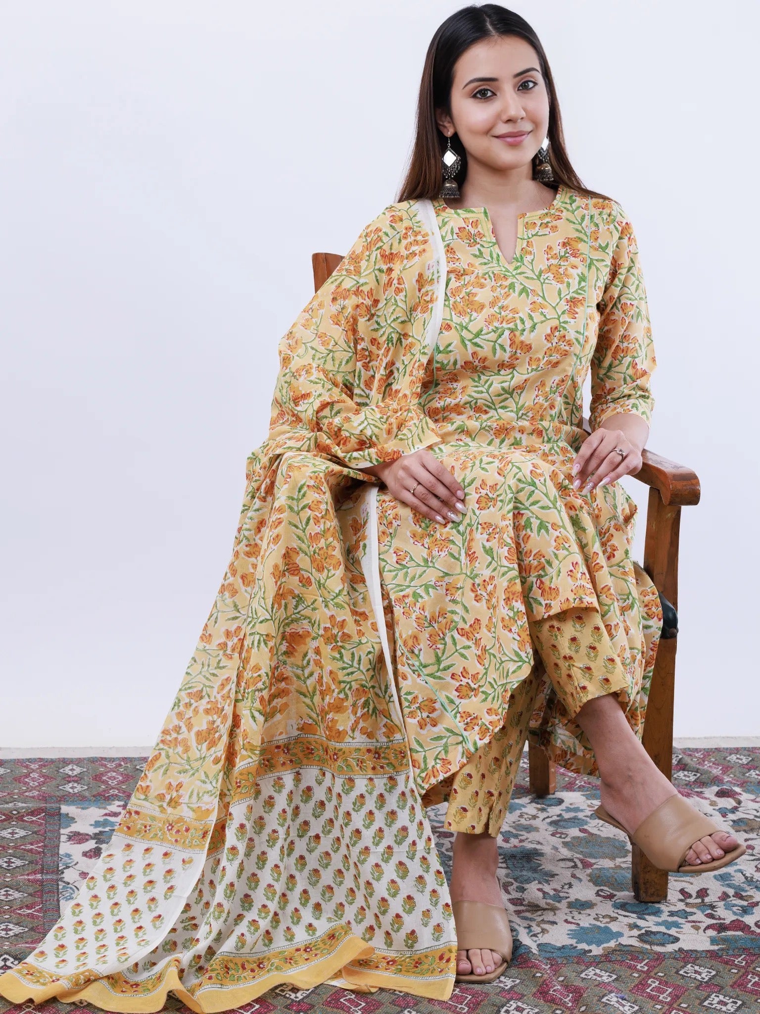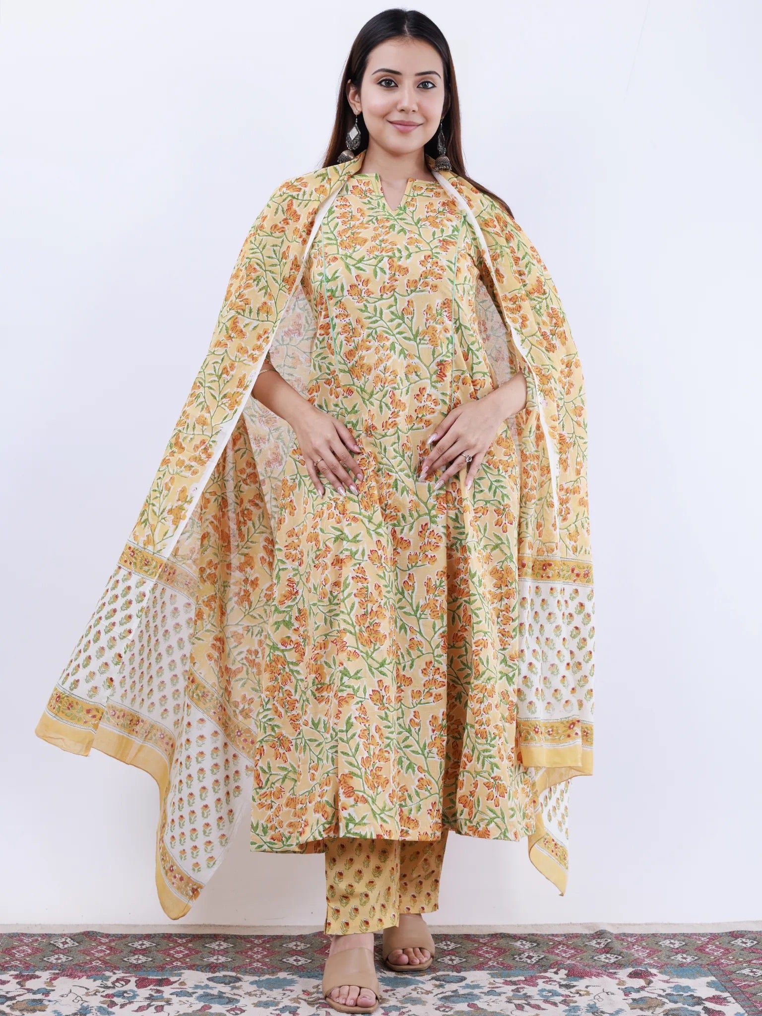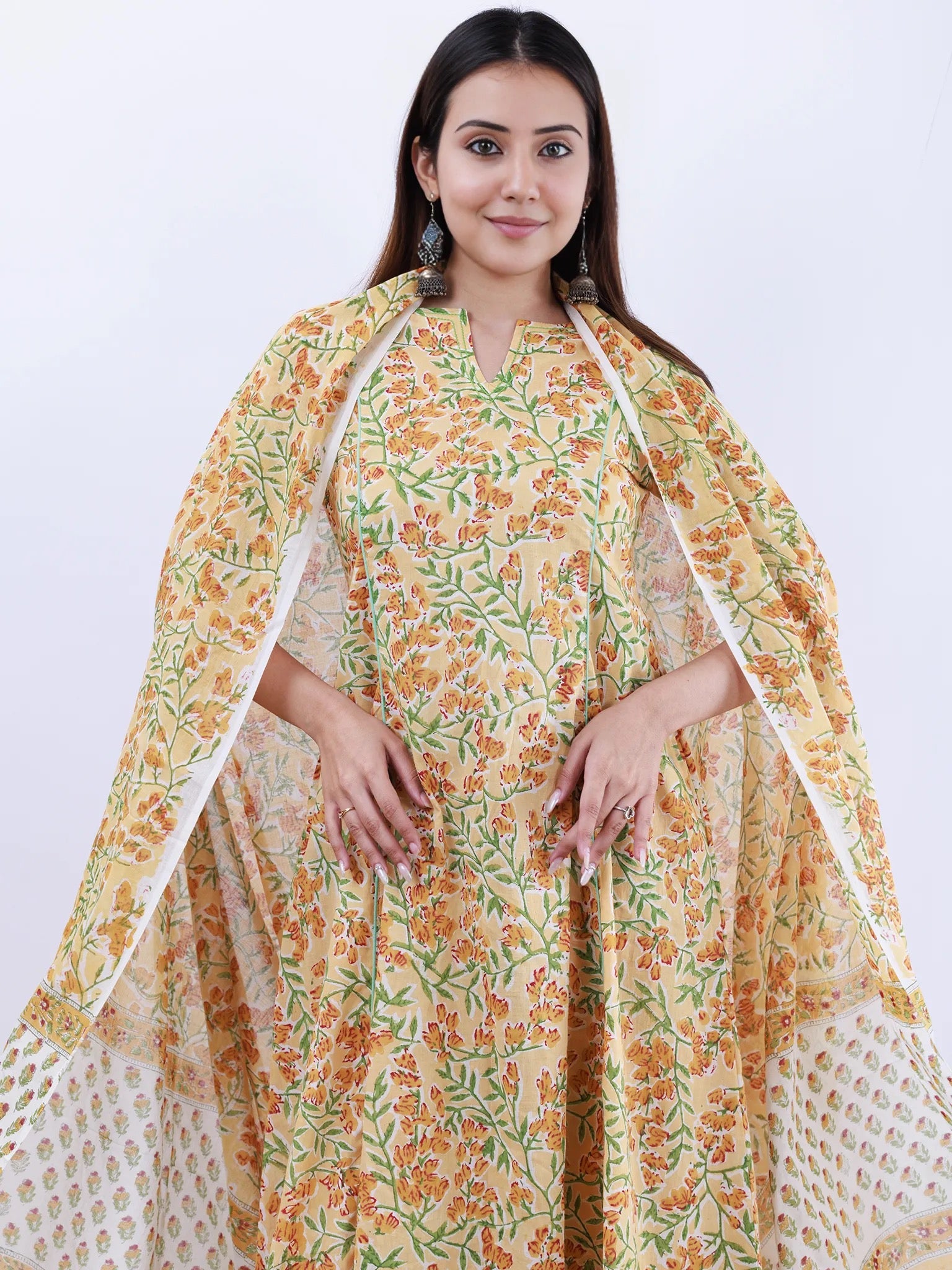 Product: This set contains Hand Block Printed Premium Cotton Kurta, 100% Cotton Pants and Cotton Dupatta.