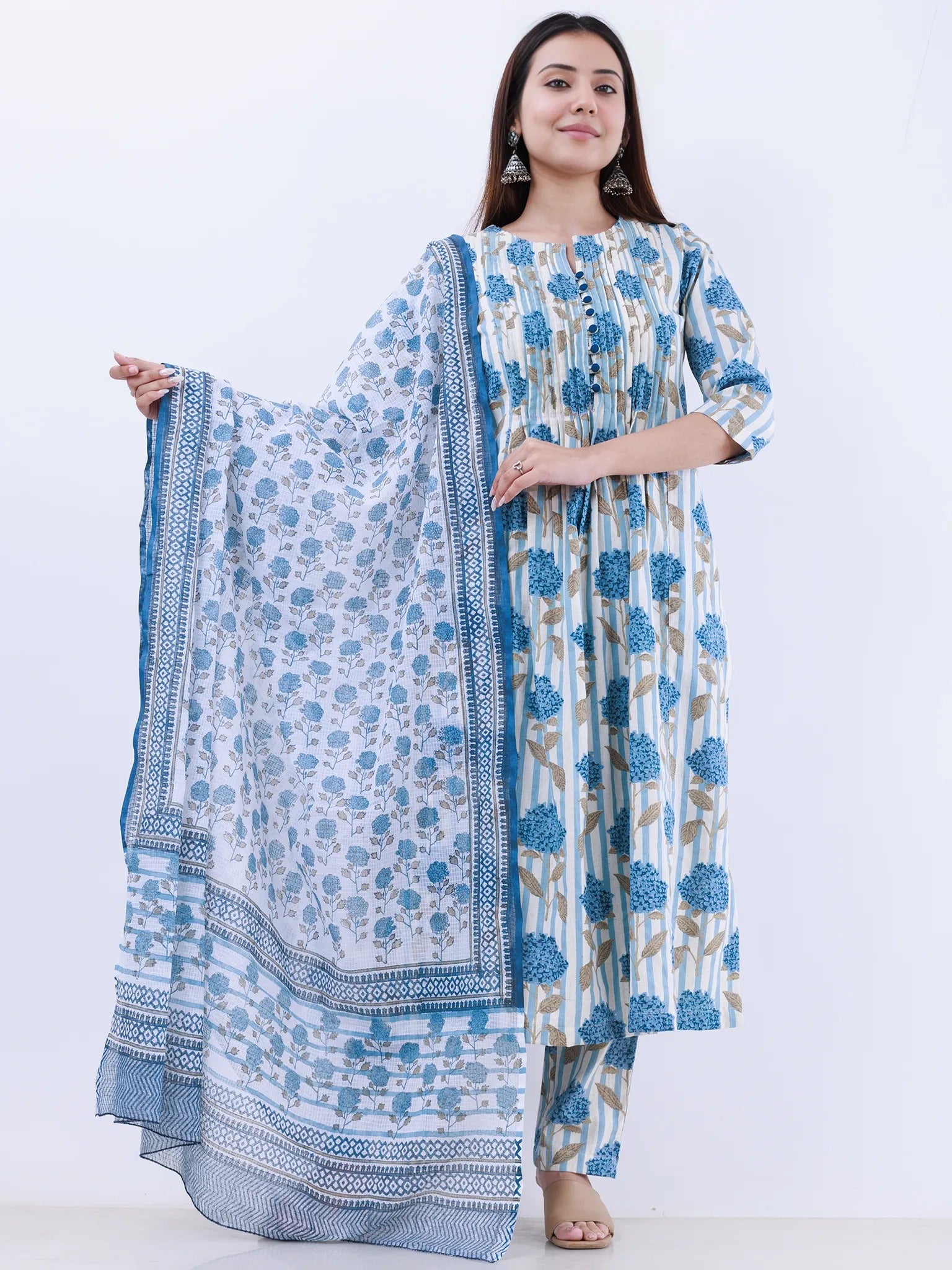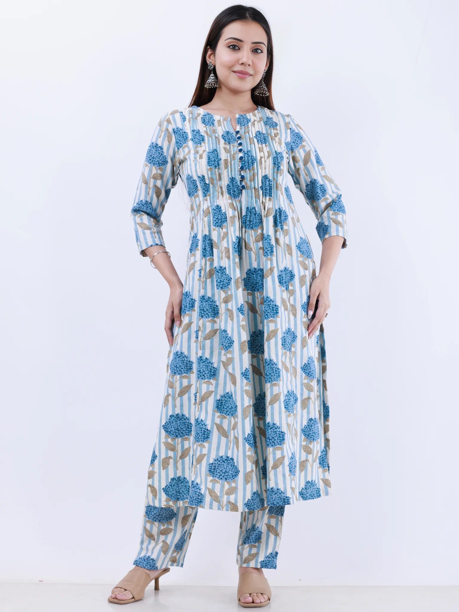 Product: This set contains Handcrafted Sanganeri Premium Cotton Linen Kurta, Cotton Linen Pants and Kota Doria Dupatta.