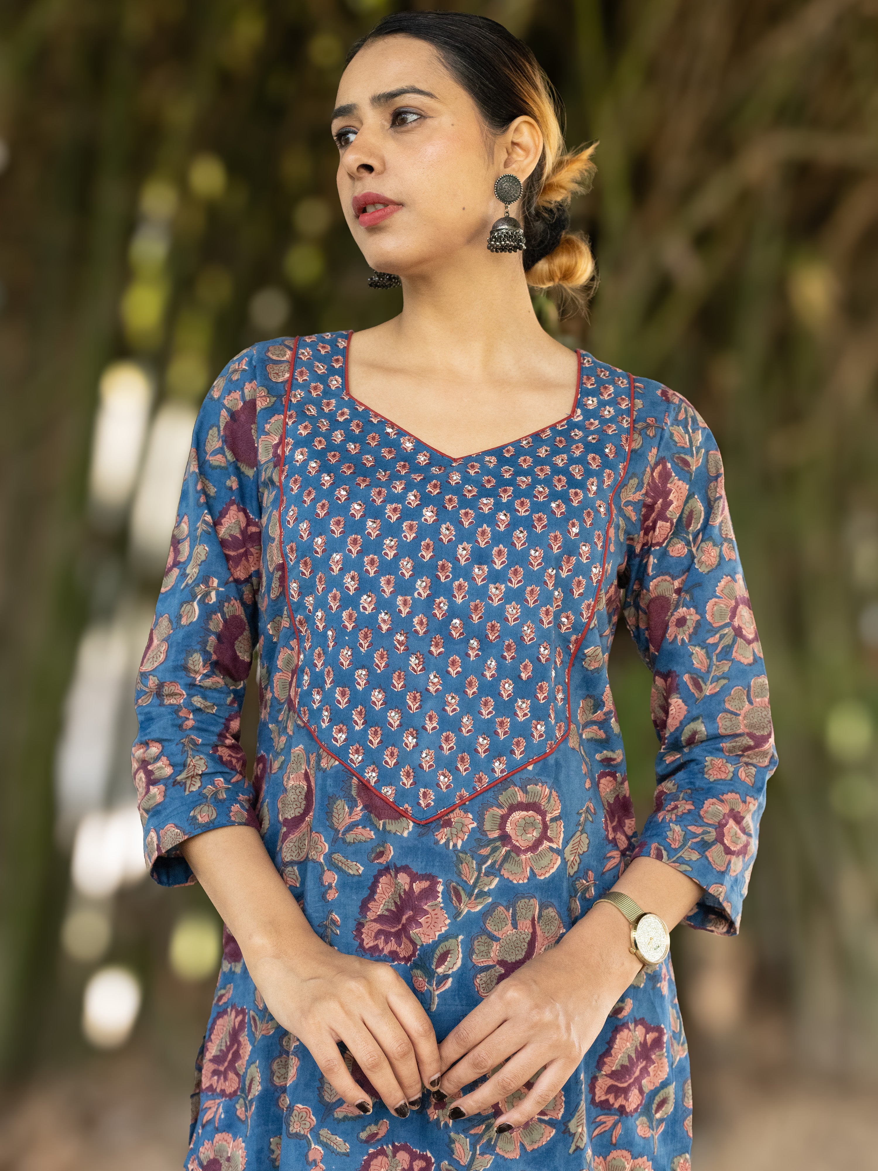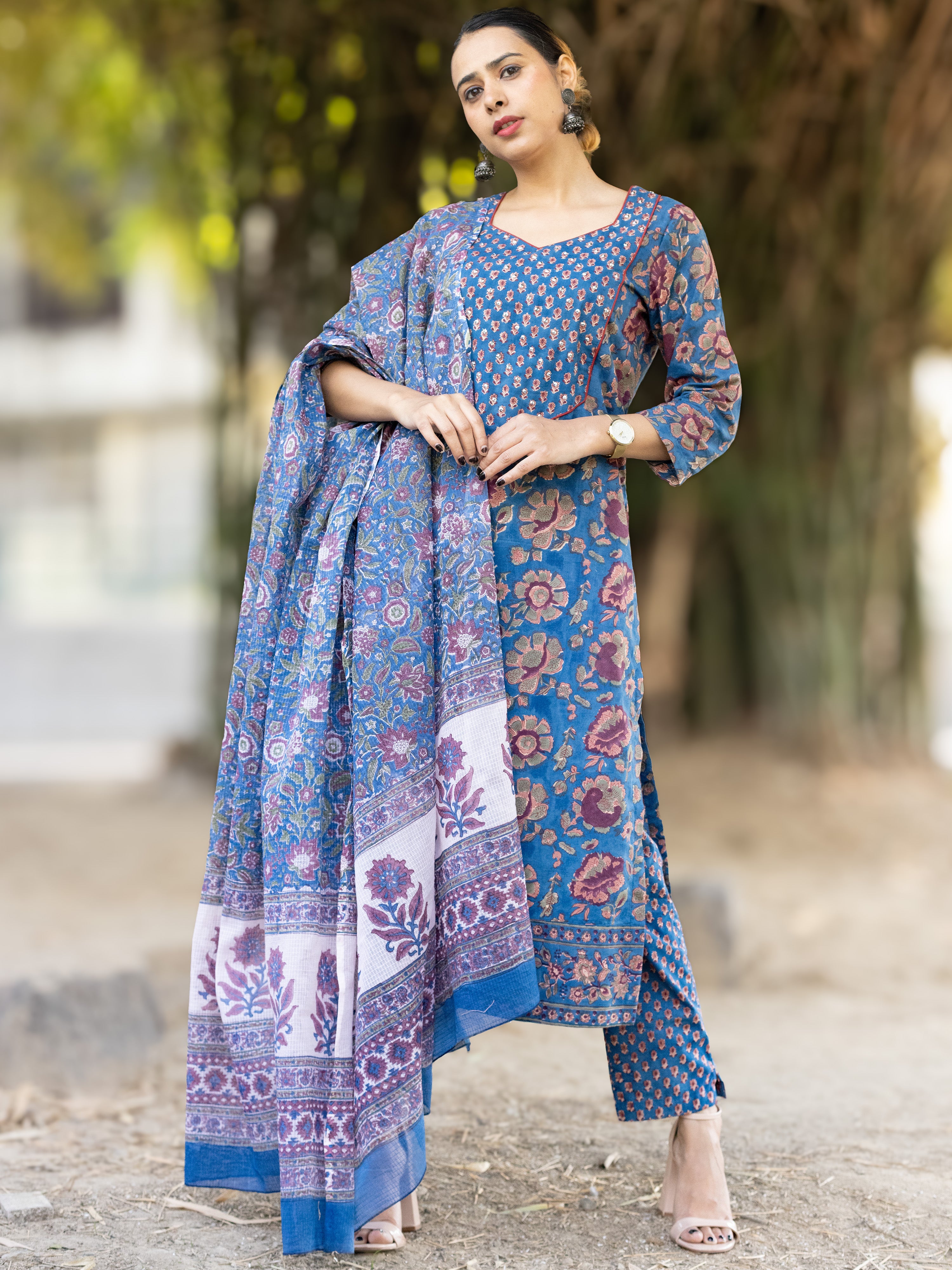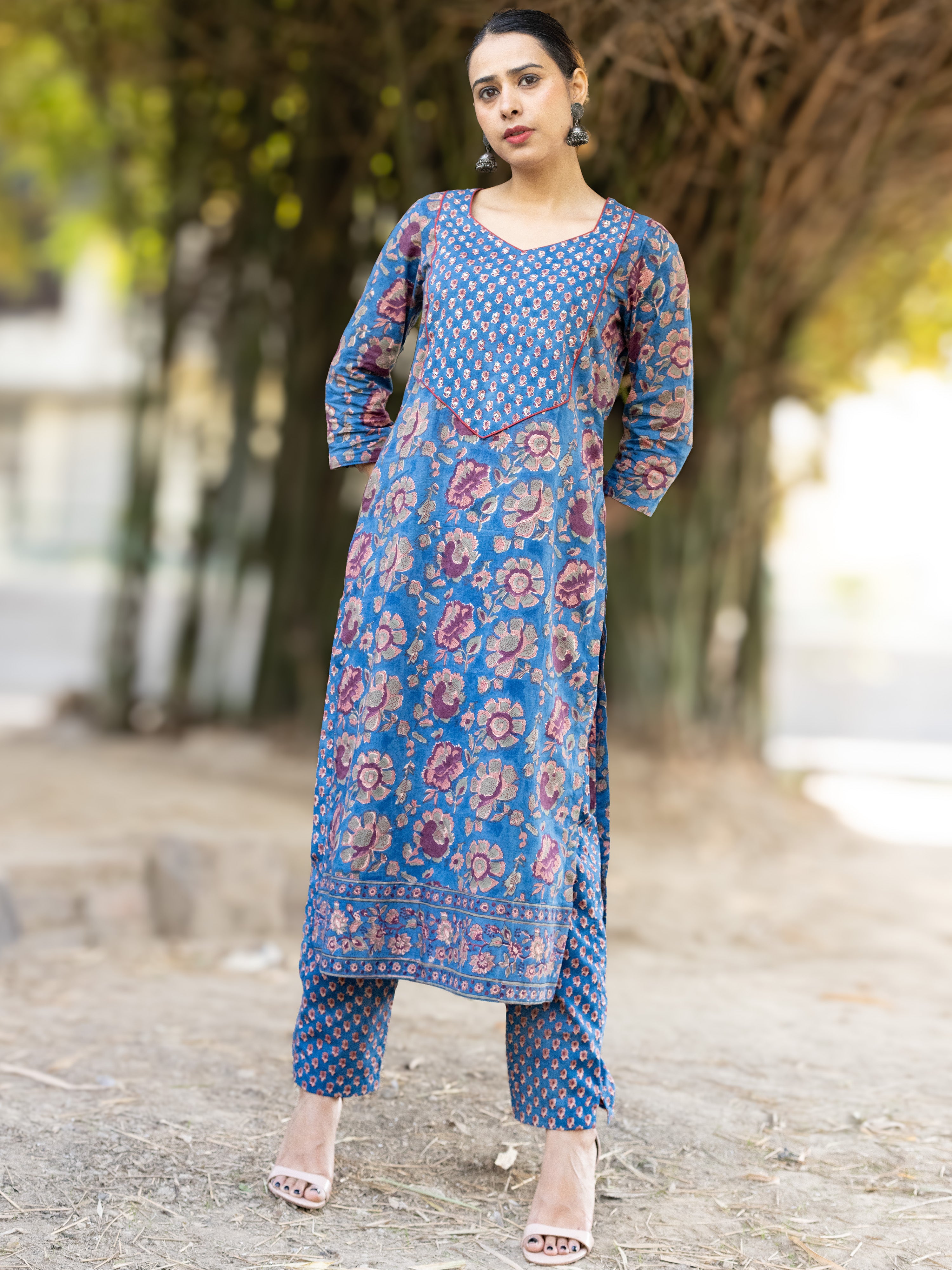 Product: This set contains Handcrafted Sanganeri Premium Cotton Kurta, 100% Cotton Pants and Kota Doria Dupatta.