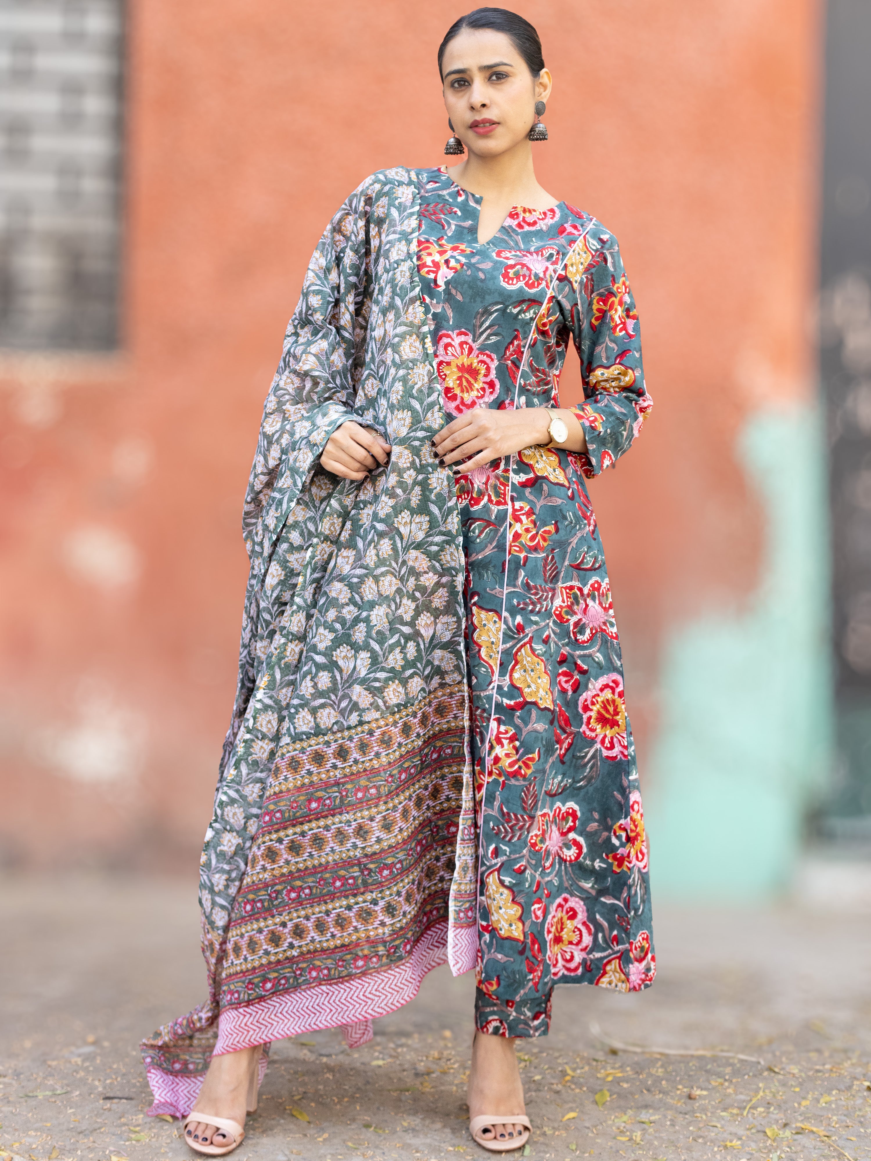 Fabric : Hand Block Printed. Kurta - Cotton . Pants - Cotton, Dupatta - Kota Doria