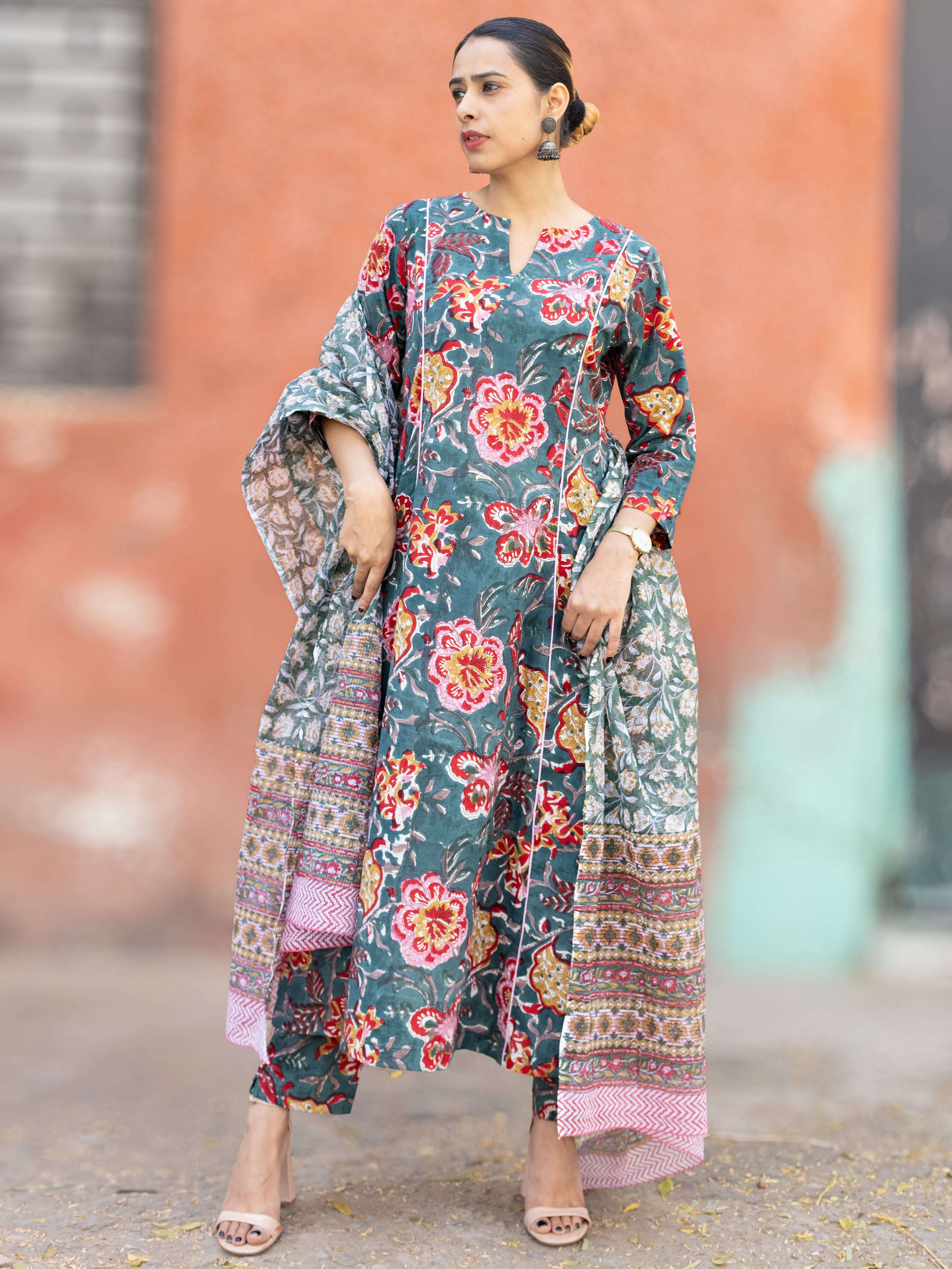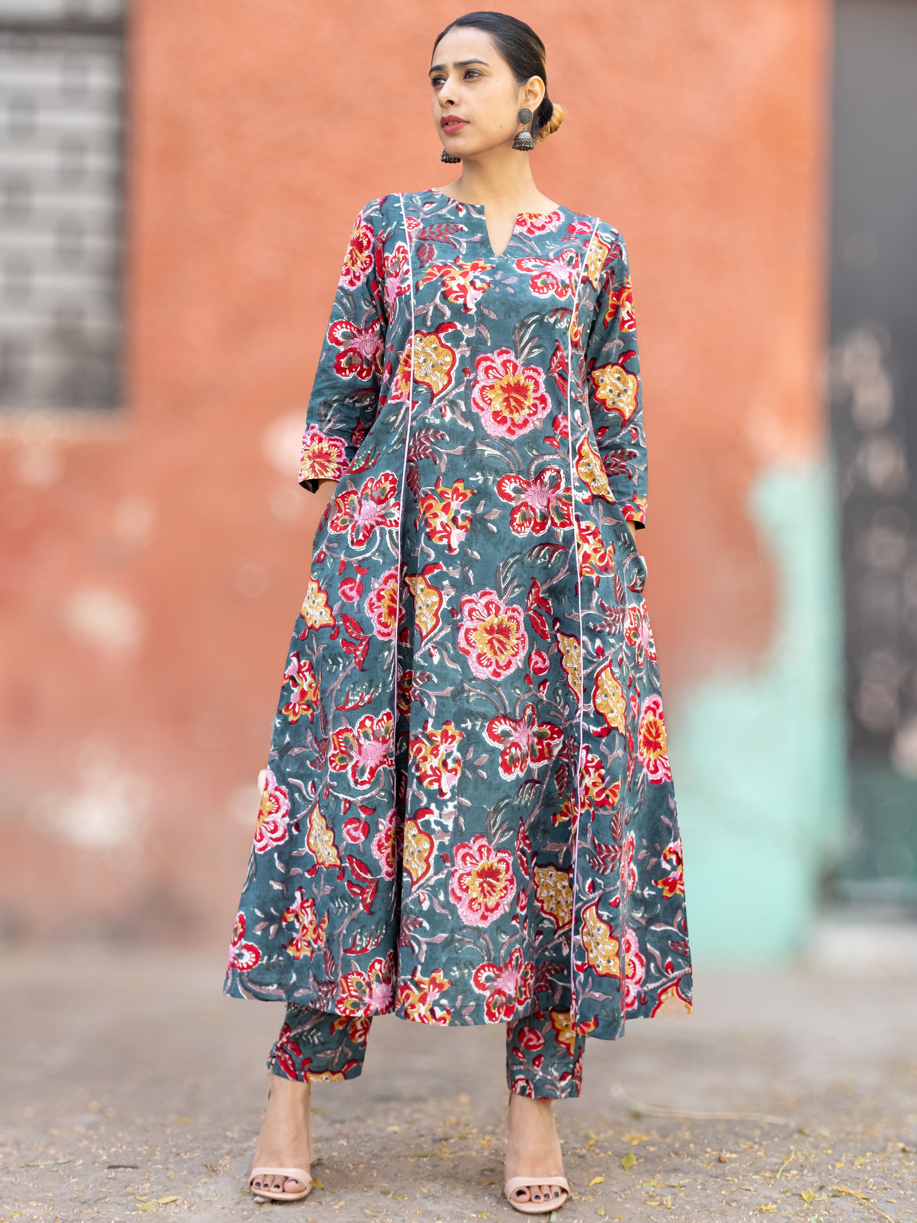 Product: This set contains Handcrafted Sanganeri Premium Cotton Kurta, 100% Cotton Pants and Kota Doria Dupatta.
